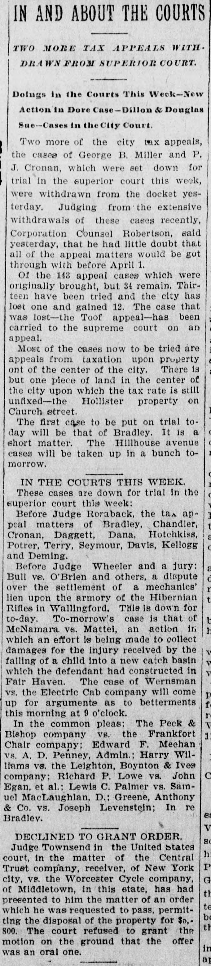 IN AND ABOUT THE COURTS TWO MORE TAX APPEALS WITH. DRAWN FROM SUPERIOR COURT. Doings in the Courts This Week-New Action in Dore Case-Dillon & Douglas Sue-Cases in the City Court. Two more of the city tax appeals, the cases of George B. Miller and P. J. Cronan, which were set down for trial in the superior court this week, were withdrawn from the docket yesterday. Judging from the extensive withdrawals of these cases recently, Corporation Counsel Robertson, said yesterday, that he had little doubt that all of the appeal matters would be got through with before April 1. Of the 143 appeal cases which were originally brought, but 34 remain. Thirteen have been tried and the city has lost one and gained 12. The case that was lost-the Toof appeal-has been carried to the supreme court on an appeal. Most of the cases now to be tried are appeals from taxation upon property ont of the center of the city. There is but one piece of land in the center of the city upon which the tax rate is still unfixed-the Hollister property on Church street. The first case to be put on trial today will be that of Bradley. It is a short matter. The Hillhouse avenue cases will be taken up in a bunch tomorrow. IN THE COURTS THIS WEEK. ( These cases are down for trial in the superior court this week: Before Judge Roraback, the tax apt peal matters of Bradley, Chandler, a Cronan, Daggett, Dana, Hotchkiss, Potrer, Terry, Seymour, Davis, Kellogg and Deming. a Before Judge Wheeler and a jury: Bull vs. O'Brien and others, a dispute I over the settlement of a mechanics' lien upon the armory of the Hibernian Rifles in Wallingford. This is down for b to-day. To-morrow's case is that of h McNamara vs. Mattei, an action in which an effort is being made to collect damages for the injury received by the falling of a child into a new catch basin which the defendant had constructed in Fair Haven. The case of Wernsman vs. the Electric Cab company will come p f up for arguments as to betterments this morning at 9 o'clock. r In the common pleas: The Peck & 1 Bishop company vs. the Frankfort Chair company; Edward F. Meehan vs. A. D. Penney, Admin.; Harry Williams vs. the Leighton, Boynton & Ives C company; Richard P. Lowe vs. John Egan, et al.; Lewis C. Palmer vs. Samuel MacLaughlan, D.; Greene, Anthony & Co. vs. Joseph Levenstein; In re Bradlev. V DECLINED TO GRANT ORDER. So Judge Townsend in the United States h court, in the matter of the Central P Trust company, receiver, of New York G city, vs. the Worcester Cycle company, of Middletown, in this state, has had tl presented to him the matter of an order te which he was requested to pass, permitbe ting the disposal of the property for $0,th 800. The court refused to grant the motion on the ground that the offer in was an oral one.