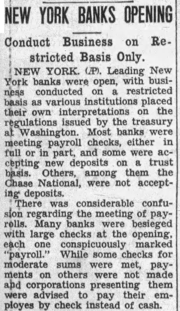 Leading New York banks were open, business conducted restricted ... Others, the Chase National, were not accepting deposits. ... banks loosening their strings ... the Chase National Bank, after opening, decided to close keeping with the governor's mandate. But the ... later made clear that Secretary Woodin's ruling took precedence. ... In New York the situation confused for time by Governor's extension. (Banks) were open, business conducted restricted as various institutions placed their interpretations on the regulations issued by the treasury Washington. (paraphrase confirming restricted reopening).