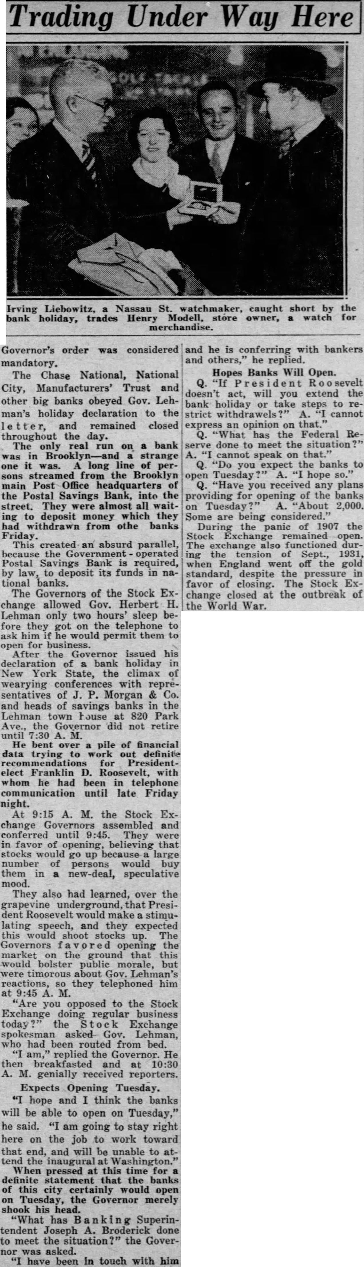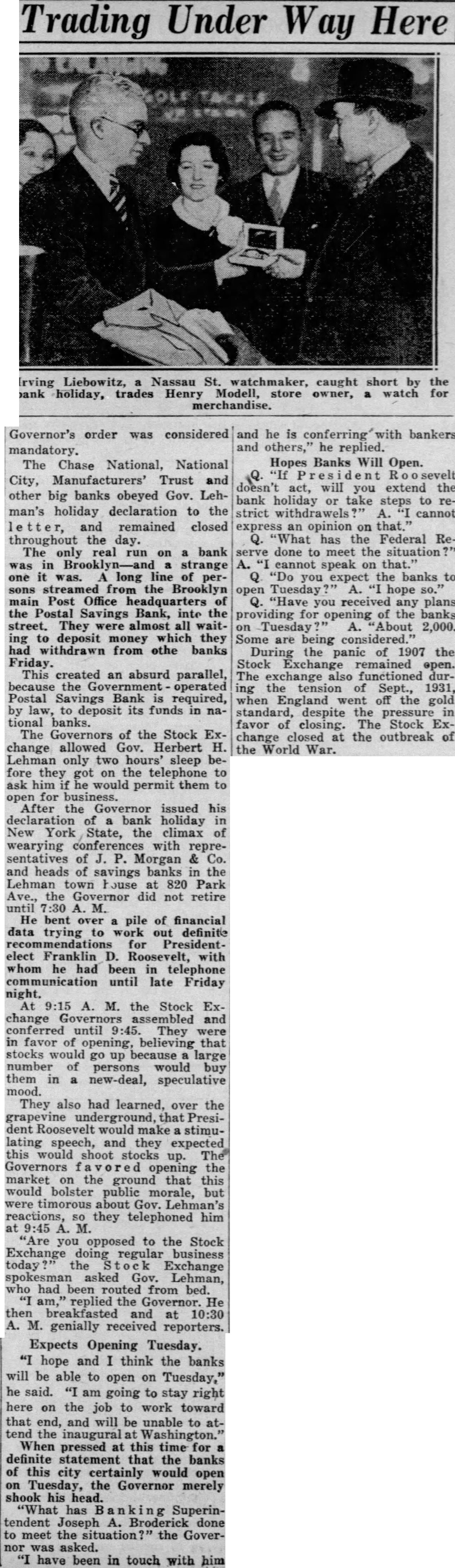 Trading Under Way Here Governor's order was considered mandatory. The Chase National, National City, Manufacturers' Trust and other big banks obeyed Gov. Lehman's holiday declaration to the letter, and remained closed throughout the day. The only real run on a bank was in Brooklyn-and a strange one it was. A long line of persons streamed from the Brooklyn main Post Office headquarters of the Postal Savings Bank, into the street. They were almost all waiting to deposit money which they had withdrawn from othe banks Friday. This created an absurd parallel, because the Government operated Postal Savings Bank is required, by law, to deposit its funds in national banks. The Governors of the Stock Exchange allowed Gov. Herbert H. Lehman only two hours' sleep before they got on the telephone to ask him if he would permit them to open for business. After the Governor issued his declaration of a bank holiday in New York State, the climax of wearying conferences with representatives of J. P. Morgan & Co. and heads of savings banks in the Lehman town house at 820 Park Ave., the Governor did not retire until 7:30 A. M. He bent over a pile of financial data trying to work out definite recommendations for Presidentelect Franklin D. Roosevelt, with whom he had been in telephone communication until late Friday night. At 9:15 A. M. the Stock Exchange Governors assembled and conferred until 9:45. They were in favor of opening, believing that stocks would go up because a large number of persons would buy them in a new-deal, speculative mood. They also had learned, over the grapevine underground, that President Roosevelt would make a stimulating speech, and they expected this would shoot stocks up. The Governors avored opening the market on the ground that this would bolster public morale, but were timorous about Gov. Lehman's reactions, S0 they telephoned him at 9:45 A. M. "Are you opposed to the Stock Exchange doing regular business today the Stock Exchange spokesman asked Gov. Lehman, who had been routed from bed. "I am," replied the Governor. He then breakfasted and at 10:30 A. M. genially received reporters. Expects Opening Tuesday. "I hope and I think the banks will be able to open on Tuesday," he said. "I am going to stay right here on the job to work toward that end, and will be unable to attend the inaugural at Washington." When pressed at this time for a definite statement that the banks of this city certainly would open on Tuesday, the Governor merely shook his head. "What has Banking Superintendent Joseph A. Broderick done to meet the situation? the Governor was asked. "I have been in touch with him and he is conferring with bankers and others," he replied. Hopes Banks Will Open. Q. "If President sevelt doesn't act, will you extend the bank holiday or take steps to restrict withdrawels?' A. "I cannot express an opinion on that." Q. "What has the Federal Reserve done to meet the situation? A. "I cannot speak on that." Q. "Do you expect the banks to open Tuesday A. "I hope so." Q. "Have you received any plans providing for opening of the banks on Tuesday? A. "About 2,000. Some are being considered." During the panic of 1907 the Stock Exchange remained open. The exchange also functioned during the tension of Sept., 1931, when England went off the gold standard, despite the pressure in favor of closing. The Stock Exchange closed at the outbreak of the World War.