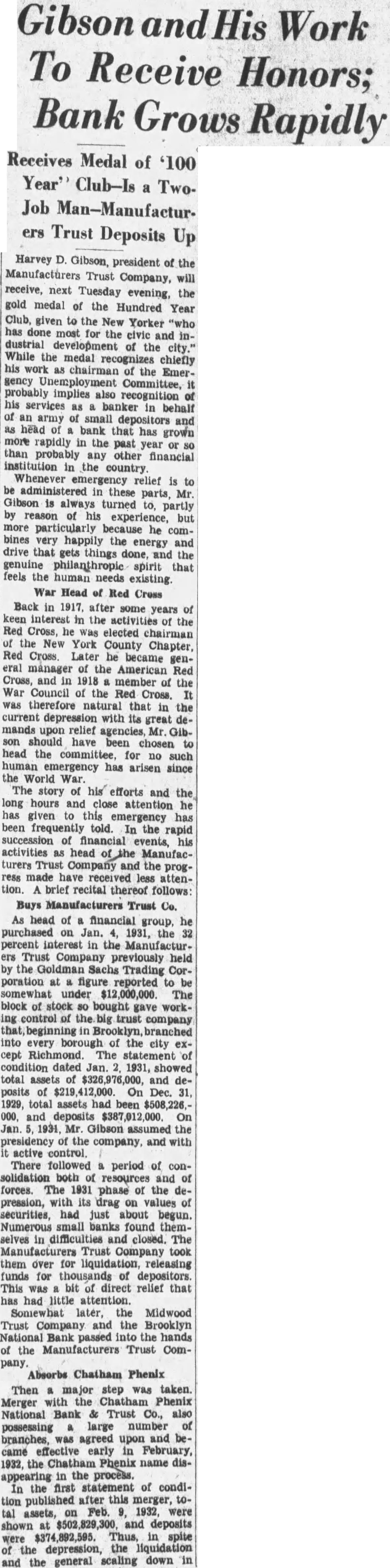 Gibson Work To Receive Honors; Bank Grows Rapidly Receives Medal of '100 Year' Club-Is TwoJob Man-Manufacturers Trust Deposits Up Harvey D. Gibson, president of the Manufacturers Trust Company, will next Tuesday evening, the gold medal of the Hundred Year Club, given the New Yorker "who has most civic and industrial the While the medal recognizes chiefly his chairman the Emergency Committee, probably implies services banker behalf of an army small depositors and head bank that has more rapidly the past than probably any other financial institution the country Whenever relief administered these parts, Mr Gibson always turned to, partly by reason of his experience, but more particularly because he combines very happily energy and drive that things done, and the genuine philanthropic spirit that the human needs existing War Head of Red Cross Back in 1917, years in the activities of the Red Cross, elected the New York County Chapter, Red Cross. Later became eral manager American Red Cross, and member of the War Council the Red Cross. was that in the current with its mands upon relief agencies, son should have head the committee, for no human emergency has arisen since the World The story of his efforts and the long hours he has given this been frequently told. In the rapid succession his activities head Manufacturers Trust Company and the progreceived attention brief recital thereof follows: Buys Manufacturers Trust Co. As head of financial he group, purchased 1931, the percent interest in the Manufacturers Trust Company previously by the Sachs Trading Corporation at figure reported be $12,000,000 block of bought gave workcontrol the trust company into every borough of the city cept statement dated Jan. 1931, showed total and of On 1929, total assets 000, and $387,012,000. On presidency the and with active control. There followed period of consolidation resources and forces. The 1931 of the pression, with drag on values securities, about begun. Numerous small banks found selves difficulties and closed. The Trust took them over for releasing for of This was bit of direct relief that has had little attention. later, the Midwood Trust Company the Brooklyn National into the the Manufacturers Trust Company. Absorbs Chatham Phenix Then step was taken Merger with Chatham Phenix National Bank Trust Co., also possessing large number branches, was agreed upon came effective early in February, 1932, the Chatham Phenix name appearing process. In the statement of condition published after this merger, tal assets, Feb. 1932, were shown and deposits $374,892,595. Thus, in were the depression, the liquidation scaling down and the general