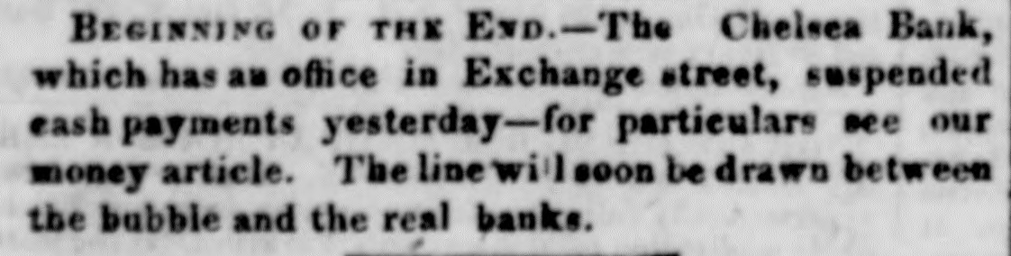 BEGINNING OF THE End.-The Cheisea Bank, which has au office in Exchange street, suspended cash payments yesterday-for particulars see our money article. The line wilsoon be drawn between the bubble and the real banks.