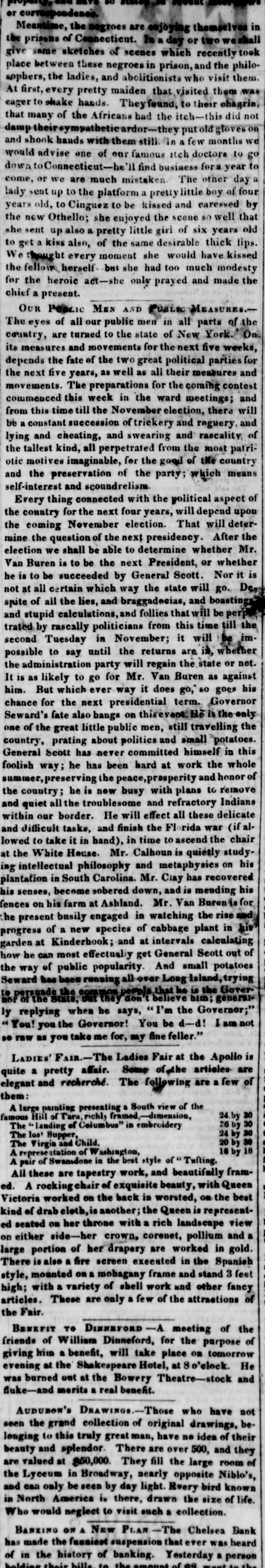 or Meantime, the megroes are enjoying themselves the prisons of Connectient. In : day or two weshall give some sketches of scenes which recently place between these negroes in prison, and the philothe ladies, and abolitionists who pretty maiden that sophers, At first, every visited their visit them chagrin, them. was to shake hands. eyfound, to of the Africans had the damp eager that many circympathetic itch-thi put old gloves on did not shook hands with them still in a advise one of our famous itch would and few doctors for months to we go to to Connecticut-le find business year or we are much mistaken. The to the platform a pretty come, down lady little other boy of day four by to Cinguez to be kissed and new she enjoyed the scene so years the sent old, Othello; up six caressed well that old sent a pretty little girl of years a kiss also, of the same desirable every moment she to she We get thought up also would much have thick modesty kissed lips. fellow herself but she had too the the for the heroic act-she only prayed and made chief a present. OUR POLICIC MEN AND PUBLIC MEASURES. of of all our public men in all parts York the On. The eyes are turned to the state of New weeks, country, and movements for the next five for its measures the fate of the two great political parties and five as well as all their The preparations for the the depends movements. next years, coming meetings; measures contest and this week in the ward till the November election, commenced time reguery. there will and from this succession of trickery and a and swearing and kind, all perpetrated from lying be constant and cheating, the rascality most country patri- of the tallest motives imaginable, for the good of the means and otic the preservation of the party; which self-interest thing and connected scoundrelism. with the political depend aspect upon of Every for the next four years, will will deterthe country November election. That After the the coming the question of the next presidency. whether Mr. mine shall be able to determine or whether election Buren we is to be the next President, Scott. Nor it is Van be succeeded by General will go. Des he is at to all certain which way the state and boastings not spite of all calculations, the lies, and and braggadecias, follies that will be till perpany the trated and stupid by rascally politicians from this it will time be imsecond Tuesday in November; returns are in, whether possible to say until party the will regain the state against or not. the administration go for Mr. Van Buren as his him. It is as But likely which to ever way it does term. go, so Governor goes chance for the next presidential on thisevent He is the only the Seward's fate also bangs still travelling little public men, small potatoes. one of the prating great about politics and himself in this General country, Scott has never committed at work the whole way; he has been hard and honor foolish preserving the peace, prosperity remove summer, he is new busy and with refractory plans to Indians the country; all the troublesome effect all these delicate and within quiet our border. and He finish will the Florida war the (if alto take it in hand), in time is quietly studylowed and difficult tasks, Calhoun to ascend chair his White House. Mr. metaphysics on in South down, and is mending plantation ing his at the senses, intellectual become philosophy Carolina. sobered Ashland. and Mr. Mr. Ciay Van has Buren recovered rise and his for fences on his busily farm at engaged in watching cabbage plant the in his he present of a new species of intervals calculating progress garden at Kinderbook; most effectually and get at And General small Scott potatoes out of how he can of public popularity Long Island,trying has been that be him; is Seward the way running the general- Gover to ly " You! of the replying you State, the the when take Governor! but me he they for, says, don my You " fine believe I'm be feller." the d! Governor;" I am not " LADIES' raw as you FAIR-The Ladies Some Fair of the the articles Apollo are of elegant quite a and pretty recherché. affair. The following are a few the 24.by them: painting presenting framed a South dimension, view of 26 by 36 24 by 36 The lost Supper Child. famous A large The Hill landing of Tara of Columbus' richly in embroidery 20 by 36 The Virgin and resentation of Washington, the best style of Tuiting. A pair A represe of Swansdone in work, and beautifully with Queen framthese are tapestry beauty, ed. A rocking the back in worsted, kind Victoria All of drabeloth, worked chair on is another; of exquisite with the a rich Queen landscape pollium is OR represent- the and view best ed seated on side-her her throne crown, corenet, are worked in gold. There isalso a fire a mohagany frame and other large on either portion mounted of on her screen drapery executed work and in the stand Spanish 3 fancy feet of the Fair. articles. style, high; with These a variety are of only shell a few of the attractions the DINNEFORD meeting the purpose of of Benefit William TO Dinneford, for on tomorrow friends of benefit, will take place at 8 o'clock. He merits a real giving evening him at the a Shakespeare at the Bowery Hotel, Theatre-stock and was fluke-and burned out benefit. have not beDRAWINGS. Those who drawings, AUDURON'S the grand collection of original have no idea of their they seen to this truly greatman, There are over 500, and room longing beauty and splendor. $50,000. They fill the opposite large Niblo's, of valued at in Broadway, nearly Every bird known the Lyceum only be seen by there, day light. drawn the size of life. and in North can America neglect is to visit such a collection. Banking ON A New suspension that ever was a person holding Who would the funnient PLAN The Yesterday Chelsea in heard Bank he of has in made the their history hills of to banking. the amount of as EAST