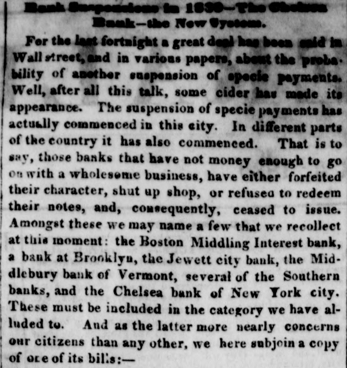 in 1830-The the New System. For the last fortnight a great deal has been said in Wall street, and in various papers, about the proba. bility of another suspension of opecie payments. Well, after all this talk, some cider has made its appearance. The suspension of specie payments has actually commenced in this city. In different parts of the country it has also commenced. That is to say, those banks that have not money enough to go on with a wholesome business, have either forfeited their character, shut up shop, or refused to redeem their notes, and, consequently, ceased to issue. Amongst these we may name a few that we recollect at this moment: the Boston Middling Interest bank, a bank at Brooklyn, the Jewett city bank, the Middlebury bank of Vermont, several of the Southern banks, and the Chelsea bank of New York city. These must be included in the category we have alluded to. And as the latter more nearly concerns our citizens than any other, we here subjoin a copy of one of its bills:-