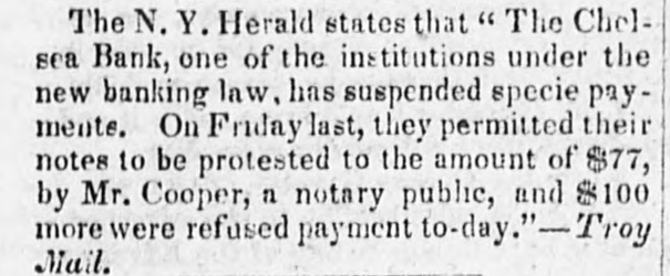 The N. Y. Herald states that "The Chelsea Bank, one of the institutions under the new banking law, has suspended specie payments. On Friday last, they permitted their notes to be protested to the amount of $77, by Mr. Cooper, a notary public, and $100 more were refused payment to-day."—Troy Mail.