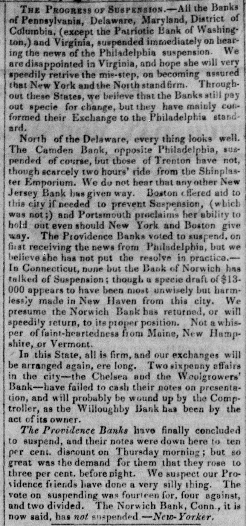 # THE PROGRESS OF SUSPENSION. -All the Banks of Pennsylvania, Delaware, Maryland, District of Columbia, (except the Patriotic Bank of Washington,) and Virginia, suspended immediately on hearing the news of the Philadelphia suspension. We are disappointed in Virginia, and hope she will very speedily retrive the mis-step, on becoming assured that New York and the North stand firm. Throughout these States, we believe that the Banks still pay out specie for change, but they have mainly conformed their Exchange to the Philadelphia standard. North of the Delaware, every thing looks well. The Camden Bank, opposite Philadelphia, suspended of course, but those of Trenton have not, though scarcely two hours' ride from the Shinplaster Emporium. We do not hear that any other New Jersey Bank has given way. Boston offered aid to this city if needed to prevent Suspension, (which was not;) and Portsmouth proclaims her ability to hold out even should New York and Boston give way. The Providence Banks voted to suspend, on first receiving the news from Philadelphia, but we believe she has not put the resolve in practice. In Connecticut, none but the Bank of Norwich has talked of Suspension; though a specie draft of $13-000 appears to have been most unwisely but harmlessly made in New Haven from this city. We presume the Norwich Bank has returned, or will speedily return, to its proper position. Not a whisper of faint-heartedness from Maine, New Hampshire, or Vermont. In this State, all is firm, and our exchanges will be arranged again, ere long. Two sixpenny affairs in the city-the Chelsea and the Woolgrowers' Bank-have failed to cash their notes on presentation, and will probably be wound up by the Comptroller, as the Willoughby Bank has been by the act of its owner. The Providence Banks have finally concluded to suspend, and their notes were down here to ten per cent. discount on Thursday morning; but so great was the demand for them that they rose to three per cent. before night. We suspect our Providence friends have done a very silly thing. The vote on suspending was fourteen for, four against, and two divided. The Norwich Bank, Conn., it is now said, has not suspended.-New-Yorker.