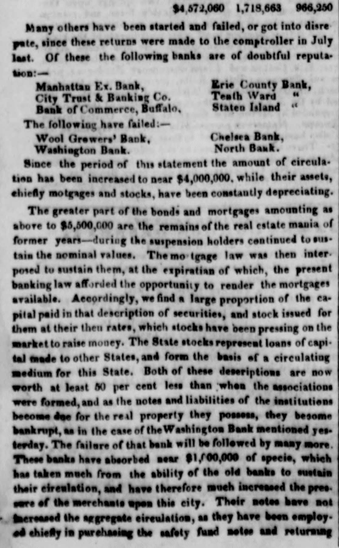 $4,572,060 1,718,663 966,250 Many others have been started and failed, or got into disre pate, since these returns were made to the comptroller in July last. or these the following banks are of doubtful reputation:Erie County Bank, Manhattan Ex. Bank, Teath Ward City Trust & Banking Co. Staten Island a Bank of Commerce, Buffalo, The following have failed:Chelsea Bank, Wool Grewers' Bank, North Bank. Washington Bank. Since the period of this statement the amount of circula. tion has been increased to near $4,000,000. while their assets, chiefly motgages and stocks, have been constantly depreciating. The greater part of the bonds and mortgages amounting as above to $5,500,000 are the remains of the real estate mania of former years-during the suspension holders continued to sustain the nominal values. The mo tgage law was then inter. posed to sustain them, at the expiration of which, the present banking law afforded the opportunity to render the mortgages available. Accordingly, we find a large proportion of the capital paid in that description of securities, and stock issued for them at their then rates, which stocks have been pressing on the market to raise money. The State stocks represent loans of capital made to other States, and form the basis of a circulating medium for this State. Both of these descriptions are now worth at least 50 per cent less than when the associations were formed, and as the notes and liabilities of the institutions become dec for the real property they possess, they become bankrupt, as in the case of the Washington Bank mentioned yes. terday. The failure of that bank will be followed by many more. These banks have aboorbed near $1,000,000 of specie, which has taken much from the ability of the old banks to sustain their circulation, and have therefore much increased the pres. sere of the merchants open this city. Their notes have not increased the aggregate circulation, as they have been employw chiefly in purchasing the safety fund notes and returning