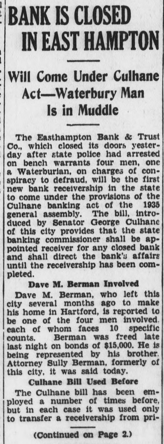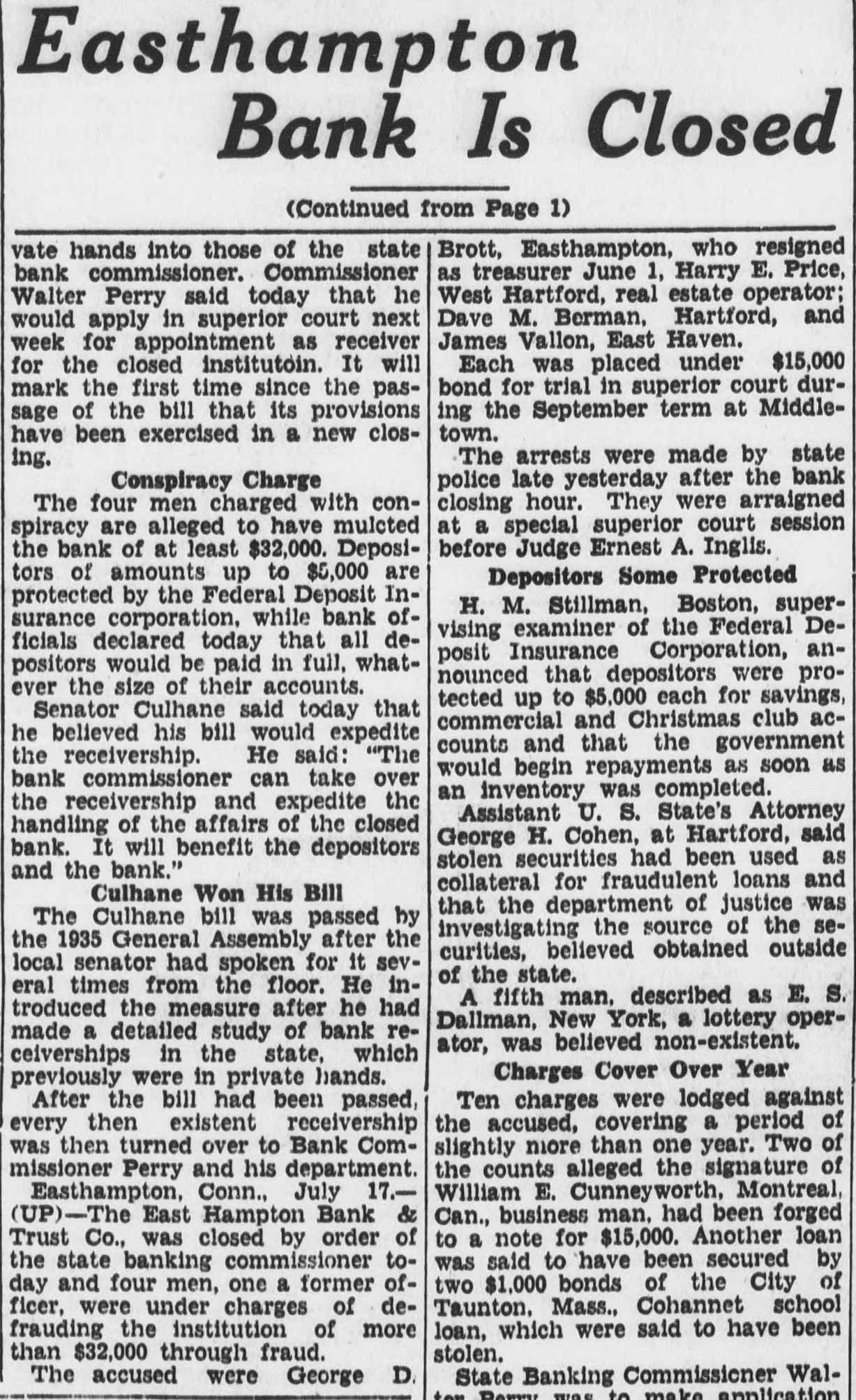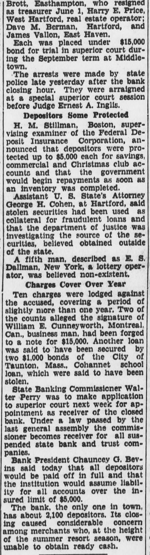 Easthampton Bank Is Closed (Continued from Page 1) vate hands into those of the state Brott, Easthampton, who resigned as treasurer June 1, Harry E. Price, bank commissioner. Commissioner West Hartford, real estate operator; Walter Perry said today that he Dave M. Berman, Hartford, and would apply in superior court next James Vallon, East Haven. week for appointment as receiver for the closed institutoin. It will Each was placed under $15,000 bond for trial in superior court durmark the first time since the pasing the September term at Middlesage of the bill that its provisions town. have been exercised in a new closThe arrests were made by state ing. police late yesterday after the bank Conspiracy Charge closing hour. They were arraigned The four men charged with conat a special superior court session spiracy are alleged to have mulcted before Judge Ernest A. Inglis. the bank of at least $32,000. Depositors of amounts up to $5,000 are Depositors Some Protected protected by the Federal Deposit InH. M. Stillman, Boston, supersurance corporation, while bank ofvising examiner of the Federal Deficials declared today that all deposit Insurance Corporation, anpositors would be paid in full, whatnounced that depositors were proever the size of their accounts. tected up to $5,000 each for savings, Senator Culhane said today that commercial and Christmas club ache believed his bill would expedite counts and that the government the receivership. He said: "The would begin repayments as soon as bank commissioner can take over an inventory was completed. the receivership and expedite the Assistant U. S. State's Attorney handling of the affairs of the closed George H. Cohen, at Hartford, said bank. It will benefit the depositors stolen securities had been used as and the bank." collateral for fraudulent loans and Culhane Won His Bill that the department of justice was The Culhane bill was passed by investigating the source of the sethe 1935 General Assembly after the curities, believed obtained outside local senator had spoken for it sevof the state. eral times from the floor. He inA fifth man. described as E. S. troduced the measure after he had Dallman, New York, a lottery opermade a detailed study of bank reator, was believed non-existent. ceiverships in the state, which Charges Cover Over Year previously were in private hands. After the bill had been passed, Ten charges were lodged against the accused, covering a period of every then existent receivership was then turned over to Bank Comslightly more than one year. Two of the counts alleged the signature of missioner Perry and his department. William E. Cunneyworth, Montreal, Easthampton, Conn., July 17.(UP)-The East Hampton Bank & Can., business man. had been forged to a note for $15,000. Another loan Trust Co., was closed by order of was said to have been secured by the state banking commissioner today and four men, one a former oftwo $1,000 bonds of the City of Taunton, Mass., Cohannet school ficer, were under charges of defrauding the institution of more loan, which were said to have been stolen. than $32,000 through fraud. The accused were George D. State Banking Commissioner Wal-