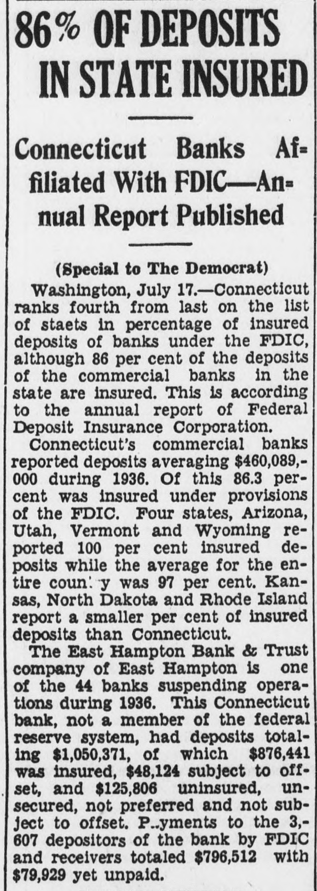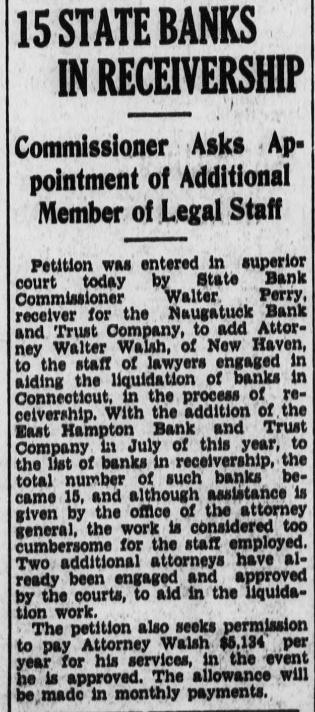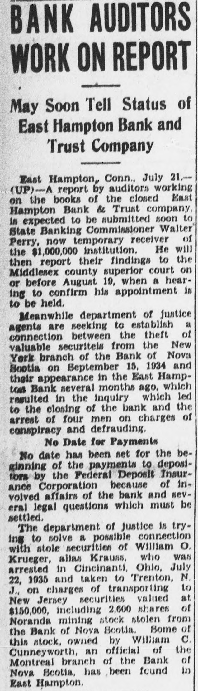 Easthampton Bank Is Closed (Continued from Page 1) vate hands into those of the state Brott, Easthampton, who resigned as treasurer June 1, Harry E. Price, bank commissioner. Commissioner West Hartford, real estate operator; Walter Perry said today that he Dave M. Berman, Hartford, and would apply in superior court next James Vallon, East Haven. week for appointment as receiver for the closed institutoin. It will Each was placed under $15,000 bond for trial in superior court durmark the first time since the pasing the September term at Middlesage of the bill that its provisions town. have been exercised in a new closThe arrests were made by state ing. police late yesterday after the bank Conspiracy Charge closing hour. They were arraigned The four men charged with conat a special superior court session spiracy are alleged to have mulcted before Judge Ernest A. Inglis. the bank of at least $32,000. Depositors of amounts up to $5,000 are Depositors Some Protected protected by the Federal Deposit InH. M. Stillman, Boston, supersurance corporation, while bank ofvising examiner of the Federal Deficials declared today that all deposit Insurance Corporation, anpositors would be paid in full, whatnounced that depositors were proever the size of their accounts. tected up to $5,000 each for savings, Senator Culhane said today that commercial and Christmas club ache believed his bill would expedite counts and that the government the receivership. He said: "The would begin repayments as soon as bank commissioner can take over an inventory was completed. the receivership and expedite the Assistant U. S. State's Attorney handling of the affairs of the closed George H. Cohen, at Hartford, said bank. It will benefit the depositors stolen securities had been used as and the bank." collateral for fraudulent loans and Culhane Won His Bill that the department of justice was The Culhane bill was passed by investigating the source of the sethe 1935 General Assembly after the curities, believed obtained outside local senator had spoken for it sevof the state. eral times from the floor. He inA fifth man. described as E. S. troduced the measure after he had Dallman, New York, a lottery opermade a detailed study of bank reator, was believed non-existent. ceiverships in the state, which Charges Cover Over Year previously were in private hands. After the bill had been passed, Ten charges were lodged against the accused, covering a period of every then existent receivership was then turned over to Bank Comslightly more than one year. Two of the counts alleged the signature of missioner Perry and his department. William E. Cunneyworth, Montreal, Easthampton, Conn., July 17.(UP)-The East Hampton Bank & Can., business man. had been forged to a note for $15,000. Another loan Trust Co., was closed by order of was said to have been secured by the state banking commissioner today and four men, one a former oftwo $1,000 bonds of the City of Taunton, Mass., Cohannet school ficer, were under charges of defrauding the institution of more loan, which were said to have been stolen. than $32,000 through fraud. The accused were George D. State Banking Commissioner Wal-