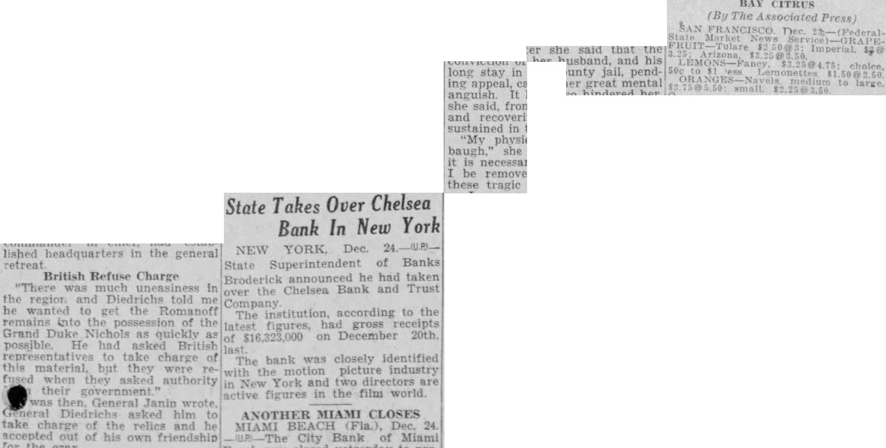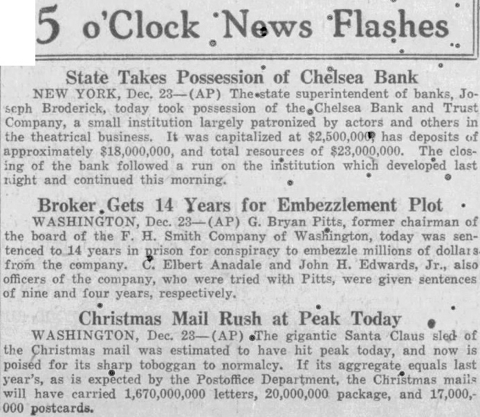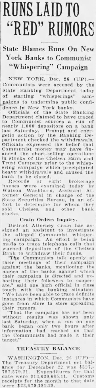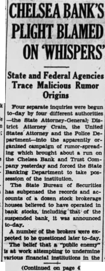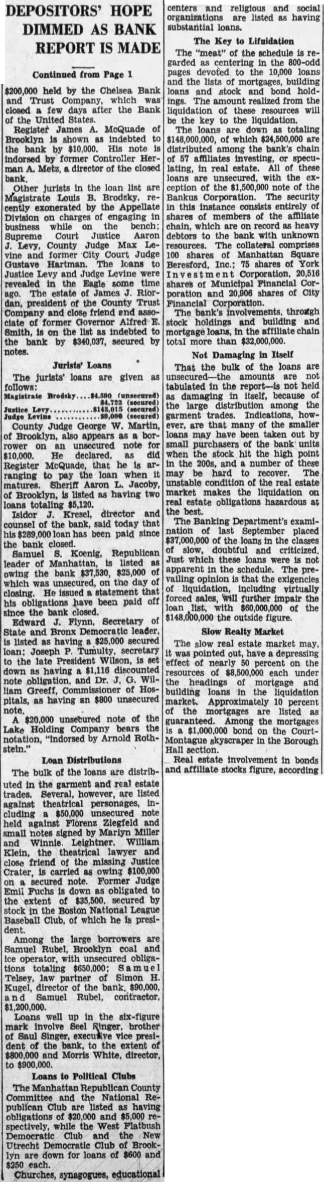 $200,000 held by the Chelsea Bank and Trust Company, which closed few days after the Bank the United States. Register James McQuade of Brooklyn shown as indebted the bank by $10,000. His note indorsed by former Controller HerMetz, director of the closed Other jurists in the loan list are Magistrate Louis Brodsky cently exonerated by the Appellate Division on charges of engaging business while bench; Supreme Court Justice Aaron Levy, County Judge Max Levine former City Court Judge Gustave Hartman. The loans Justice Levy and Judge Levine were revealed in the Eagle some time The estate of James Riorago. dan, president of the County Trust Company and close friend end clate former Governor Alfred Smith, on the list indebted the bank by $340,037, secured notes.