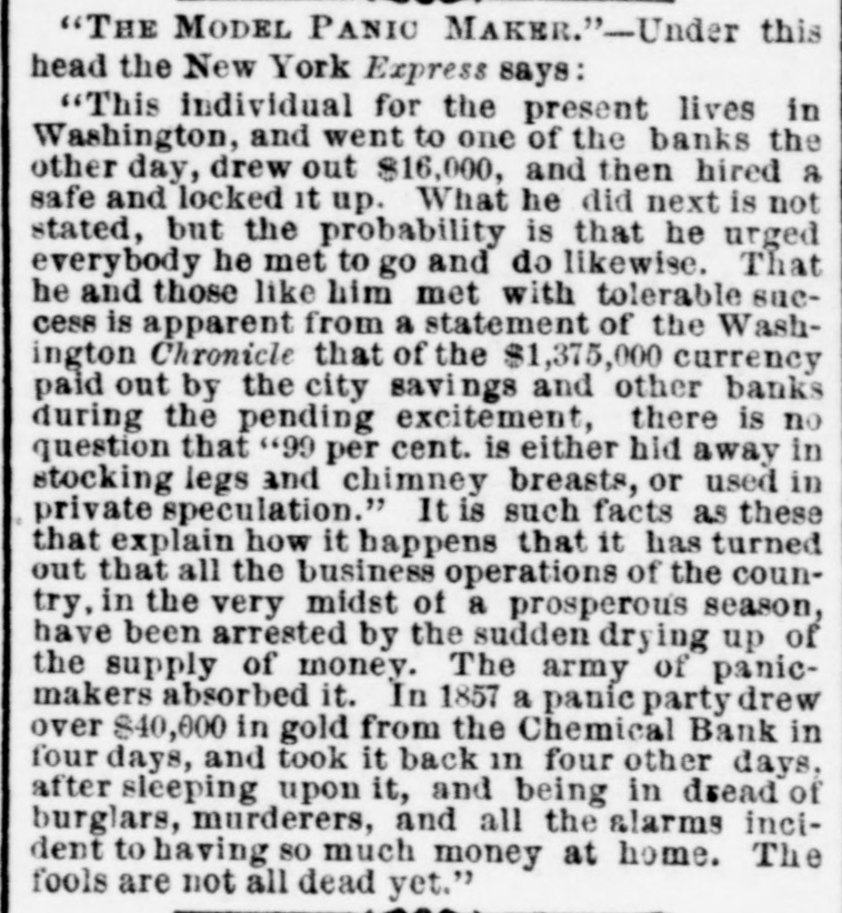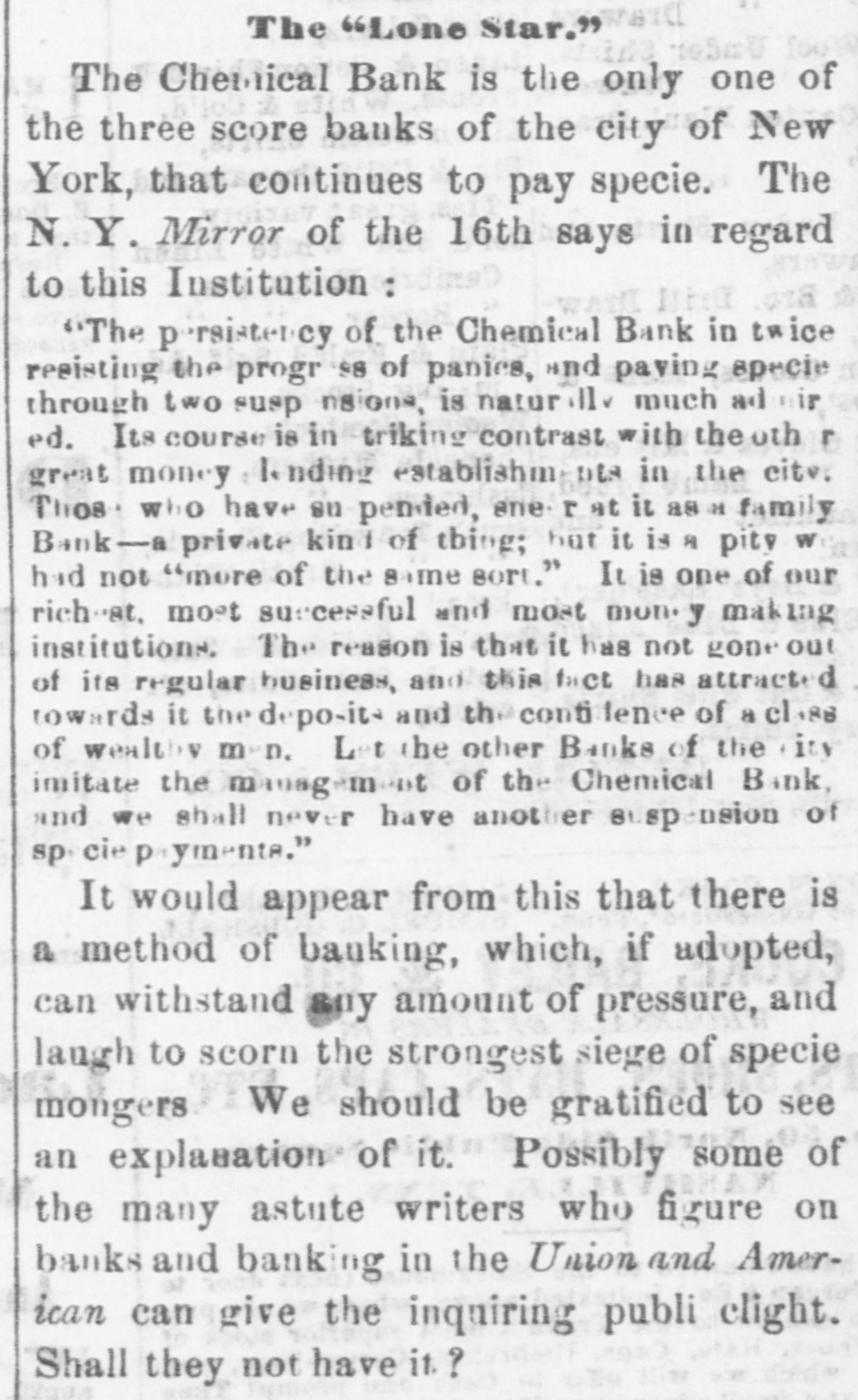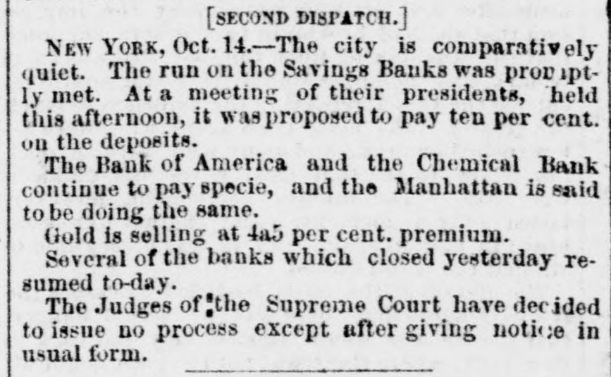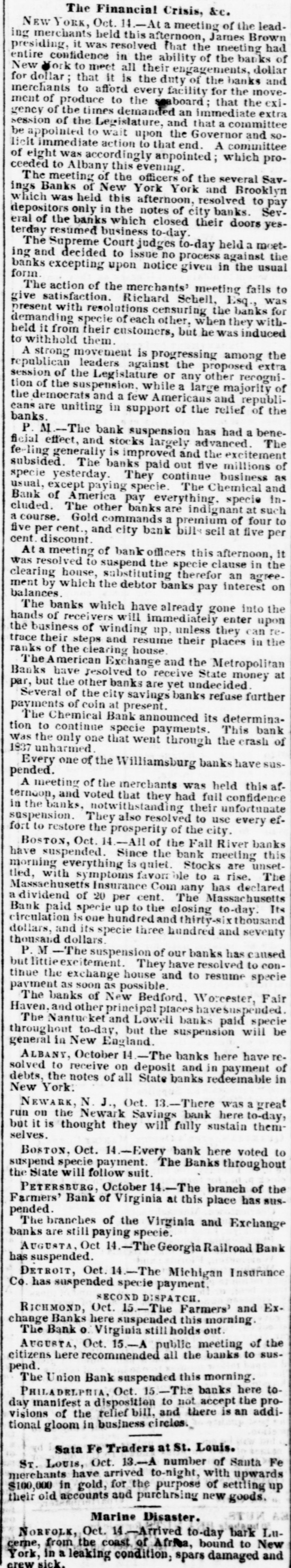 action to that end. A committee of eight was accordingly anpointed; which proceeded to Albany this evening. The meeting of the officers of the several Savings Banks of New York York and Brooklyn which was held this afternoon, resolved to pay depositors only in the notes of city banks. Several of the banks which closed their doors yesterday resumed business to-day. The Supreme Court judges to-day held a meeting and decided to issue no process against the form. banks excepting upon notice given in the usual The action of the merchants' meeting fails to give satisfaction. Richard Schell, Esq., was present with resolutions censuring the banks for demanding specie of each other, when they withheld it from their customers, but he was induced to withhold them. A strong movement is progressing among the republican leaders against the proposed extra session of the Legislature or any other recognition of the suspension. while a large majority of the democrats and a few Americans and republicans banks. are uniting in support of the relief of the P. M-The bank suspension has had a beneficial effect, and stocks largely advanced. The feeling generally is improved and the excitement subsided. The banks paid out five millions of specie yesterday. They continue business as usual, except paying specie. The Chemical and Bank of America pay everything. specie included. The other banks are indignant at such a course. Gold commands a premium of four to five per cent., and city bank bills sell at five per cent. discount. At a meeting of bank officers this afternoon, it was resolved to suspend the specie clause in the clearing house, substituting therefor an agreement balances. by which the debtor banks pay interest on The banks which have already gone into the hands of receivers will immediately enter upon the business of winding up, unless they can retrace their steps and resume their places in the ranks of the clearing house. The American Exchange and the Metropolitan Banks have resolved to receive State money at par, but the other banks are yet undecided. Several of the city savings banks refuse further payments of coin at present. The Chemical Bank announced its determination to continue specie payments. This bank was the only one that went through the crash of 1837 unharmed. pended. Every one of the Williamsburg banks have susA meeting of the merchants was held this afternoon, and voted that they had full confidence in the banks, notwithstanding their unfortunate suspension. They also resolved to use every effort to restore the prosperity of the city. BOSTON, Oct. 14.-All of the Fall River banks have suspended. Since the bank meeting this morning everything is quiet. Stocks are unsettled, with symptoms favora ble to a rise. The Massachusetts Insurance Com any has declared a dividend of 20 per cent. The Massachusetts Bank paid specie up to the closing to-day. Its circulation is one hundred and thirty-six thousand dollars, and its specie three hundred and seventy thousand dollars. P. M -The suspension of our banks has caused but littieexcitement. They have resolved to continue the exchange house and to resume specie payment as soon as possible. The banks of New Bedford. Worcester, Fair Haven. and other principal places havesuspended. The Nantu and Lowell banks paid specie throughout to-day, but the suspension will be general in New England. ALBANY, October 14.-The banks here have resolved to receive on deposit and in payment of debts, the notes of all State banks redeemable in New York: NEWARK, N. J., Oct. 13.-There was a great run on the Newark Savings bank here to-day, but it is thought they will fully sustain themselves. BOSTON, Oct. 14.-Every bank here voted to suspend specie payment. The Banks throughout the State will follow suit. PETERSBURG, October 14.-The branch of the Farmers' Bank of Virginia at this place has suspended. The branches of the Virginia and Exchange banks are still paying specie. AUGUSTA, Oct 14.-The Georgia Railroad Bank has suspended. DETROIT, Oct. 14.-The Michigan Insurance Co. has suspended specie payment. SECOND DISPATCH. RICHMOND, Oct. 15.-The Farmers' and Exchange Banks here suspended this morning. The Bank 0. Virginia still holds out. AUGUSTA, Oct. 15-A public meeting of the citizens here recommended all the banks to suspend. The Union Bank suspended this morning. Philadrlphia, Oct. 15-The banks here today manifest a disposition to not accept the provisions of the relief bill, and there is an additional gloom in business circles. Sata Fe Traders at St. Louis. ST. LOUIS, Oct. 13.-A number of Santa Fe merchants have arrived to-night, with upwards $100,000 in gold, for the purpose of settling up their old accounts and purchrsing new goods. Marine Disaster. NORFOLK, Oct. 14.-Arrived to-day bark Lucerne, from the coast of Africa, bound to New York, in a leaking condition, spars damaged and crew sick.