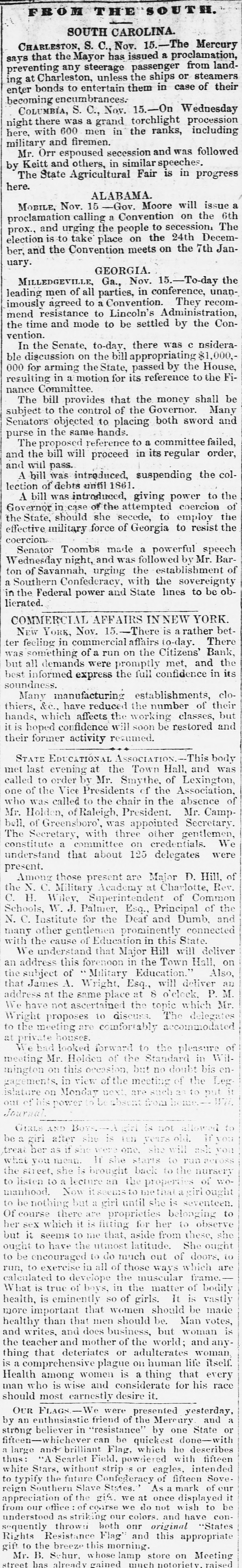 M SOUTH CAROLINA CHARLESTON, S. C., Nov.15.-The Mercary that the Mayor has issued a proclamation from landsays preventing any steerage unless the passenger ships or steamers their enter ing at bonds Charleston, to entertain them in case of becoming encumbrances. COLUMBIA, S. C., Nov. 15.-On Wednesday procession was grand torchlight here, night there with 600 men a in the ranks, including military Mr. Orr and espoused firemen. secession and was followed Keitt and others, in similar speeches. by The State Agricultural Fair is in progress here. ALABAMA. MOBILE, Nov. 15 -Gov. Moore will the issue 6th a proclamation calling a Convention on The and urging the people to secession Decemprox., is to take place on the 24th Janber, election and the Convention meets on the 7th uary. GEORGIA. MILLEDGEVILLE, Ga., Nov. 15.-To-day the men of all parties, in conference, recom- unanimously leading agreed to a Convention. They resistance to Lincoln's Administration, Conmend the time and mode to be settled by the vention. In the Senate, to-day, there was c nsideradiscussion on the bill appropriating $1,000,ble for arming the State, passed by the House, the Fi000 resulting in a motion for its reference to nance Committee. bill provides that the money shall be subject The to the control of the Governor. Many and Senators objected to placing both sword purse in the same hands. The proposed reference to a committee failed, and the bill will proceed in its regular order, and will pass. bill was introduced, suspending the collection of debts until 1861. A bill was introduced, giving power to the of Governor in case of the attempted coercion the State, should she secede, to employ effective the military force of Georgia to resist the coercion. Senator Toombs made a powerful speech BarWednesday night, and was followed by Mr. of of Savannah, urging the establishment ton Southern Confederacy, with the sovereignty oba in the Federal power and State lines to be lierated. COMMERCIAL AFFAIRS INNEW YORK. NEW YORK, Nov. 15.-There is a rather betfeeling in commercial affairs to-day. There was ter `something of a run on the Citizens' Bank, the but all demands were promptly met, and its best informed express the full confidence in soundness. Many manufacturing establishments, clothiers, &c., have reduced the number of their hands, which affects the working classes, but it is hoped confidence will soon be restored and their former activity resumed. STATE EDUCATIONAL ASSOCIATION.- This body met last evening at the Town Hall, and was called to order by Mr. Smythe, of Lexington, one of the Vice Presidents of the Association, who was called to the chair in the absence of Mr. Holden, of Raleigh, President. Mr. Campbell, of Greensboro`, was appointed Secretary. The Secretary, with three other gentlemen, constitute a committee on credentials. We understand that about 125 delegates were present. Among those present are Major D. Hill, of the N. C. Military Academy at Chavlotte, Rev. C. H. Wiley, Superintendent of Common Schools, W. J. Palnier, Esq., Principal of the N. C. Institute for the Deaf and Dumb. and many other gentlemen prominently connected with the cause of Education in this State. We understand that Major Hill will deliver an address this forenoon in the Town Hall, on subject of Military Education." Also, that James A. Wright, Esq., will deliver an address at the same place at 8 o'clock. P. M. We have not ascertained the topic which Mr. Wright proposes to discuss. The delegates to the meeting are comfortably accommodated private houses. We bad looked forward to the pleasure of meeting Mr. Holden of the Standard in Wilmington on this occasion, but no doubt bis en gagements, in view of the meeting of the Leg islature on Monday next. are such as to put is out of his power in be absent from be INC. Journal is not GIRLS AND B be girl after she is TEN years old. If you treat ber as if she were one, she will ask you what you mean. It she starts to run across the street, she is brought back to the nursery to listen to a lecture an the properties of Now it seems to methat a manhood. girl ought woto nothing but a girl until she is seventeen. Of course there are proprieties belonging to her sex which it is fitting for her to observe but it seems to me that, aside from these, she ought to have the utinost latitude. She ought to be encouraged to do much out of doors, to run, to exercise in all of those ways which are calculated to the muscular frame. What is true of boys, in the matter is so of girls. is health, eminently develope should It of be bodily vastly made more important that women healthy than that men should be. Man votes, and writes, and does business, but woman is the teacher and mother of the world; and anything that deteriates or adulterates woman is a comprehensive plague on human life itself. Health among women is a thing that every man who is wise and considerate for his race should most earnestly desire it. OUR FLAGS.-W were presented yesterday, a by an enthusiastic friend of the Mercury and believer in "resistance" by one State can be strong fifteen-whichever quickest done-with or a large and brilliant Flag, which he describes thus: "A Scarlet Field, powdered with fifteen without strip S or white Stars, eagles, fifteen intended Soveto typify the future Confederacy of reign Southern Slave States. As a mark of our appreciation of the gif. we at once displayed it office of course we do not wish to be our colors. and confrom understood our striking have "States sequently thrown both onr original Rights Resistance Flag" and this appropriate