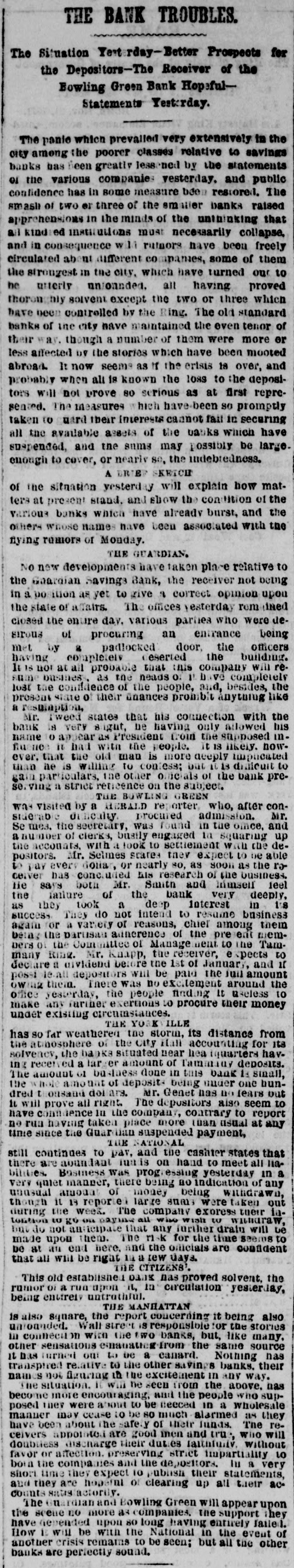 THE BANK TROUBLES. The Situation Yet rday-Better Prospects for the Depositors-The Receiver of the Bowling Green Bank HopefulStatements Yest: The panic which prevailed very extensively in the city among the poorer classes relative to savings banks has Been greatly less ned by the statements of the various companies vesterday. and public confidence has in some measure been restored. The smash of two or three of the smaller banks raised apprehensions in the minds of the untainking that all kind ed institutions must necessarily collapse, and in consequence will rutnors have been freely circulated ab nt different co spanies, some of them the strongest in the city, which have turned our to he urterly un ounded. all having proved thoron nly solvent except the two or three which have been controlled by the Ring. The old standard banks of the city have maintained the even tenor of their way. though a number or them were more or less affected DV the stories which have been mooted abroad. It now seems as If the erisis is over, and probably when all is known the loss to the depositors will not prove 80 serious as at first represeated. The measures hich have-been so promptly taken to uard their interests cannot fail in securing all the available assets of the backs which have suspended, and the sums may ossibly be large. enough to cover, or nearly so, the indebredness. A ERTE KETCH of the situation yesterday will explain how matters at present stand, and show the condition of the various banks which have already burst, and the others whose name have been associated with the nying ramors of Monday. THE GUARDIAN. NO new developments have taken place relative to the Goardian Savings Bank, the receiver not being in a ition as yet to give 8 correct opinion upon of afairs. The offices yesterday remained the entire day. various parties of procuring an entrance the closed sirous state who were being deby a padlocked door, the building. officers met having completely eserted company the will renor at all probable that this 15 as the neads O. 1 the sum confidence of the people, and, 1031 state o their finances prombit present It the basines, have Anything besides, completely like states that his his Mr. is very signt, be having only R bank resulaption, Tweed connection supposed allowed with the ino as President croin the name it had with the people. it IS finance the old man is more deeply to ever. that appear contess; Dat 13 likely. impucated dimicult nowthan particulars, ae is willing the to other officials of the bank pregain a strict reticence on the subject. serving THE BOWLING GREEN was visited by a AERALD reporter, who, after procured admission. con- Mr. siderab the directly secretary, was found in the once, and up Se mea. of clerks, busily engaged 1a squaring with the deanumoer with a look to settlement able the accounts, Mr. Selmes scares tney expect to as be the reever Golia, or nearly so, as SOON business. to pay has concluded his research of himself the ceiver positors. both Mr. Smith and deeply, 1eel lie says the bank very as they They do not intend to resuine them the failure took of a deep interest among business in is success a variety of reasons, chief memagain being the or the partisite Committee 01 adnerence Manage of nent to e the Tam- to the present spects if pers Rine. Mr. Kaapp, the receiver, and many before the 1st of a depositors will be paid the the possi There was no to declare 10.all them. dividend excitement January It Juil around useless amount own the people neding make office any yesterday, further exernous to procure their money under existing circumstances. THE YORK ILLE from has so far weathered Of the the city storm, Hall accounting its distance for hav- its the atinosphere the hanks situated near hea tquarters deposits. ing recen ed 01 a lar business en done in tate bank one 1: small, bunThe amount not of deposit+ being under tears out the solveney, whole amo amount Mr. Genet of Tamariar nas no dred monsand prove all right. of ars. The depositors contrary also to seem report to have confidence 1il place more tuan usual at any unie no rua since the Guardian It will having takea THE the company, NATIONAL suspended payment, still continues to pav. and on the hand cashier to meet states all that 11athere are abundant was lustis progressing yesterday of in a billines. manner, there being no very qmet of money being out unusual reported large sum were their amount Bosiness indication exoress WILLGRAWD taken any inthough the it 13 week. The company wish to withdraw, during tontion do not to anticipate payment that any win for further the time drain seems will be to but made upon end them. here. The and r1-k the oficials are condident that be at all an Will be right THE 14 a CITIZENS'. few days. rumor o: a run upon This old established it, DANK in nas circulation proved solvent, yesterday, the being entirely untrathful. THE MANHATTAN it being also concerning is also square, the street report is responsible for the stories unrounded. on Wall with the TWO banks, but, like source many, in connection the same nas other to be a canard. their it has to the savings sensations turned relative our Nothing banks. any way. transpired names the situation. figuring I will in the he excitement seen and from the people the in above. who sup- nas become more about to be neeced in a wholesale as they posed they were cease to be 80 much The manner may encouraging safe.y of their alarmed lungs. will rehave been about the good men and tru, who ceivers discharge their duties 10 doubless favor or appointed affection. preserving are and the depositors. strict impartiality III without a very both the companies 10 publish their they are short time they of clearing up all and trafactorily. hoperni expect appear upon statements, their accounts Bowling Green will they The mardian and more ascompanies. the support Jalled. the scene no upon 80 long having entirely the event of have depended be with the National