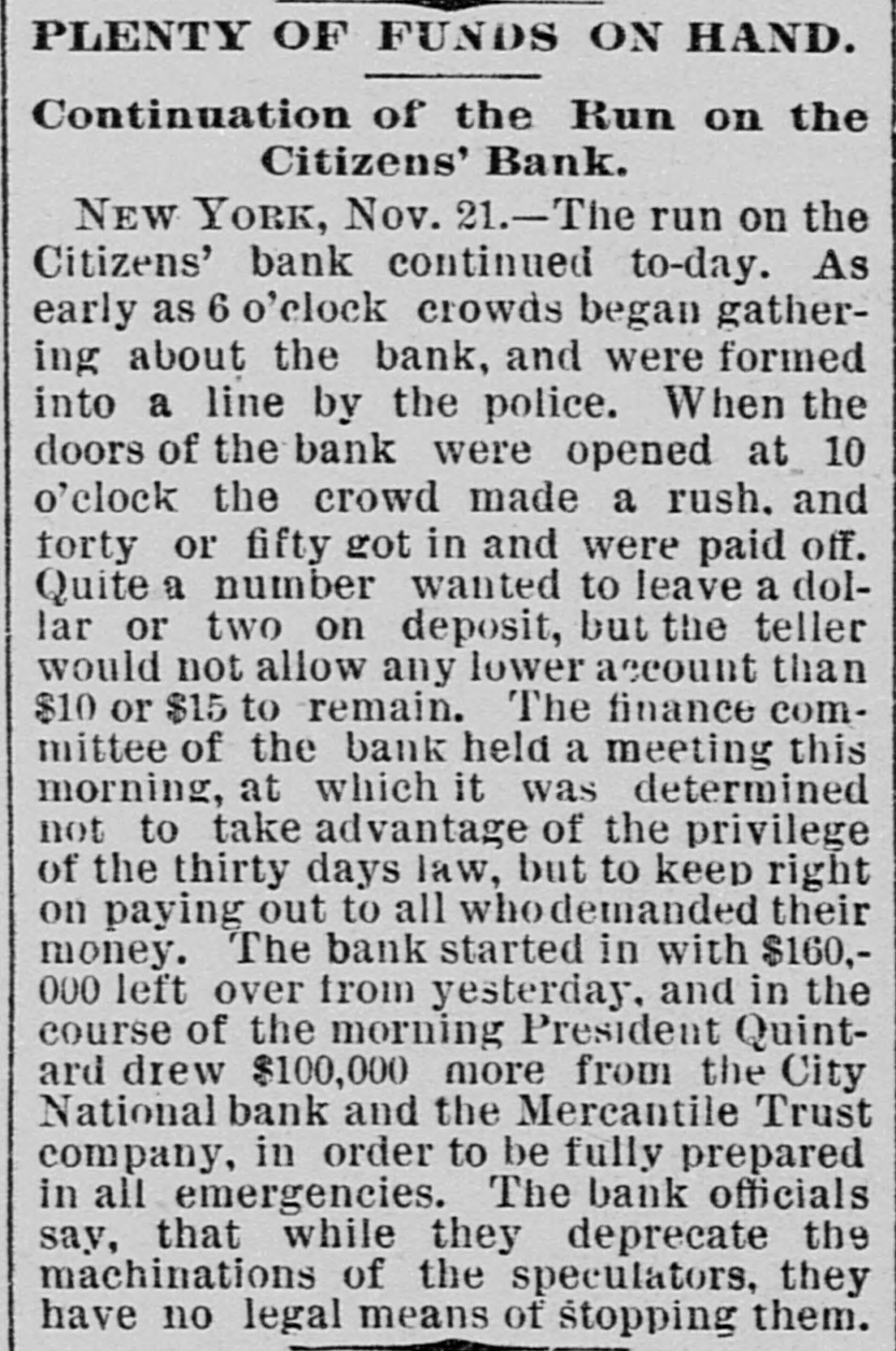 The run on the Citizens' bank continued to-day... The finance committee ... determined not to take advantage of the privilege of the thirty days law, but to keep right on paying out to all who demanded their money.