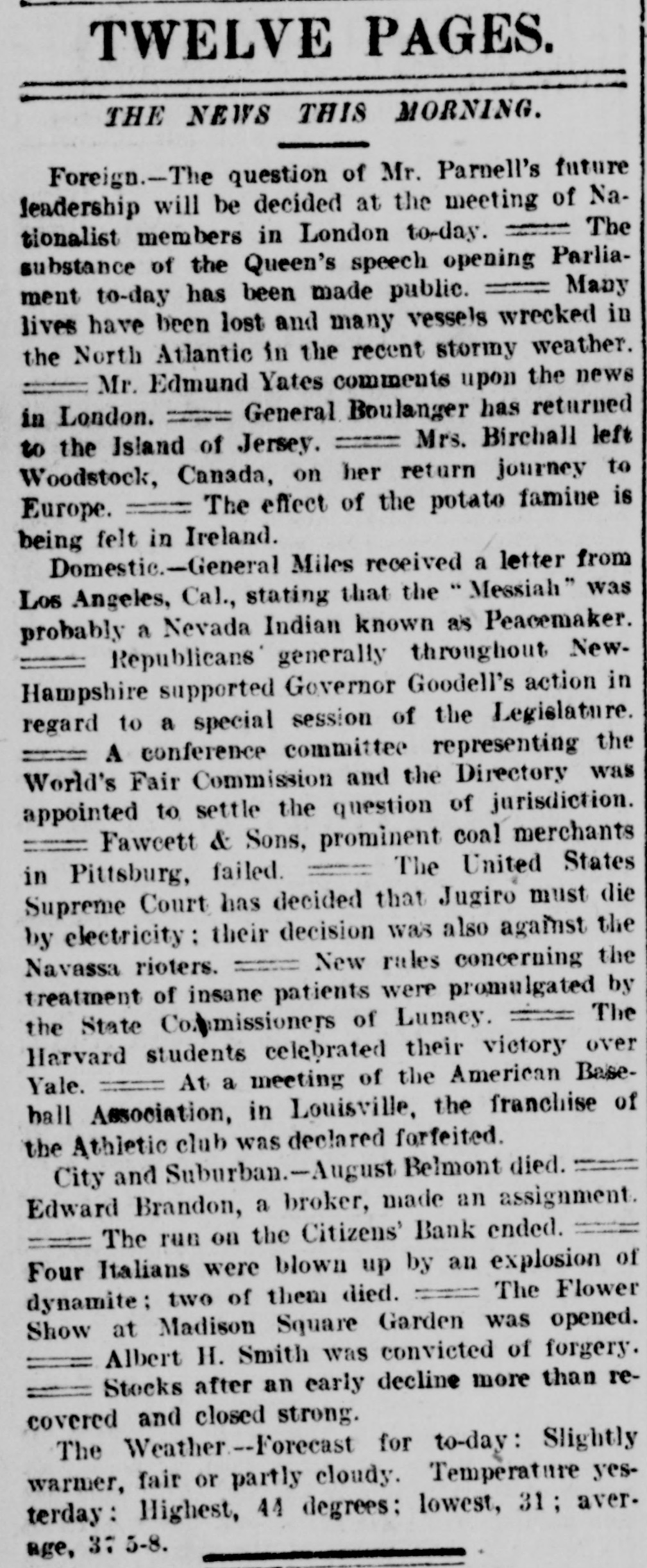 TWELVE PAGES. THE NEWS THIS MORNING. Foreign. - The question of Mr. Parnell's future leadership will be decided at the meeting of Nationalist members in London to-day. The substance of the Queen's speech opening Parliament to-day has been made public. Many lives have been lost and many vessels wrecked in the North Atlantic in the recent stormy weather. Mr. Edmund Yates comments upon the news in London. General Boulanger has returned to the Island of Jersey. Mrs. Birchall left Woodstock, Canada, on her return journey to Europe. The effect of the potato famine is being felt in Ireland. Domestic. - General Miles received a letter from Los Angeles, Cal., stating that the "Messiah" was probably a Nevada Indian known as Peacemaker. Republicans generally throughout New-Hampshire supported Governor Goodell's action in regard to a special session of the Legislature. A conference committee representing the World's Fair Commission and the Directory was appointed to settle the question of jurisdiction. Fawcett & Sons, prominent coal merchants in Pittsburg, failed. The United States Supreme Court has decided that Jugiro must die by electricity: their decision was also against the Navassa rioters. New rules concerning the treatment of insane patients were promulgated by the State Commissioners of Lunacy. The Harvard students celebrated their victory over Yale. At a meeting of the American Baseball Association, in Louisville, the franchise of the Athletic club was declared forfeited. City and Suburban. - August Belmont died. Edward Brandon, a broker, made an assignment. The run on the Citizens' Bank ended. Four Italians were blown up by an explosion of dynamite; two of them died. The Flower Show at Madison Square Garden was opened. Albert H. Smith was convicted of forgery. Stocks after an early decline more than recovered and closed strong. The Weather - Forecast for to-day: Slightly warmer, fair or partly cloudy. Temperature yesterday: Highest, 44 degrees: lowest, 31; average, 37 5-8.