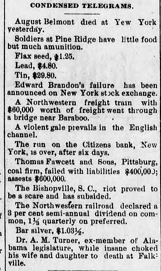 # CONDENSED TELEGRAMS. August Belmont died at Yew York yesterday. Soldiers at Pine Ridge have little food but much amunition. Flax seed, $1.25. Lead, $4.80. Tin, $29.80. Edward Brandon's failure has been announced on New York stock exchange. A Northwestern freight train with $60,000 worth of freight went through a bridge near Baraboo. A violent gale prevails in the English channel. The run on the Citizens bank, New York, is over, after six days. Thomas Fawcett and Sons, Pittsburg, coal firm, failed with liabilities $400,000; assests $600,000. The Bishopville, S. C., riot proved to be a scare and has subsided. The Northwestern railroad declared a 3 per cent semi-annual dividend on common, 1¼ quarterly on preferred. Bar silver, $1.03½. Dr. A. M. Turner, ex-member of Alabama legislature, while insane choked his wife and daughter to death at Falkville.
