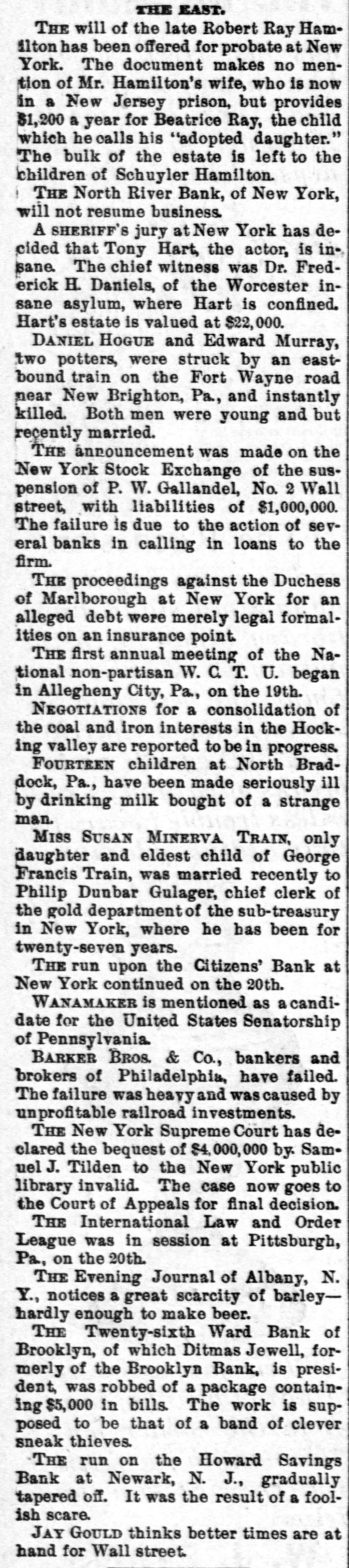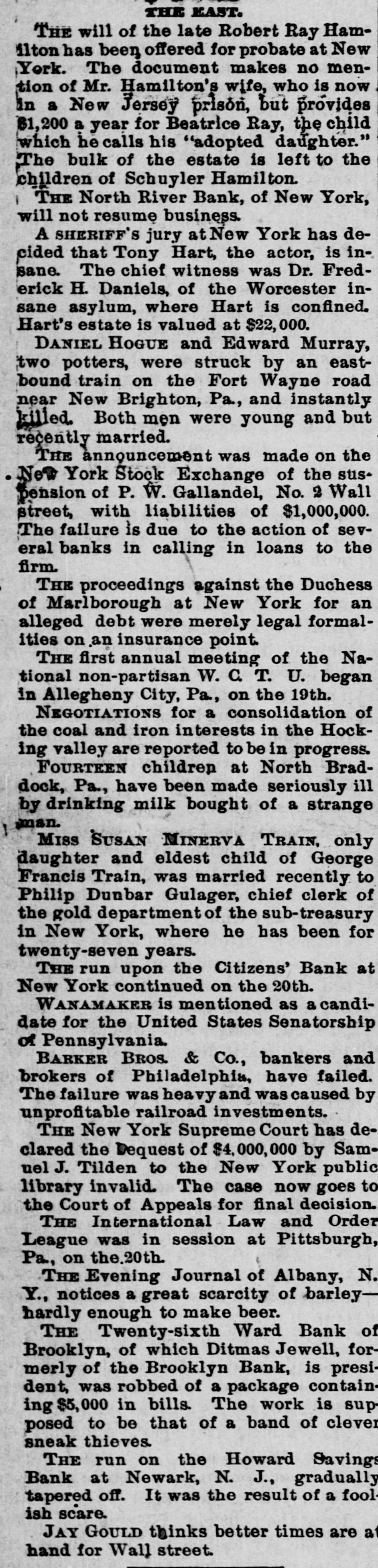 THE EAST. THE will of the late Robert Ray Hamilton has been offered for probate at New York. The document makes no mention of Mr. Hamilton's wife, who is now in a New Jersey prison, but provides $1,200 a year for Beatrice Ray, the child which he calls his "adopted daughter." The bulk of the estate is left to the children of Schuyler Hamilton. THE North River Bank, of New York, will not resume business. A SHERIFF'S jury New York has decided that Tony Hart, the actor, is insane. The chief witness was Dr. Frederick H. Daniels, of the Worcester insane asylum, where Hart is confined. Hart's estate is valued at $22,000. DANIEL HOGUE and Edward Murray, two potters, were struck by an eastbound train on the Fort Wayne road near New Brighton, Pa., and instantly killed. Both men were young and but recently married. THE announcement was made on the New York Stock Exchange of the suspension of P. W. Gallandel, No. 2 Wall street, with liabilities of $1,000,000. The failure is due to the action of several banks in calling in loans to the firm. THE proceedings against the Duchess of Marlborough at New York for an alleged debt were merely legal formalities on an insurance point. THE first annual meeting of the National non-partisan W. C. T. U. began in Allegheny City, Pa., on the 19th. NEGOTIATIONS for a consolidation of the coal and iron interests in the Hocking valley are reported to be in progress. FOURTEEN children at North Braddock, Pa., have been made seriously ill by drinking milk bought of a strange ,man. MISS SUSAN MINERVA TRAIN, only daughter and eldest child of George Francis Train, was married recently to Philip Dunbar Gulager, chief clerk of the gold department of the sub-treasury in New York, where he has been for twenty-seven years. THE run upon the Citizens' Bank at New York continued on the 20th. WANAMAKER is mentioned as a candidate for the United States Senatorship of Pennsylvania. BARKER BROS. & Co., bankers and brokers of Philadelphia, have failed. The failure was heavy and was caused by unprofitable railroad investments. THE New York Supreme Court has declared the Dequest of $4,000,000 by Samuel J. Tilden to the New York public library invalid. The case now goes to the Court of Appeals for final decision. THE International Law and Order League was in session at Pittsburgh, Pa., on the.20th. THE Evening Journal of Albany, N. Y., notices a great scarcity of barleyhardly enough to make beer. THE Twenty-sixth Ward Bank of Brooklyn, of which Ditmas Jewell, formerly of the Brooklyn Bank, is president, was robbed of a package containing $5,000 in bills. The work is supposed to be that of a band of clever sneak thieves. THE run on the Howard Savings Bank at Newark, N. J., gradually tapered off. It was the result of a fool ish scare. JAY GOULD thinks better times are at hand for Wall street.