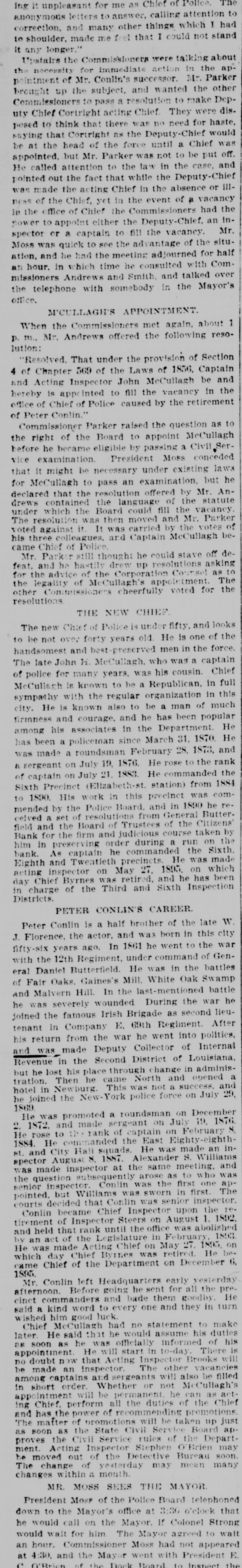 correction, and many stand to shoulder. made me feel that I could not 4 it any longer.'' Upstairs the Commissioners were talking about the necessity for immediate action in the appointment of Mr. Conlin's successor. Mr. Parker brought up the subject. and wanted the other Commissioners to pass a resolution to make Dep. uty Chief Cortright acting Chief. They were disposed to think that there was no need for haste, saying that Cortright as the Deputy-Chief would be at the head of the force until a Chief was appointed. but Mr. Parker was not to be put off. He called attention to the law in the case, and pointed out the fact that while the Deputy-Chief was made the acting Chief in the absence or illness of the Chief, yet in the event of a vacancy the in the office of Chief the Commissioners had power to appoint either the Deputy-Chief. an Mr. inspector or a captain to fill the vacancy. Moss was quick to see the advantage of the situation. and he had the meeting adjourned for half an hour. in which time he consulted with Com. missioners Andrews and Smith, and talked over the telephone with somebody in the Mayor's office. M'CULLAGH'S APPOINTMENT When the Commissioners met again. about 1 p. m., Mr. Andrews offered the following resolution: "Resolved. That under the provision of Section 4 of Chapter 569 of the Laws of 1856. Captain and Acting Inspector John McCullagh be and hereby is appointed to fill the vacancy in the office of Chief of Police caused by the retirement of Peter Conlin.** Commissioner Parker raised the question as to the right of the Board to appoint McCullagh before he became eligible by passing a Civil Service examination. President Moss conceded that it might be necessary under existing laws he for McCullagh to pass an examination but declared that the resolution offered by Mr. Andrews contained the language of the statute under which the Board could fill the vacancy. The resolution was then moved and Mr. Parker of voted against it. It was carried by the votes his three colleagues. and Captain McCullagh became Chief of Police Mr. Parker still thought he could stave off defeat. and he hastily drew up resolutions asking for the advice of the Corporation Counsel as The to the legality of McCullagh's appointment. the other Commissioners cheerfully voted for resolutions THE NEW CHIEF The new Chief of Police is under fifty, and looks to be not over forty years old. He is one of the handsomest and best-preserved men in the force. The late John H. McCallagh. who was a captain of police for many years, was his cousin. Chief McCullach is known to he a Republican. in full sympathy with the regular organization in this city. He is known also to be a man of much firmness and courage. and he has been popular among his associates in the Department. He has been a policeman since March 31. 1870. He was made a roundsman February 28. 1873, and 8 sergeant on July 19, 1876. He rose to the rank of captain on July 21. 1883. He commanded the Sixth Precinct (Elizabeth-st. station) from 1884 to 1890. His work in this precinct was commended by the Police Board. and in 1890 he recelved a set of resolutions from General Butterfield and the Board of Trustees of the Citizens' Bank for the firm and judicious course taken the by him in preserving order during a run on bank. As captain he commanded the Sixth. Eighth and Twentieth precincts. He was made acting inspector on May 27. 1895. on which day Chief Byrnes was retired, and he has been in charge of the Third and Sixth Inspection Districts. PETER CONLIN'S CAREER. Peter Conlin is a half brother of the late W. J. Florence, the actor, and was born in this city fifty-six years ago. In 1861 he went to the war with the 12th Regiment, under command of General Daniel Butterfield. He was in the battles of Fair Oaks. Gaines's Mill. White Oak Swamp and Malvern Hill. In the last-mentioned battle he was severely wounded During the war he joined the famous Irish Brigade as second lieutenant in Company E. 69th Regiment. After his return from the war he went into politics, and was made Deputy Collector of Internal Revenue in the Second District of Louisiana, but he lost his place through change in administration. Then he came North and opened a hotel in Newburg. This was not a success. and he joined the New-York police force on July 29. 1869 He was promoted a roundsman on December 1876 2. 1872. and made sergeant on July 19. He rose to the rank of captain on February 8. 1884. He commanded the East Eighty-eight and City Hall squads He was made an inst. spector August 8. 1887. Alexander S. Williams was made inspector at the same meeting, and the question subsequently arose as to who was senior inspector. Conlin was the first one appointed. but Williams was sworn in first. The courts decided that Conlin was senior inspector. Conlin became Chief Inspector upon the retirement of Inspector Steers on August 1. 1892. abolished and held that rank until the office was by an act of the Legislature in February, 1893. He was made Acting Chief on May 27. 1895, on which day Chief Byrnes was retired. He became Chief of the Department on December 6. 1895. Mr. Conlin left Headquarters early yesterday afternoon. Before going he sent for all the precinct commanders and bade them goodby. He said a kind word to every one and they in turn wished him good luck. Chief McCullagh had no statement to make later. He said that he would assume his duties as soon as he was officially informed of his appointment. He will start in to-day. There is no doubt now that Acting Inspector Brooks will be made an inspector. The other vacancies among captains and sergeants will also be filled in short order. Whether or not McCullagh's appointment will be permanent he can as acting Chief. perform all the duties of the Chief and has the power of recommending promotions The matter of promotions will be taken up just as soon as the State Civil Service Board ap. proves the Civil Service rules of the Department. Acting Ins