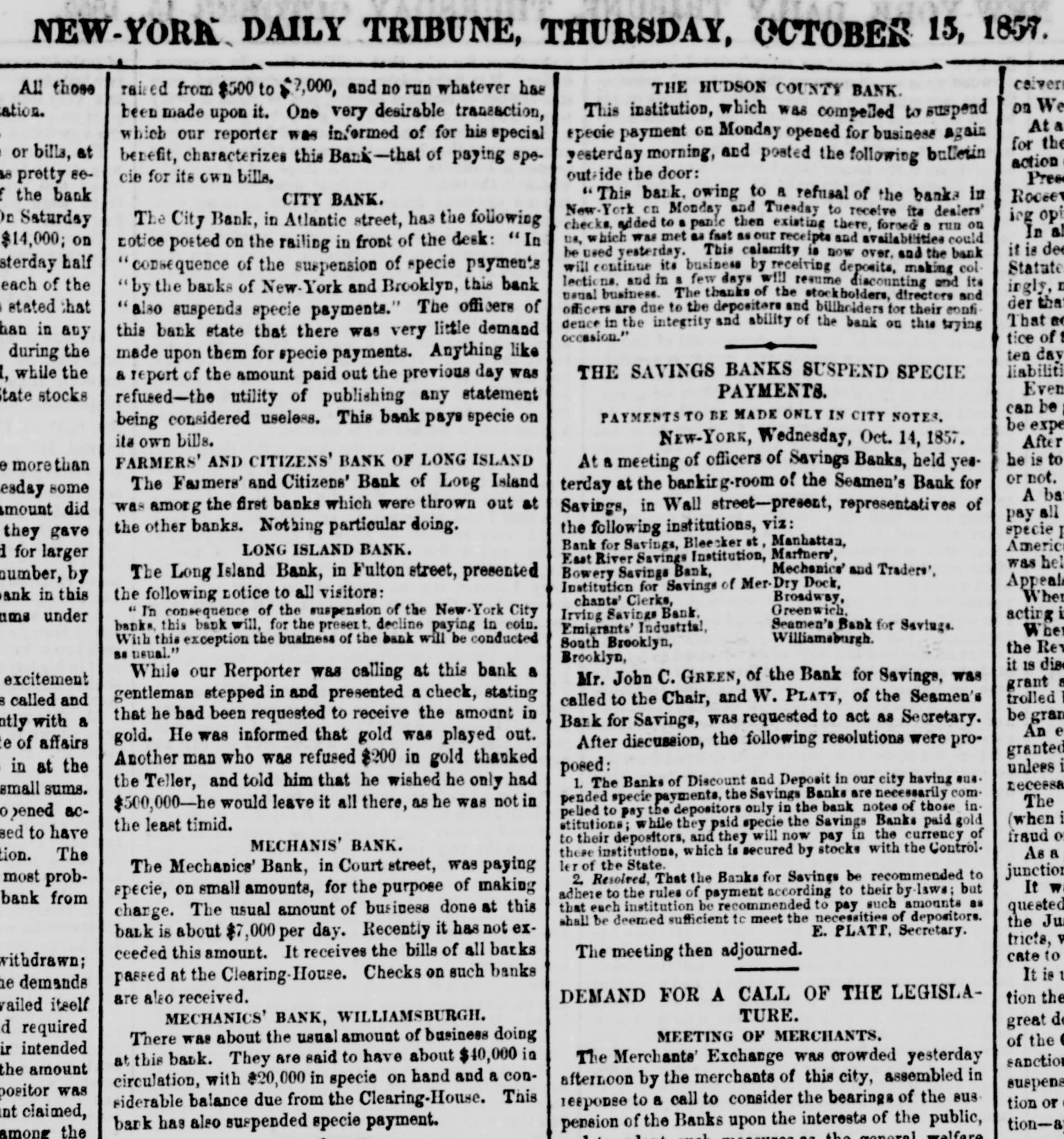 NEW-YORK DAILY TRIBUNE, THURSDAY, OCTOBER 15, 1857. ceivers All those THE HUDSON COUNTY BANK. raised from $500 to $2,000, and no run whatever has on We This institution, which was compelled to suspend been made upon it. One very desirable transaction, At a specie payment on Monday opened for business again which our reporter was informed of for his special for the or at bills, benefit, characterizes this Bank-that of paying speyesterday morning, and posted the following bulletin action seoutside the door: pretty cie for its own bills. Prese the 'This bank, owing to a refusal of the banks in bank Roosev CITY BANK. New-York on Monday and Tuesday to receive its dealers' ing opi Saturday The City Bank, in Atlantic street, has the following checks, added to a panic then existing there, forced a run on In al us, which was met as fast as our receipts and availabilities could on $14,000; notice posted on the railing in front of the desk: In it is dee be used yesterday. This calamity is now over, and the bank half sterday will continue its business by receiving deposits, making colStatute 'consequence of the suspension of specie payments lections, and in a few days will resume discounting and its each of the ingly, n by the banks of New-York and Brooklyn, this bank usual business. The thanks of the stockbolders, directors and der that stated that officers are due to the depositers and billholders for their confialso suspends specie payments." The officers of That ao dence in the integrity and ability of the bank on this trying in this bank state that there was very little demand any occasion." tice of 1 the during ten day made upon them for specie payments. Anything like liabiliti while the THE SAVINGS BANKS SUSPEND SPECIE a report of the amount paid out the previous day was Even PAYMENTS. stocks refused-the utility of publishing any statement can be 1 PAYMENTS TO BE MADE ONLY IN CITY NOTES. being considered useless. This bank pays specie on be expe its own bills. New-York, Wednesday, Oct. 14, 1857. After he is to FARMERS' AND CITIZENS' BANK OF LONG ISLAND morethan At a meeting of officers of Savings Banks, held yesor not. The Farmers' and Citizens' Bank of Long Island some terday at the banking-room of the Seamen's Bank for esday A ba was among the first banks which were thrown out at did mount Savings, in Wall street-present, representatives of pay all the other banks. Nothing particular doing. the following institutions, viz: specie I gave they Bank for Savings, Bleecker st, Manhattan, America LONG ISLAND BANK. for larger East River Savings Institution, Martners', was hel Mechanics' and Traders', Bowery Savings Bank, The Long Island Bank, in Fulton street, presented number, by Appeal Institution for Savings of Mer-Dry Dock, this in the following notice to all visitors: When Broadway, chants' Clerks, Greenwich, I'n consequence of the suspension of the New.York City under Irving Savings Bank, acting i banks, this bank will, for the present, decline paying in coin. Seamen's Bank for Savings. Emigrants' Industrial, When Williamsburgh. With this exception the business of the bank will be conducted South Brooklyn, the Rev as usual." Brooklyn, it IS dis While our Rerporter was calling at this bank a Mr. John C. GREEN, of the Bank for Savings, was excitement grant a gentleman stepped in and presented a check, stating trolled 1 called and called to the Chair, and W. PLATT, of the Seamen's be gran that he bad been requested to receive the amount in a with Bank for Savings, was requested to act as Secretary. An e gold. He was informed that gold was played out. After discussion, the following resolutions were proof affairs granted Another man who was refused $200 in gold thanked in the at unless i posed: 1. The Banks of Discount and Deposit in our city having sus. the Teller, and told him that he wished he only had necessa sums. small pended specie payments, the Savings Banks are necessarily comThe $500,000-he would leave it all there, as he was not in acpelled to pay the depositors only in the bank notes of those inpened (when i the least timid. stitutions; while they paid specie the Savings Banks paid gold have to fraud o to their depositors, and they will now pay in the currency of MECHANIS' BANK. these institutions, which is secured by stocks with the ControlAs a The ler of the State. The Mechanics' Bank, in Court street, was paying junction most 2. Resolved, That the Banks for Savings be recommended to probIt w specie, on small amounts, for the purpose of making adhere to the rules of payment according to their by-laws; but from bank that each institution be recommended to pay such amounts as quested charge. The usual amount of business done at this shall be deemed sufficient to meet the necessities of depositors. the Ju E. PLATT, Secretary. bank is about $7,000 per day. Recently it has not extricts, v ceeded this amount. It receives the bills of all backs The meeting then adjourned. cate to withdrawn; It i@ 1 passed at the Clearing-House. Checks on such banks demands DEMAND FOR A CALL OF THE LEGISLAtion the are also received. itself TURE. MECHANICS' BANK, WILLIAMSBURGH. great de required MEETING OF MERCHANTS. There was about the usual amount of business doing of the < intended The Merchants' Exchange was crowded yesterday at this bank. They are said to have about $40,000 in sanction amount the circulation, with $20,000 in specie on hand and a conafternoon by the merchants of this city, assembled in suspens was positor siderable balance due from the Clearing-House. This tion or response to a call to consider the bearings of the susclaimed, tion-a bank has also suspended specie payment. pension of the Banks upon the interests of the public, the among anot ea the general welfare