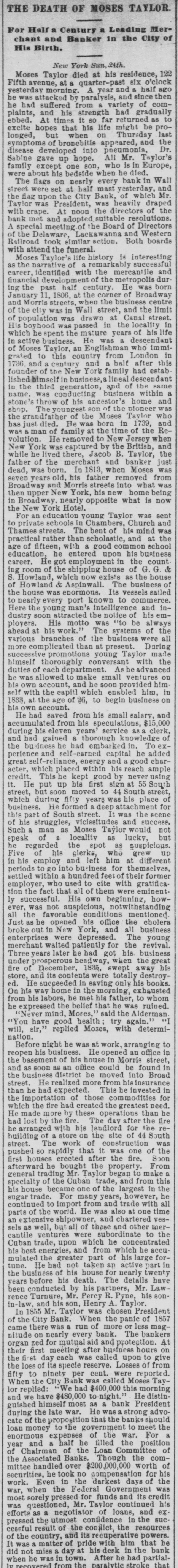 # THE DEATH OF MOSES TAYLOR. For Half a Century a Leading Merchant and Banker in the City of His Birth. New York Sun, 24th. Moses Taylor died at his residence, 122 Fifth avenue, at a quarter-past six o'clock yesterday morning. A year and a half ago he was attacked by paralysis, and since then he had suffered from a variety of complaints, and his strength had gradually ebbed. At times it so far returned as to excite hopes that his life might be prolonged, but when on Thursday last symptoms of bronchitis appeared, and the disease developed into pneumonis, Dr. Sabine gave up hope. All Mr. Taylor's family except one son, who is in Europe, were about his bedside when he died. The flags on nesrly every bank in Wall street were set at half mast yesterday, and the flag upon the City Bank, of which Mr. Taylor was President, was heavily draped with crape. At noon the directors of the bank met and adopted suitable resolutions. A special meeting of the Board of Directors of the Delaware, Lackawanna and Western Railroad took similar setion. Both boards with attend the funeral. Moses Taylor's life history is interesting as the narrative of a remarkably successful career, identified with the mercantile and financial development of the metropolis during the past half century. He was born January 11, 1806, at the corner of Broadway and Morris streets, when the business centre of the city was in Wall street, and the limit of population was drawn at Canal street. His boyhood was passed in the locality in which he spent the mature years of his life in active business. He was a descendant of Moses Taylor, an Englishman who immigrated to this country from London in 1736, and a century and a half after this founder of the New York family had established himself in business, a lineal descendant in the third generation, and of the same name, was conducting business within a stone's throw of his ancestor's home and shop. The youngest son of the pioneer was the grandfather of the Moses Taylor who has just died. He was born in 1739, and was a man of family at the time of the Revolution. He removed to New Jersey when New York was captured by the British, and while he lived there, Jacob B. Taylor, the father of the merchant and banker just dead, was born. In 1813, when Moses was seven years old, his father removed from Broadway and Morris streets into what was then upper New York, his new home being in Broadway, nearly opposite what is now the New York Hotel. For an education young Taylor was sent to private schools in Chambers, Church and Thames streets. The bent of his mind was practical rather than scholastic, and at the age of fifteen, with a good common school education, he entered upon his business career. He got employment in the counting room of the shipping house of G. G. & S. Howland, which now exists as the house of Howland & Aspinwall. The business of the house was enormous. Its vessels sailed to nearly every port known to commerce. Here the young man's intelligence and industry soon attracted the notice of his employers. His motto was "to be always ahead at his work." The systems of the various branches of the business were all more complicated than at present. During successive promotions young Taylor made himself thoroughly conversant with the duties of each department. As he advanced he was allowed to make small ventures on his own account, and he soon provided himself with the capitl which enabled him, in 1833, at the age of 26, to begin business on his own account. He had saved from his small salary, and accumulated from his speculations, $15,000 during his eleven years' service as a clerk, and had gained a thorough knowledge of the business he had embarked in. To experience and self-earned capital he added great self-reliance, energy and a good character, which placed within his reach ample credit. This he kept good by never using it. He put up his first sign at 55 South street, but soon moved to 44 South street, which during fifty years was his place of business. He formed a deep attachment for this part of South street. It was the scene of his struggles, vicissitudes and success. Such a man as Moses Taylor would not speak of a locality as lucky, but he regarded the spot as suspicious. Five of his clerks, who grew up in his employ and left him at different periods to go into business for themselves, settled within a hundred feet of their former employer, who used to cite with gratification the fact that all of them were eminently successful. His own beginning, however, was not auspicious, notwithstanding all the favorable conditions mentioned. Just as he opened his office the cholera broke out in New York, and all business enterprises were depressed. The young merchant waited patiently for the revival. Three years later he had got his business under prosperous headway, when the great fire of December, 1835, swept away his store, and its contents were totally destroyed. He succeeded in saving only his books. On his way home in the morning, exhausted from his labors, he met his father, to whom he expressed the belief that he was ruined. "Never mind, Moses," said the Alderman. "You have good health; try again." "I will, sir," replied Moses, with determination. Before night he was at work, arranging to reopen his business. He opened an office in the basement of his house in Morris street, and as soon as an office could be found in the business district he moved into Broad street. He realized more from his insurance than he had expected. This he invested in the importation of those commodities for which the fire had created the greatest need. He made more by these operations than he had lost by the fire. The day after the fire he arranged with his landlord for the rebuilding of a store on the site of 44 South street. The work of construction was pushed so rapidly that it was one of the first houses erected after the fire. Soon afterward he bought the property. From general trading Mr. Taylor began to m