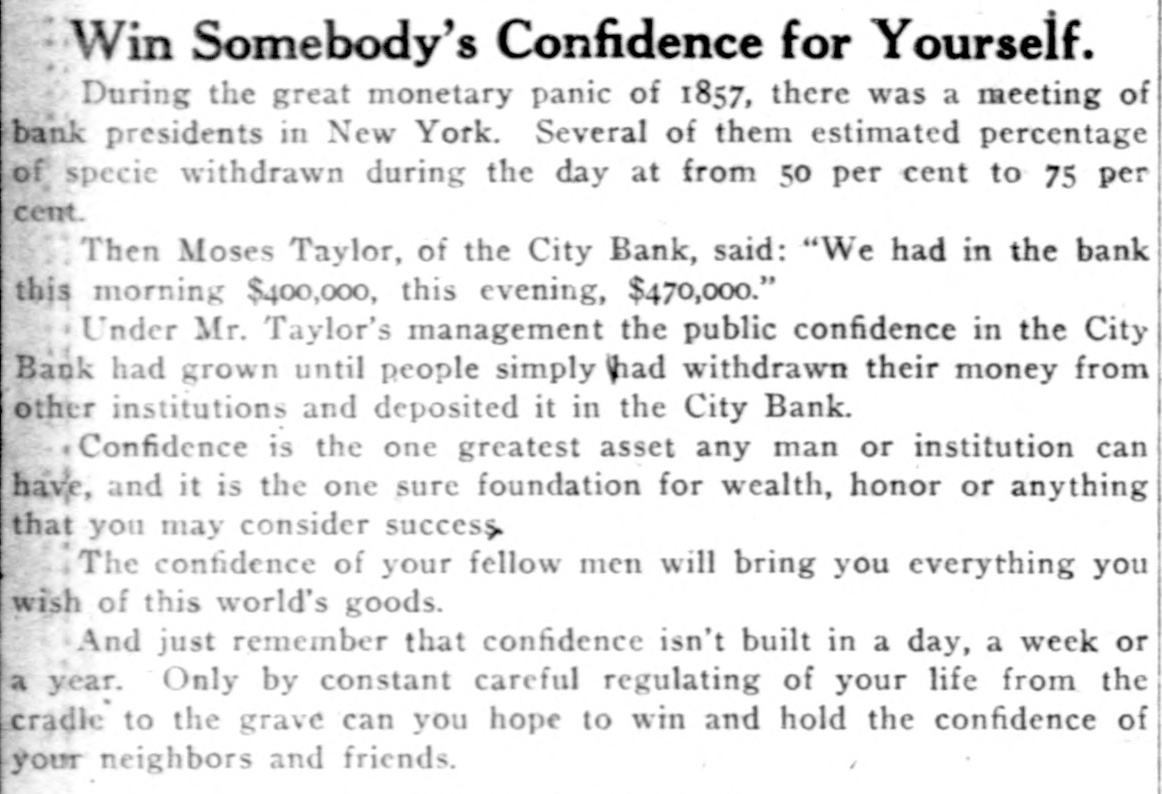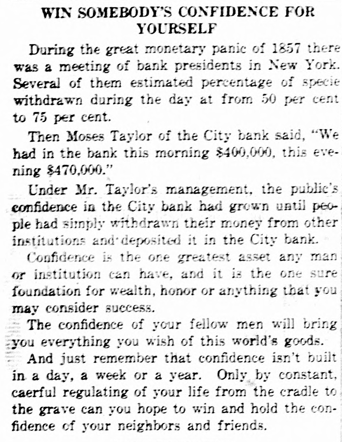 Win Somebody's Confidence for Yourself. During the great monetary panic of 1857, there was a meeting of bank presidents in New York. Several of them estimated percentage of specie withdrawn during the day at from 50 per cent to 75 per cent. Then Moses Taylor, of the City Bank, said: "We had in the bank this morning $400,000, this evening, $470,000." Under Mr. Taylor's management the public confidence in the City Bank had grown until people simply had withdrawn their money from other institutions and deposited it in the City Bank. Confidence is the one greatest asset any man or institution can have, and it is the one sure foundation for wealth, honor or anything that you may consider success The confidence of your fellow men will bring you everything you wish of this world's goods. And just remember that confidence isn't built in a day, a week or a year. Only by constant careful regulating of your life from the cradle to the grave can you hope to win and hold the confidence of your neighbors and friends.