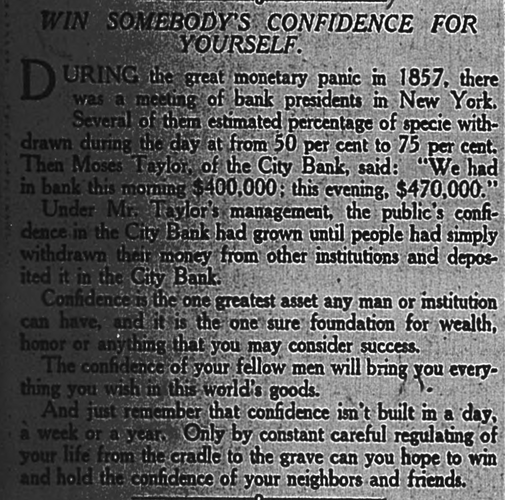 WIN SOMEBODY'S CONFIDENCE FOR YOURSELF During the great monetary panic of 1857 there was a meeting of bank presidents in New York. Several of them estimated percentage of specie withdrawn during the day at from 50 per cent to 75 per cent. Then Moses Taylor of the City bank said, "We had in the bank this morning $400,000, this evening $470,000." Under Mr. Taylor's management, the public's confidence in the City bank had grown until people had simply withdrawn their money from other institutions and deposited it in the City bank. Confidence is the one greatest asset any man or institution can have, and it is the one sure foundation for wealth, honor or anything that you may consider success. The confidence of your fellow men will bring you everything you wish of this world's goods. And just remember that confidence isn't built in a day, a week or a year. Only by constant, caerful regulating of your life from the cradle to the grave can you hope to win and hold the confidence of your neighbors and friends.