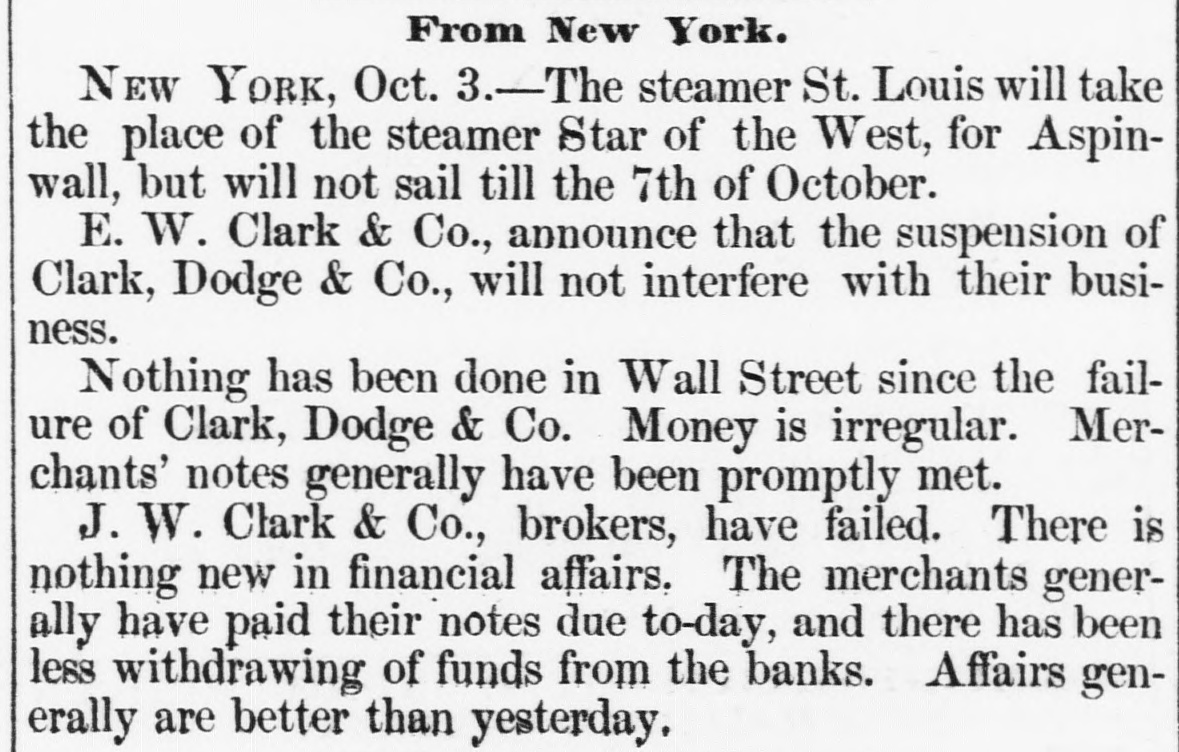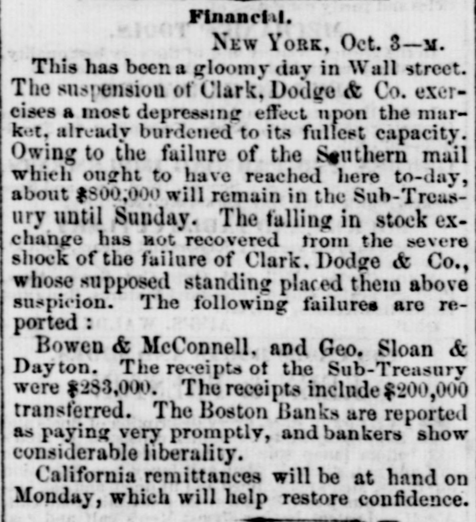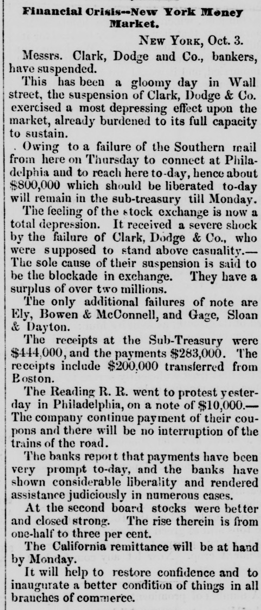 BY TELEGRAPH. FOREIGN-PER STEAMER ARABIA. NEW YORK, Oct. 2.-Cotton, middling qualities improved 1. Sales Saturday estimated at 6000 bales, closing quiet but steady. Middling Orleans 9 5-16; Mobile 91; Upland 91. Stock in port 312,500 bales, of which 21,9000 bales are American.New Orleans tres ordenaire at Havre 126. Sales of the week 18,000. Breadstuffs quiet; flour advancing; provisions declining. Manchester advices favorable. Bullion decreased 278,000 pounds. American securities unchanged; more buyers than sellers. London, Sept. 19.-By Telegraph.-The dissatisfaction with Indian news strengthens the belief that a loan must be affected. The discount market is extremely brisk. Wm. Summerville, silk manufacturer at Manchester, has failed. Reported failures at New York: Swift, Robinson & Co.; Pomell, Ramsdell & Co.; Brummel & Roysters, P. Chonteau; Hutchings, Tiffany & Co. At Boston: Sharons, Pond & Co. A Minnesota despatch announces the arrest of the Fairbault land warrant thieves and the recovery of all the warrants except five. PHILADELPHIA, Oct. 3.-The Reading railroad bonds went to protest yesterday. NEW YORK, Oct. 3.-Clark, Dodge & Co., Bankers have suspended. E. W. Clark & Co., say that the above suspension will not interfere with their business. The stockholders of the Erie railroad met last evening and passed a resolution appointing a committee of one hundred to solicit subscriptions to bonds or loans to the company; $175,000 was subscribed. PITTSBURG, Oct. 3.-A meeting of merchants at noon justify the suspension of the Pennsylvania Banks, and ask the Governor to extend Legislature aid to mitigate the penalties till resumption. NEW YORK, Oct. 3.-Money irregular but a better feeling exists. Notes were generally met promptly. Gage, Sloan & Dalton and Ely Brown & McConnel have failed. Cotton dull; Flour active; Wheat declining Corn mixed 70a71c.; Pork dull; Beef and Bacon heavy; Lard 12}a14{c; Oats quiet; Tallow 10}allc; Sugar and Coffee dull. At the close of business, a more cheerful aspect prevailed. PROVIDENCE, Oct. 3.-The Rhode Island Central Bank has been temporarily enjoined on application of the Bank Commissioners. Their assets are believed to abundant. SPRINGFIELD, Oct. 3.-The trot between Flora Temple in harness and Lancet under saddle, was won by Flora in three straight heats. The last mile in 2:32. BOSTON, Oct. 3.-Financially, the day passed better than anticipated. Clark & Co., Bankers, and S. Frothingham & Co., Commission Dry Goods Merchauts, have failed. A few smaller failures have al o occurred. The business community was more cheerful at the close. ST. LOUIS, Oct. 3.-About sixty Missourians are encamped at Sugar Creek. Linn county, Kansas, for the purpose of voting. The Free State men have sent to Lawrence for arms to protect themselvos and the polls. CINCINNATI, Oct. 3.-No important failures.-" No first class paper protested. Bussness closed much more favorably than antic pated.