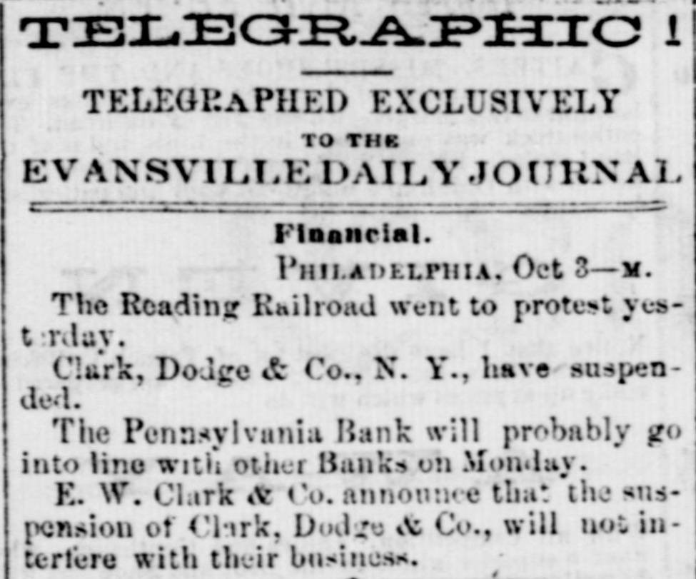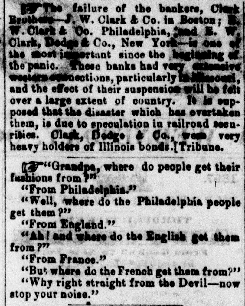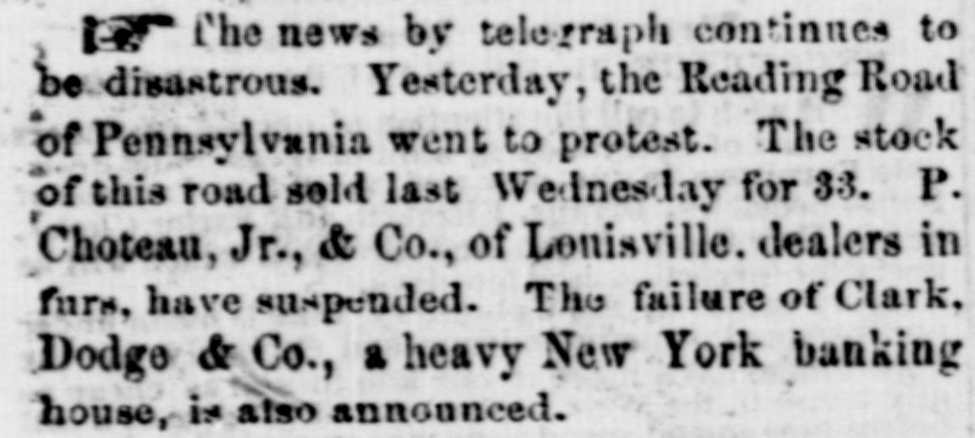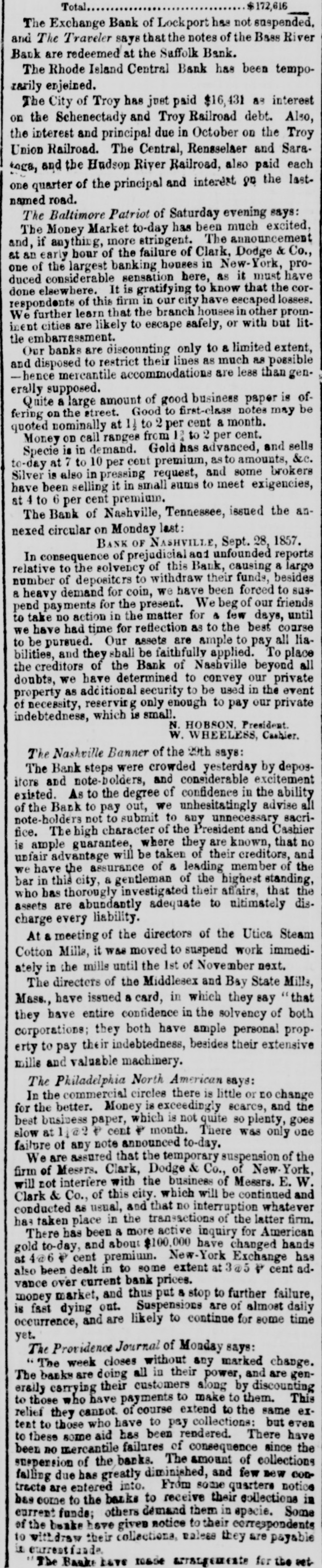 BY TELEGRAPH. FOREIGN-PER STEAMER ARABIA. NEW YORK, Oct. 2.-Cotton, middling qualities improved 1. Sales Saturday estimated at 6000 bales, closing quiet but steady. Middling Orleans 9 5-16; Mobile 91; Upland 91. Stock in port 312,500 bales, of which 21,9000 bales are American.New Orleans tres ordenaire at Havre 126. Sales of the week 18,000. Breadstuffs quiet; flour advancing; provisions declining. Manchester advices favorable. Bullion decreased 278,000 pounds. American securities unchanged; more buyers than sellers. London, Sept. 19.-By Telegraph.-The dissatisfaction with Indian news strengthens the belief that a loan must be affected. The discount market is extremely brisk. Wm. Summerville, silk manufacturer at Manchester, has failed. Reported failures at New York: Swift, Robinson & Co.; Pomell, Ramsdell & Co.; Brummel & Roysters, P. Chonteau; Hutchings, Tiffany & Co. At Boston: Sharons, Pond & Co. A Minnesota despatch announces the arrest of the Fairbault land warrant thieves and the recovery of all the warrants except five. PHILADELPHIA, Oct. 3.-The Reading railroad bonds went to protest yesterday. NEW YORK, Oct. 3.-Clark, Dodge & Co., Bankers have suspended. E. W. Clark & Co., say that the above suspension will not interfere with their business. The stockholders of the Erie railroad met last evening and passed a resolution appointing a committee of one hundred to solicit subscriptions to bonds or loans to the company; $175,000 was subscribed. PITTSBURG, Oct. 3.-A meeting of merchants at noon justify the suspension of the Pennsylvania Banks, and ask the Governor to extend Legislature aid to mitigate the penalties till resumption. NEW YORK, Oct. 3.-Money irregular but a better feeling exists. Notes were generally met promptly. Gage, Sloan & Dalton and Ely Brown & McConnel have failed. Cotton dull; Flour active; Wheat declining Corn mixed 70a71c.; Pork dull; Beef and Bacon heavy; Lard 12}a14{c; Oats quiet; Tallow 10}allc; Sugar and Coffee dull. At the close of business, a more cheerful aspect prevailed. PROVIDENCE, Oct. 3.-The Rhode Island Central Bank has been temporarily enjoined on application of the Bank Commissioners. Their assets are believed to abundant. SPRINGFIELD, Oct. 3.-The trot between Flora Temple in harness and Lancet under saddle, was won by Flora in three straight heats. The last mile in 2:32. BOSTON, Oct. 3.-Financially, the day passed better than anticipated. Clark & Co., Bankers, and S. Frothingham & Co., Commission Dry Goods Merchauts, have failed. A few smaller failures have al o occurred. The business community was more cheerful at the close. ST. LOUIS, Oct. 3.-About sixty Missourians are encamped at Sugar Creek. Linn county, Kansas, for the purpose of voting. The Free State men have sent to Lawrence for arms to protect themselvos and the polls. CINCINNATI, Oct. 3.-No important failures.-" No first class paper protested. Bussness closed much more favorably than antic pated.