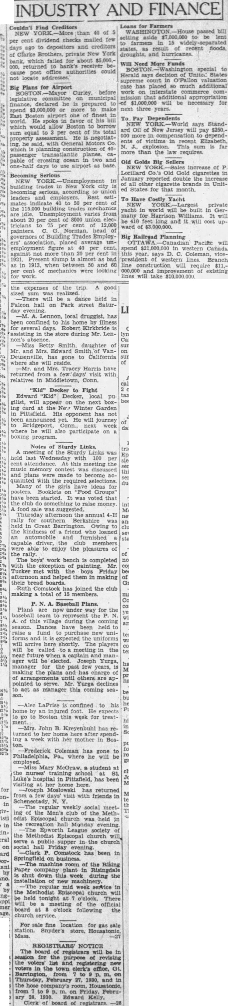 John B. Kreyenbuhl has turned her ing week with her mother in Bos-Frederick Coleman has gone to Philadelphia, Pa., where he will be -Miss Mary McGraw. student the nurses' training school at St. Luke's hospital in Pittsfield, has been visiting her home here. -Joseph has returned from few days' visit with friends in Schenectady, regular weekly social meeting of the Men's club of the Methodist Episcopal church held the Monday evening Epworth League society the Methodist Episcopal church serve public supper in the church social hall Friday evening. '-Clark P. Comstock has been in Springfield on business. machine room of the Rising Paper company plant in Risingdale is shut down this week during the installation of new machinery. regular mid week service in the church will be held tonight at o'clock. There will meeting of the official board at o'clock following the church service.
