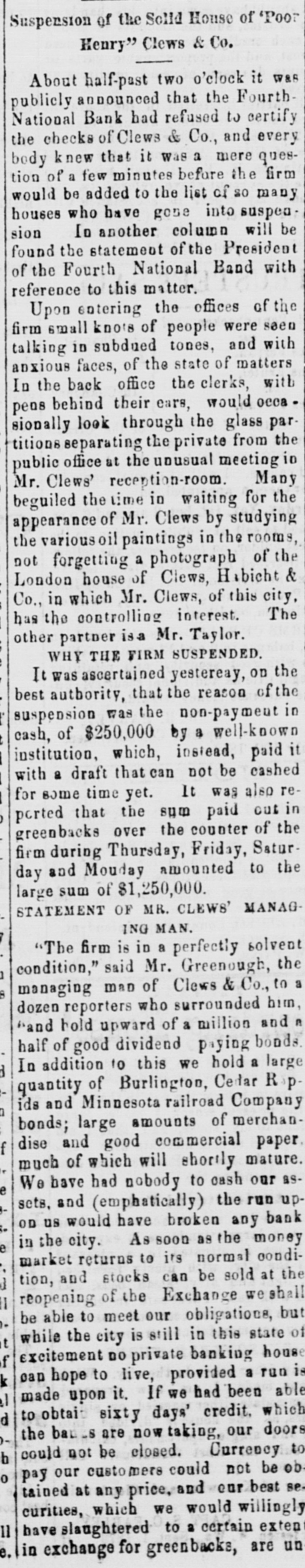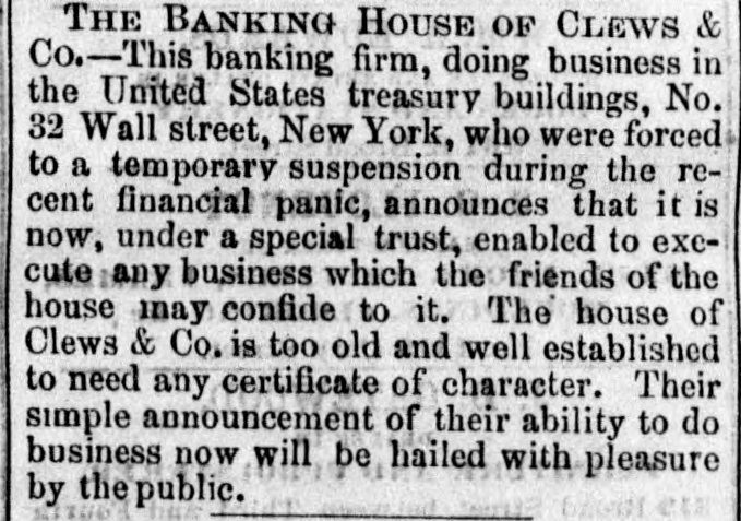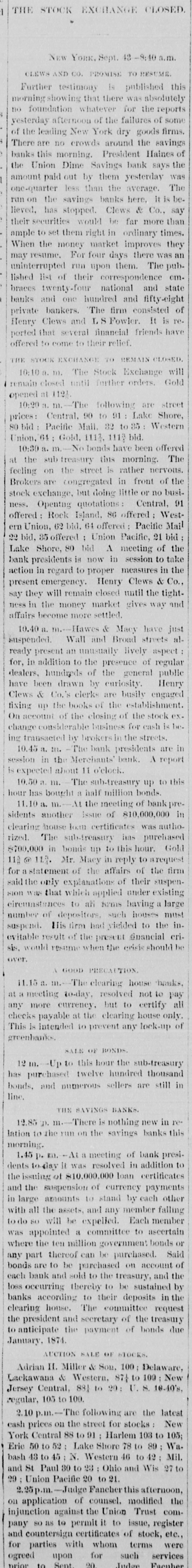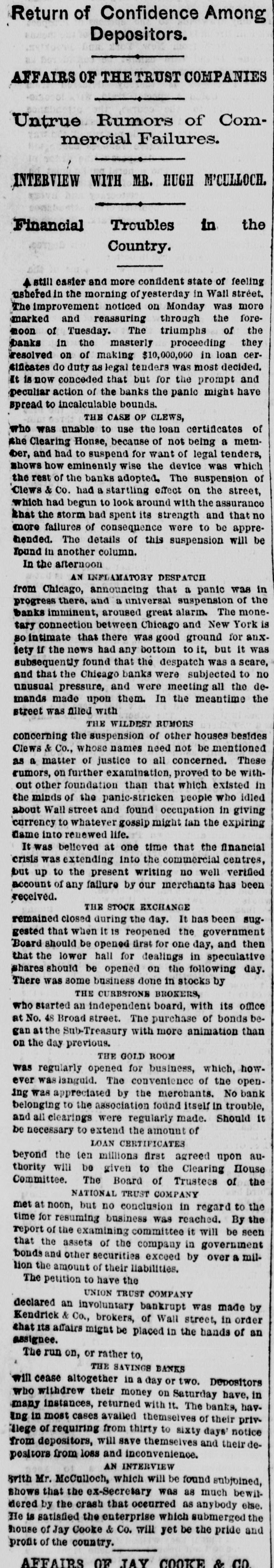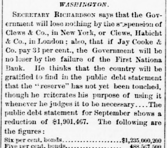 good, but I won't. You may state, however, that I have abiding confidence in the integrity of ex-Governor Cooke, and the firm of Jay Cooke & Co., and I believe that all moneys held by him in trust in a fiduciary capacity will be paid, even if he has to sacrifice his property. Reporter.-Does his appointment by the board make him a government officer? Mr. Sargent.-Certainly; and as such he bonds under the law governing such officers, and gives bonds for the faithful performance of the duties. ### OTHER DISTRICT CHARITIES AFFECTED BY THE CRASH. It is stated that there was deposited in the First National bank $20,000 to the credit of the St. John's Sisterhood, a charity connected with the Fpiscopal church of St. John's; $10,000 o the uninvested funds of the Smithsonian Institution; $11,000 belonging to the Soldiers' and Sailors' Orphan Home, of which ex-Governor Cooke acted as trustee and treasurer-from the sum set apart for its appropriation by Congress a warrant for $15,000 had been drawn, of which vouchers for $4,000 have been audited, leaving an unexpended balance of $11,000. ### OTHER HEAVY DEPOSITORS. It is said that ex-President Andrew Johnson had $60,000 to his credit in the First National bank, on which he was receiving six per cent. interest; Senator Patterson, of South Carolina, $14,000 in one of the suspended banks; Admiral Rowan, $6,000. Mrs. Wm. H. Scott, widow of a former navy agent, had $17,000, the proceeds of the sale of all the property she had. Gen. Hunter had a handsome credit in Jay Cooke & Co.'s. Col. Webster, register of wills, had all his savings deposited there. ### THE STOCK OF THE FIRST NATIONAL. Of the five thousand shares of the First National bank, about thirty-five hundred shares are owned either by Jay Cooke & Co. or individual members of the firm. ### OUR BANKS TO-DAY. Matters financial are in their normal condition throughout the city to-day, and the banks are transacting business as usual. Many depositors who drew their money under the prevailing excitement have returned their funds and express the fullest confidence in the security of the banks. The general conviction is that a portion of the community here became unduly and unnecessarily frightened. ### MR. STICKNEY, OF THE FREEDMAN'S SAVINGS BANK, says the reason that institution deemed it expedient to require the legal notice of sixty days for those desiring to withdraw their deposits was because all the books which had not such notice posted therein were now paid, and that the failure of Clews & Co., announced yesterday, left bank officers in the dark as to where the trouble would end. He deemed it a matter of prudence to require the full legal notice. Payment, however, in special cases, are being made.