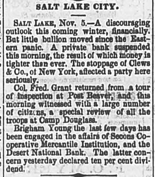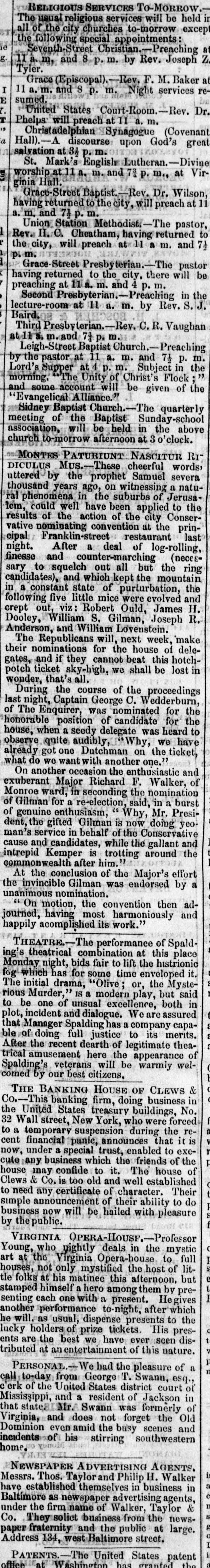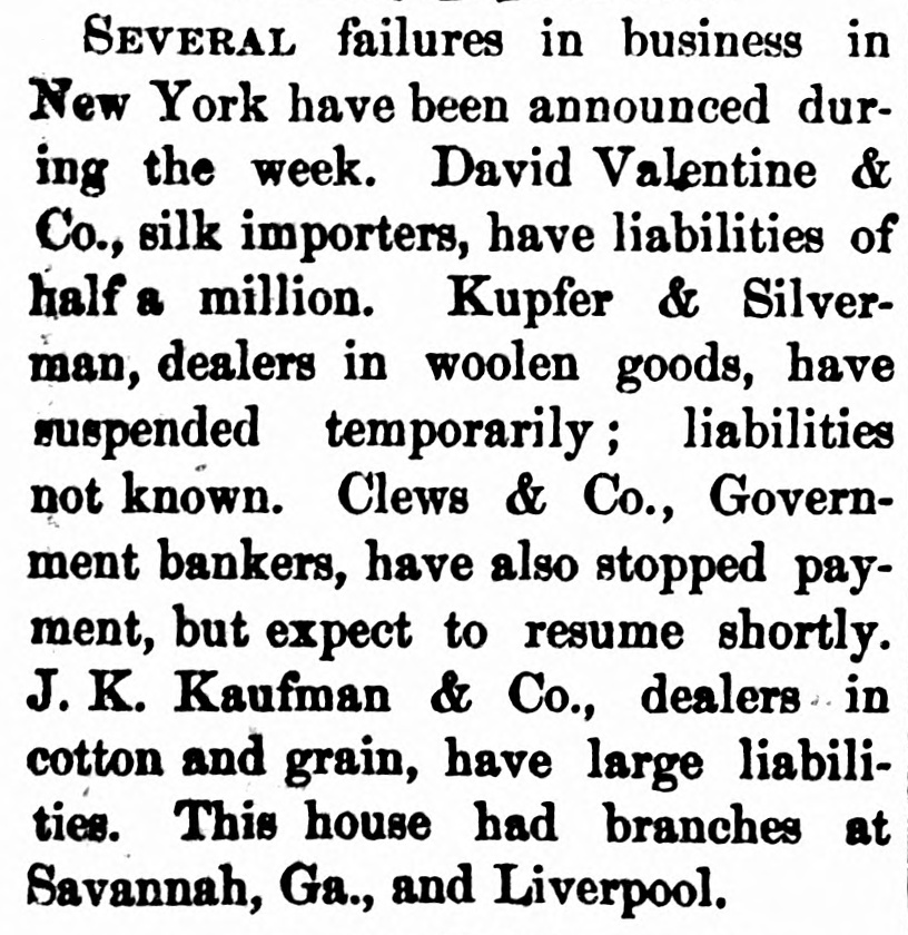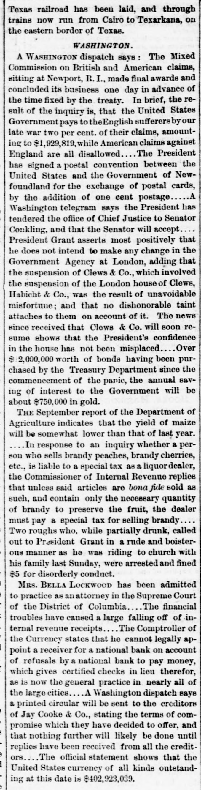 good, but I won't. You may state, however, that I have abiding confidence in the integrity of ex-Governor Cooke, and the firm of Jay Cooke & Co., and I believe that all moneys held by him in trust in a fiduciary capacity will be paid, even if he has to sacrifice his property. Reporter.-Does his appointment by the board make him a government officer? Mr. Sargent.-Certainly; and as such he bonds under the law governing such officers, and gives bonds for the faithful performance of the duties. ### OTHER DISTRICT CHARITIES AFFECTED BY THE CRASH. It is stated that there was deposited in the First National bank $20,000 to the credit of the St. John's Sisterhood, a charity connected with the Fpiscopal church of St. John's; $10,000 o the uninvested funds of the Smithsonian Institution; $11,000 belonging to the Soldiers' and Sailors' Orphan Home, of which ex-Governor Cooke acted as trustee and treasurer-from the sum set apart for its appropriation by Congress a warrant for $15,000 had been drawn, of which vouchers for $4,000 have been audited, leaving an unexpended balance of $11,000. ### OTHER HEAVY DEPOSITORS. It is said that ex-President Andrew Johnson had $60,000 to his credit in the First National bank, on which he was receiving six per cent. interest; Senator Patterson, of South Carolina, $14,000 in one of the suspended banks; Admiral Rowan, $6,000. Mrs. Wm. H. Scott, widow of a former navy agent, had $17,000, the proceeds of the sale of all the property she had. Gen. Hunter had a handsome credit in Jay Cooke & Co.'s. Col. Webster, register of wills, had all his savings deposited there. ### THE STOCK OF THE FIRST NATIONAL. Of the five thousand shares of the First National bank, about thirty-five hundred shares are owned either by Jay Cooke & Co. or individual members of the firm. ### OUR BANKS TO-DAY. Matters financial are in their normal condition throughout the city to-day, and the banks are transacting business as usual. Many depositors who drew their money under the prevailing excitement have returned their funds and express the fullest confidence in the security of the banks. The general conviction is that a portion of the community here became unduly and unnecessarily frightened. ### MR. STICKNEY, OF THE FREEDMAN'S SAVINGS BANK, says the reason that institution deemed it expedient to require the legal notice of sixty days for those desiring to withdraw their deposits was because all the books which had not such notice posted therein were now paid, and that the failure of Clews & Co., announced yesterday, left bank officers in the dark as to where the trouble would end. He deemed it a matter of prudence to require the full legal notice. Payment, however, in special cases, are being made.
