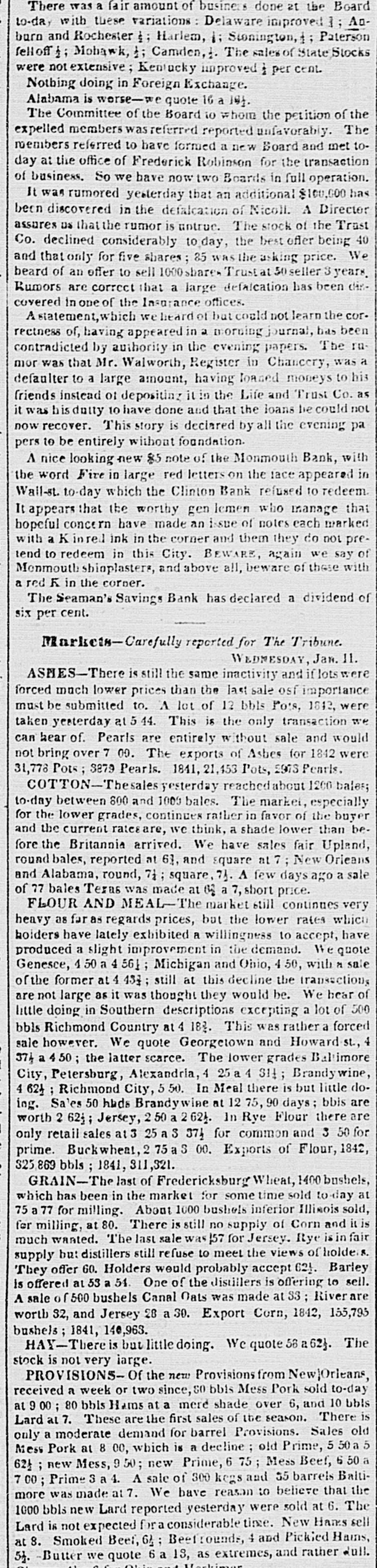 : n felloff ; Mohawk, 1; Camden, 1. The sales of State Stocks were not extensive; Kenjucky improved : per cent. Nothing doing in Foreign Exchange. Alabama is worse-we quote 16 a 194. The Committee of the Board to whom the petition of the expelled members was referred reported unfavorably. The members referred to have formed a new Board and met today at the office of Frederick Robinson for the transaction of business. So we have now two Boards in full operation. It was rumored yesterday that an additional $100,000 has been discovered in the defalcation of Nicoll. A Director assures us that the rumor is untrue. The stock of the Trust Co. declined considerably to day, the best offer being 40 and that only for five shares; 85 was the asking price. We beard of an offer to sell 1000 share. Trust at is seller 3 years. Kumors are correct that a large defalcation has been discovered in one of the Insurance offices. Astatement,whice welleard of but could not learn the correctness of, having appeared in a morning journal, has been contradicted by authority in the evening papers. The rumor was that Mr. Walworth, Register in Chancery, was a defaulter to a large amount, having loaned moneys to his friends instead of depositing it in the Life and Trust Co. as it was his dutty 10 have done and that the loans be could not now recover. This story is declared by all the evening pa pers to be entirely without foundation. A nice looking new 85 note of the Monmouth Bank, with the word Fire in large red letters on the lace appeared in Wall-st. o-day which the Clinton Bank refused to redeem. It appears that the worthy gen lemen who manage that hopeful concern have made an issue of notes each marked with a K inred ink in the corner and them they do not pretend to redeem in this City. BEWARE, again we say of Menmouth shinplasters, and above all, beware of these with a red K in the corner. The Seaman's Savings Bank has declared a dividend of six per cent. Markets-Carefully reported for The Tribune. WEDNESDAY, Jan. 11. ASHES-There is still the same inactivity and if lots were forced much lower prices than the last sale osf importance must be submitted to. A lot of 12 bbls Pots, 1842, were taken yesterday at 544. This is the only transaction we can hear of. Pearls are entirely without sale and would not bring over 7 00. The exports of Ashes for 1842 were 31,776 Pots 3879 Pearls. 1841, 21,453 Pots, 2978 Pearls. COTTON-Thesalesyesterday reached about 1200 baler; to-day between 800 and 1000 bales. The market, especially for the lower grades, continues rather in favor of the buyer and the current rates are, we think, a shade lower than before the Britannia arrived. We have sales fair Upland, round bales, reported at 61, and square at 7; New Orieans and Alabama, round, 71: square, 71. A few days ago a sale of 77 bales Teras was made at or a 7, short price. FLOUR AND MEAL-TH market still continues very heavy as far as regards prices, but the lower rates which holders have lately exhibited a willingness to accept, have produced a slight improvement in the demand. We quote Genesce, 450 a 4 561 ; Michigan and Ohio, 4 50, with M sale of the former at 4434 still at this decline the transaction, are not large as it was thought they would be. We hear of little doing in Southern descriptions excepting a lot of 500 bbls Richmond Country at 4 183. This was rather a forced sale however. We quote Georgetown and Howard st., 4 374 a 450; the latter scarce. The lower grades Baltimore City, Petersburg, Alexandria, 4 25 a 4 311; Brandywine, 4 621 : Richmond City, 5 50. In Meal there is but little doing. Sales 50 hads Brandywine at 12 75, 90 days; bbis are worth 2 62j; Jersey, 2 50 a 2624. In Rye Flour there are only retail sales at 25 a S 374 for common and 3 50 for prime. uckwheat, 25 a 3 00. Exports of Flour, 1842, 325,869 bbls; 1841, 311,321. GRAIN-The last of Fredericksburg Wheat, 1400 bushels, which has been in the market for some time sold to day at 75 a 77 for milling. About 1000 bushels inferior Illinois sold, for milling, at 80. There is still no supply of Corn and it is much wanted. The last sale was 157 for Jersey. Rye isin fair supply but distillers still refuse to meet the views of holder 8. They offer 60. Holders would probably accept 621. Barley is offered at 53 a 54. One of the distillers is offering to sell. A sale of 500 bushels Canal Oats was made at 33 ; River are worth 32, and Jersey 28 a 30. Export Corn, 1842, 155,795 bushels ; 1841, 140,963. HAY-There but little doing. We quote 58 a .62}. The stock is not very large. PROVISIONS- Of the new Provisions from New|Orleans, received a week or two since, SO bbis Mess Pork sold to-day at 9 00 ; 80 bbis Hams at a mere shade over 6, and 10 bbls Lard at 7. These are the first sales of the season. There is only a moderate demand for barrel Provisions. Sales old Mess Pork at 8 00, which is a decline ; old Prime, 5 50 a 5 62) ; new Mess, 9 50; new Prime, 75; Mess Beef, 6 50 a 700; Prime 3 4. A sale of 300 kegs and 35 barrels Baitimore was made at 7. We have reasan to believe that the 1000 bbls new Lard reported yesterday were sold at 6. The Lard is not expected fora considerable time. New Hams sell at 8. Smoked Beef, 64 ; Beefrounds 4 and Pickled Hains, 5 -Butter we quote 6 a 13, as extremes, and rather dull.