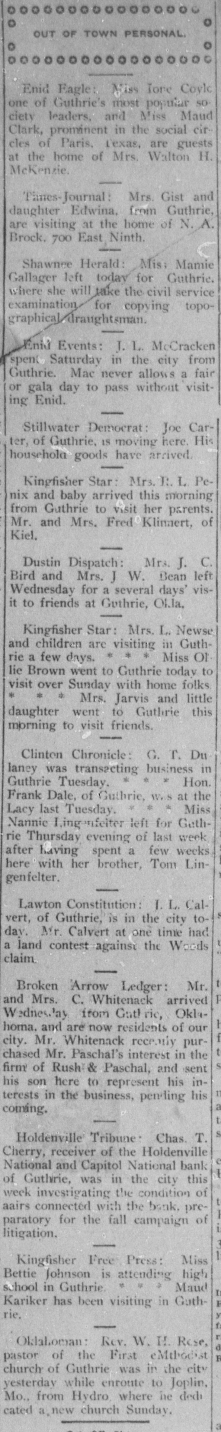 o 00000000000000000 Enid Eagle: Miss Tone Coyle one of Guthrie's most popular so ciety leaders, and Miss Maud Clark, prominent in the social circles of Paris, Texas, are guests at the home of Mrs. Walton H. McKenzie. Thres-Journal: Mrs. Gist and daughter Edwina, from Guthrie, are visiting at the home of N. A. Brock. 700 East Ninth. Shawnee Herald: Mis; Mamie Gallager left today for Guthrie. where she will take the civil service examination for copying topographical draughtsman. Enid Events: J.L. McCracken spent Saturday in the city from Guthrie. Mac never allows a fair or gala day to pass without visiting Enid. Stillwater Democrat: Joe Carter, of Guthrie, IS moving here. His househola goods have arrived. I Kingfisher Star: Mrs. R. L. Penix and baby arrived this morning from Guthrie to visit her parents. Mr. and Mrs. Fred Klinnert, of Kiel. I Dustin Dispatch: Mrs. J. C. Bird and Mrs. J W. Bean left Wednesday for a several days' visit to friends at Guthrie, Okla, Kingfisher Star: Mrs. L. Newse and children are visiting in Guthrie a few days. * * * Miss Of lie Brown went to Guthrie today to visit over Sunday with home folks * * * Mrs. Jarvis and little daughter went to Guthrie this morning to visit friends. I Clinton Chronicle: G. T. Du laney was transacting business in Guthrie Tuesday. * * * Hon. Frank Dale, of Guthrie, Was at the Lacy last Tuesday. * * Miss Nannic Lingenfeiter left for Gethrie Thursday evening of last week after having spent a few weeks here with her brother, Tom Lingenfelter. I Lawton Constitution: I.L. Calvert, of Guthrie, is in the city today. Mr. Calvert at one time had a land contest against the Woods 3 claim Broken Arrow Ledger: Mr. P and Mrs. C. Whitenack arrived Wednesday irom Gathric, OklaI homa. and are now residents of our f city. Mr. Whitenack recemly purchased Mr. Paschal's interest in the S firm of Rush Paschal, and sent his son here to represent his in11 terests in the business, pending his a coming. I t. S Holdenville Tribune: Chas. T. Cherry, receiver of the Holdenville e National and Capitol National bank I of Guthrie, was in the city this week invesrigating the condition of aairs connectΓ©d with the bank. preI paratory for the fall campaign of i litigation. I DE Kingfisher Free Press: Miss Bettie Johnson is attending high school in Guthrie. * = * Maud If E Kariker has been visiting in Guthy rie, fa r Oklahoman: Rev. W. H. Rese, d R pastor of the First eMthodist church of Guthrie was in the city yesterday while enroute to Joplin,