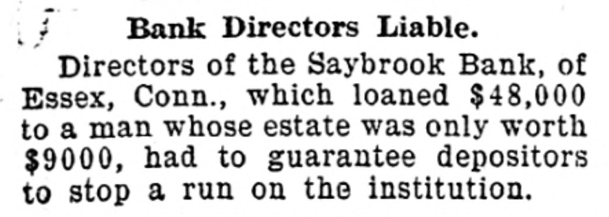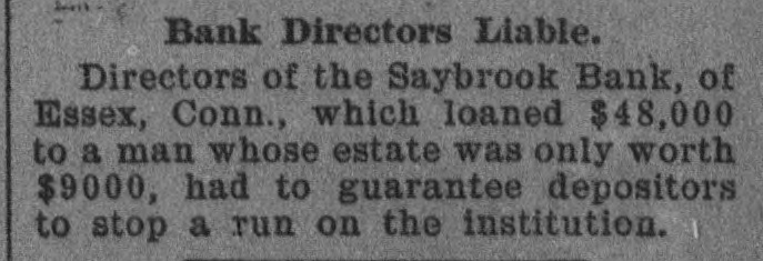 britBank Directors Liable. Directors of the Saybrook Bank, of Essex, Conn., which loaned $48,000 to a man whose estate was only worth $9000, had to guarantee depositors I to stop a run on the institution.