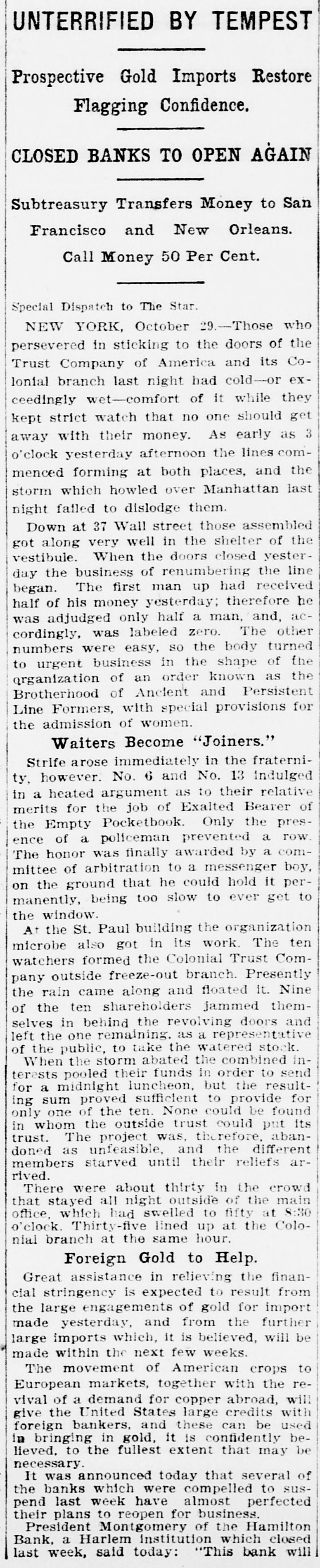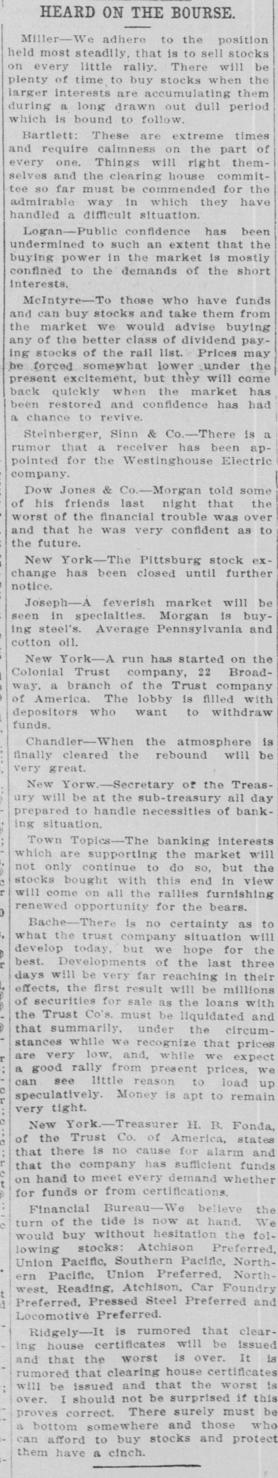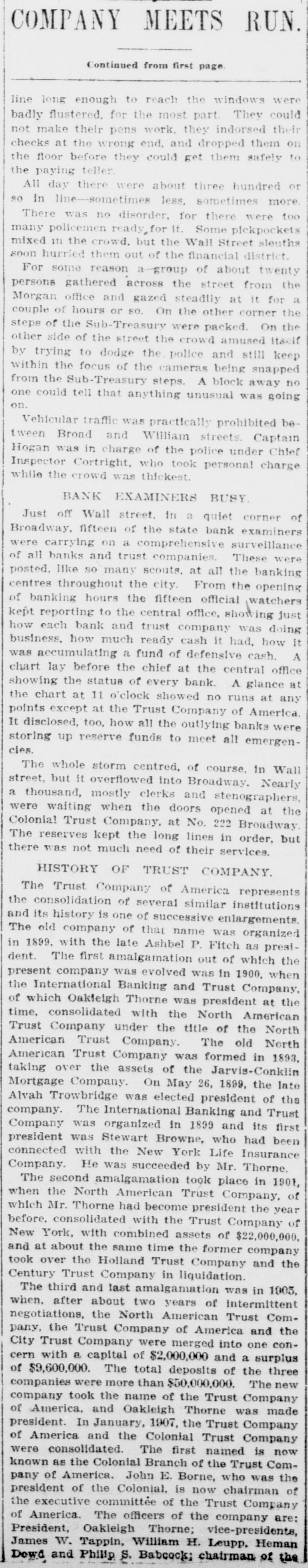COMPANY MEETS RUN. Continued from first page line long enough to reach the windows were badly flustered, for the most part. They could not make their pens work. they indorsed their checks at the wrong end. and dropped them on the floor before they could get them safely to the paying teller All day there were about three hundred or so in line-sometimes less, sometimes more There was no disorder. for there were too many policement ready for It. Some pickpockets mixed in the crowd. but the Wall Street sleuths soon hurried them out of the financial district. For some reason group of about twenty persons gathered across the street from the Morgan office and gazed steadlly at it for a couple of hours or so. On the other corner the steps of the Sub-Treasury were packed. On the other side of the street the crowd amused itself by trying to dodge the police and still keep within the focus of the cameras being snapped from the Sub-Treasury steps. A block away no one could tell that anything unusual was going on. Vehicular traffic was practically prohibited between Broad and William streets. Captain Hogan was in charge of the police under Chief Inspector Cortright, who took personal charge while the crowd was thickest. BANK EXAMINERS BUSY Just off Wall street. in a quiet corner of Broadway, fifteen of the state bank examiners were carrying on a comprehensive surveillance of all banks and trust companies. These were posted. like so many scouts, at all the banking centres throughout the city. From the opening of banking hours the fifteen official watchers kept reporting to the central office, showing just how each bank and trust company was doing business, how much ready cash it had, how it was accumulating a fund of defensive cash. A chart lay before the chief at the central office showing the status of every bank. A glance at the chart at 11 o'clock showed no runs at any points except at the Trust Company of America. It disclosed, too, how all the outlying banks were storing up reserve funds to meet all emergencies. The whole storm centred, of course, in Wall street, but it overflowed into Broadway. Nearly a thousand, mostly clerks and stenographers, were waiting when the doors opened at the Colonia! Trust Company, at No. 222 Broadway. The reserves kept the long lines in order, but there was not much need of their services. HISTORY OF TRUST COMPANY. The Trust Company of America represents the consolidation of several similar institutions and its history is one of successive enlargements. The old company of that name was organized in 1899, with the late Ashbel P. Fitch as president. The first amalgamation out of which the present company was evolved was in 1900, when the International Banking and Trust Company, of which Oakleigh Thorne was president at the time, consolidated with the North American Trust Company under the title of the North American Trust Company. The old North American Trust Company was formed in 1893, taking over the assets of the Jarvis-Conklin Mortgage Company. On May 26, 1899, the late Alvah Trowbridge was elected president of the company. The International Banking and Trust Company was organized in 1899 and its first president was Stewart Browne, who had been connected with the New York Life Insurance Company. He was succeeded by Mr. Thorne. The second amalgamation took place in 1901, when the North American Trust Company, of which Mr. Thorne had become president the year before. consolidated with the Trust Company of New York, with combined assets of $22,000,000. and at about the same time the former company took over the Holland Trust Company and the Century Trust Company in liquidation. The third and last amalgamation was in 1903, when. after about two years of intermittent negotiations, the North American Trust Company, the Trust Company of America and the City Trust Company were merged into one concern with a capital of $2,000,000 and a surplus of $9,600,000. The total deposits of the three companies were more than $50,000,000. The new company took the name of the Trust Company of America, and Oakleigh Thorne was made president. In January, 1907, the Trust Company of America and the Colonial Trust Company were consolidated. The first named is now known as the Colonial Branch of the Trust Company of America. John E. Borne, who was the president of the Colonial. is now chairman of the executive committee of the Trust Company of America. The officers of the company are: President, Oakleigh Thorne; vice-presidents, James W. Tappin, William H. Leupp. Heman Dowd and Philip S. Babcock; chairman of the
