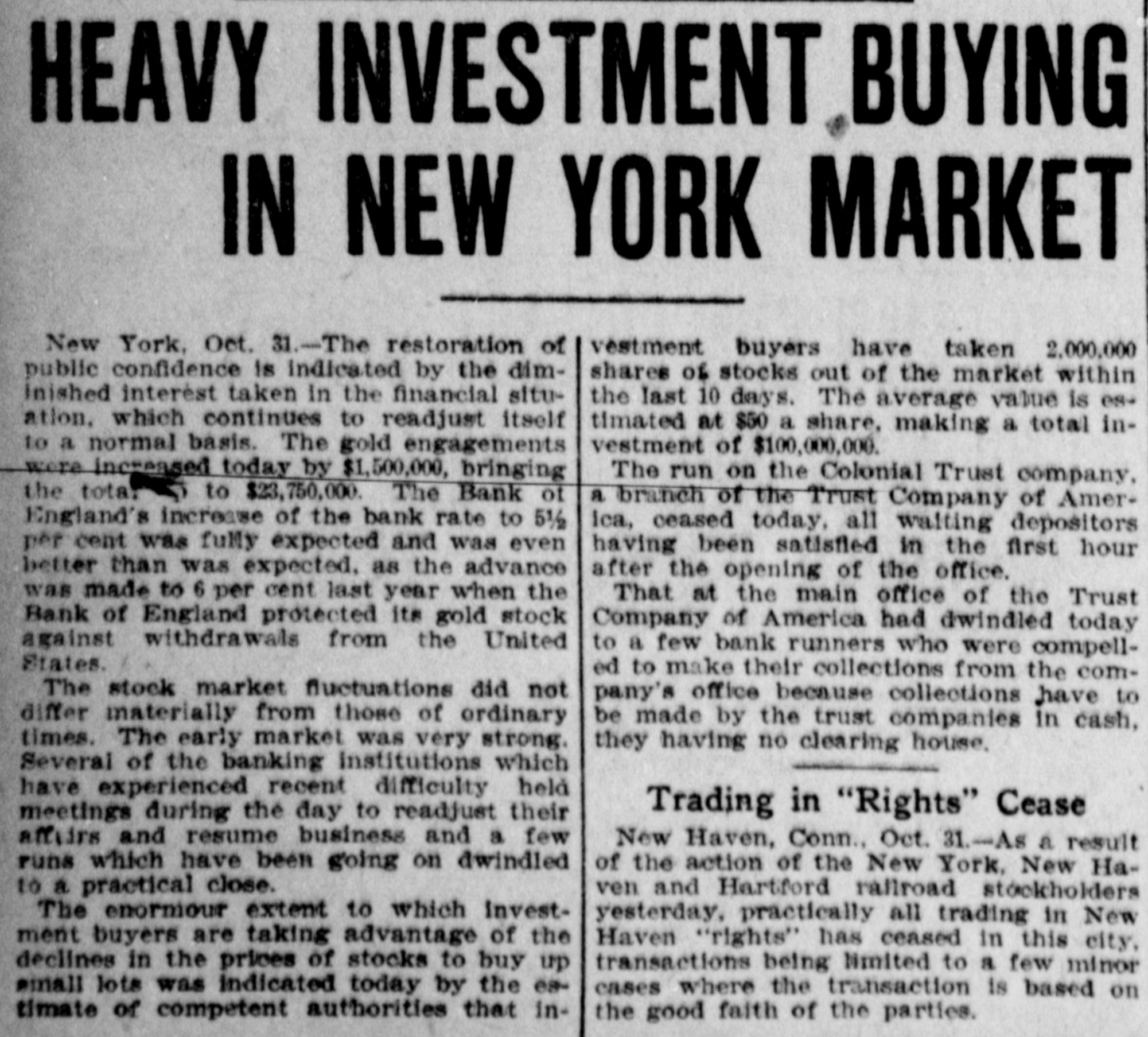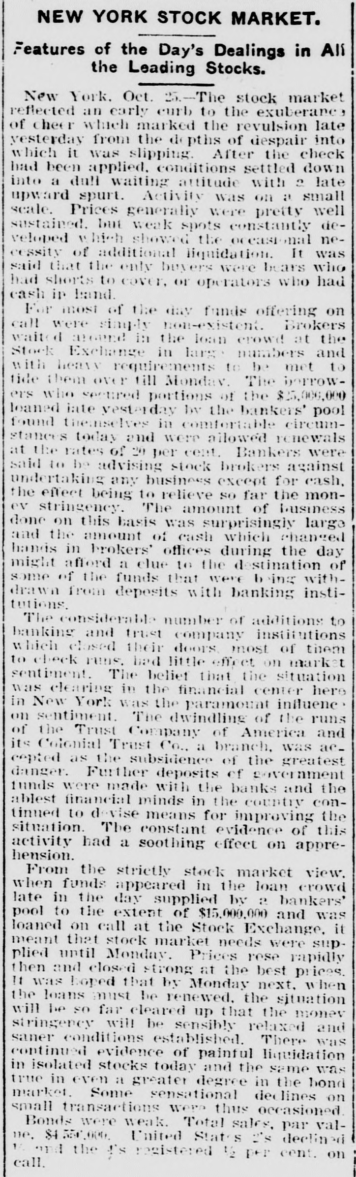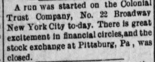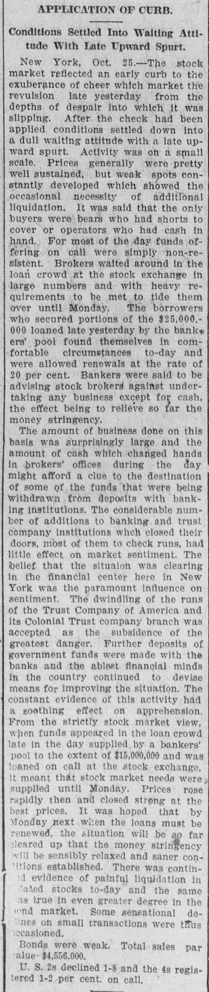COMPANY MEETS RUN. Continued from first page line long enough to reach the windows were badly flustered, for the most part. They could not make their pens work. they indorsed their checks at the wrong end. and dropped them on the floor before they could get them safely to the paying teller All day there were about three hundred or so in line-sometimes less, sometimes more There was no disorder. for there were too many policement ready for It. Some pickpockets mixed in the crowd. but the Wall Street sleuths soon hurried them out of the financial district. For some reason group of about twenty persons gathered across the street from the Morgan office and gazed steadlly at it for a couple of hours or so. On the other corner the steps of the Sub-Treasury were packed. On the other side of the street the crowd amused itself by trying to dodge the police and still keep within the focus of the cameras being snapped from the Sub-Treasury steps. A block away no one could tell that anything unusual was going on. Vehicular traffic was practically prohibited between Broad and William streets. Captain Hogan was in charge of the police under Chief Inspector Cortright, who took personal charge while the crowd was thickest. BANK EXAMINERS BUSY Just off Wall street. in a quiet corner of Broadway, fifteen of the state bank examiners were carrying on a comprehensive surveillance of all banks and trust companies. These were posted. like so many scouts, at all the banking centres throughout the city. From the opening of banking hours the fifteen official watchers kept reporting to the central office, showing just how each bank and trust company was doing business, how much ready cash it had, how it was accumulating a fund of defensive cash. A chart lay before the chief at the central office showing the status of every bank. A glance at the chart at 11 o'clock showed no runs at any points except at the Trust Company of America. It disclosed, too, how all the outlying banks were storing up reserve funds to meet all emergencies. The whole storm centred, of course, in Wall street, but it overflowed into Broadway. Nearly a thousand, mostly clerks and stenographers, were waiting when the doors opened at the Colonia! Trust Company, at No. 222 Broadway. The reserves kept the long lines in order, but there was not much need of their services. HISTORY OF TRUST COMPANY. The Trust Company of America represents the consolidation of several similar institutions and its history is one of successive enlargements. The old company of that name was organized in 1899, with the late Ashbel P. Fitch as president. The first amalgamation out of which the present company was evolved was in 1900, when the International Banking and Trust Company, of which Oakleigh Thorne was president at the time, consolidated with the North American Trust Company under the title of the North American Trust Company. The old North American Trust Company was formed in 1893, taking over the assets of the Jarvis-Conklin Mortgage Company. On May 26, 1899, the late Alvah Trowbridge was elected president of the company. The International Banking and Trust Company was organized in 1899 and its first president was Stewart Browne, who had been connected with the New York Life Insurance Company. He was succeeded by Mr. Thorne. The second amalgamation took place in 1901, when the North American Trust Company, of which Mr. Thorne had become president the year before. consolidated with the Trust Company of New York, with combined assets of $22,000,000. and at about the same time the former company took over the Holland Trust Company and the Century Trust Company in liquidation. The third and last amalgamation was in 1903, when. after about two years of intermittent negotiations, the North American Trust Company, the Trust Company of America and the City Trust Company were merged into one concern with a capital of $2,000,000 and a surplus of $9,600,000. The total deposits of the three companies were more than $50,000,000. The new company took the name of the Trust Company of America, and Oakleigh Thorne was made president. In January, 1907, the Trust Company of America and the Colonial Trust Company were consolidated. The first named is now known as the Colonial Branch of the Trust Company of America. John E. Borne, who was the president of the Colonial. is now chairman of the executive committee of the Trust Company of America. The officers of the company are: President, Oakleigh Thorne; vice-presidents, James W. Tappin, William H. Leupp. Heman Dowd and Philip S. Babcock; chairman of the