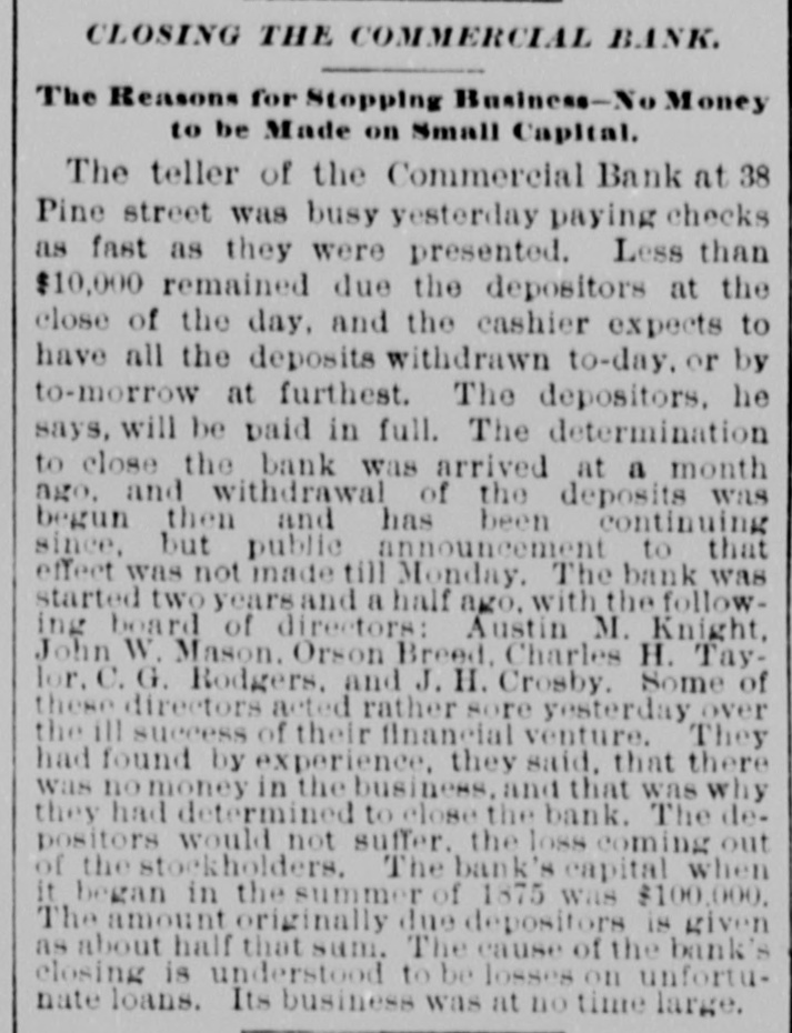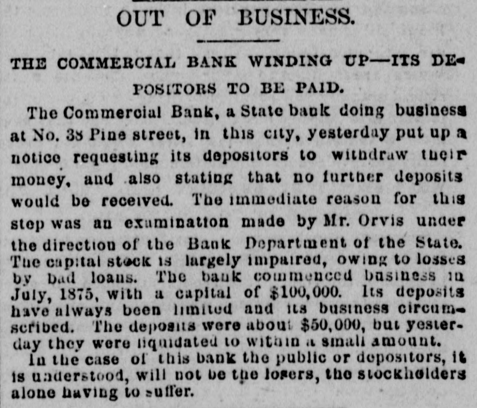 [Night Associated Pyeas Report.| The full committee on ways and means will hear their sub-committees on Thursday. Senator B. H. Hill to-day procured 200 stand of arms for the state of Georgia from the secretary of war. General Young, of Georgia, was ap pointed commissioner to represent the southern states at the Paris exposition. John J. Knox, controller of the currency, argued before the committee in favor of the remission of the tax on insolvent banks. The finance committees of the senate authorize Mr. Allison to offer an amendment to the silver bill to fix the relative value of gold and silver. House-Proceedings entirely uninteresting. Mr. Wallace addressed the senate at length in favor of the silver bill. Confirmations-Baldeye, receiver of public moneys, New Orleans ; Ray, receiver of public moneys, Monroe, La.; Miss Roddy, postmistress, For sythe, Ga; Bandu, postmaster, Thibe. deau, La., Demar, postmaster, New Iberia, La. BRANDON, VT., January 29.-Bas com, cashier of the Brandon National bank, is irregular to the extent of its surplus and ten per cent. of its capital. NEW ORLEANS, January 29.-Arrived steamship Alice Allo from Liverpool. She reports passing in latitude 47° 43' north longitude 16° 35' west, the Norwegian bark Vision, of Ezersund, water-logged and abandoned, with her foremast standing. NEW YORK, January 29.-It has been decided to wind up the affairs of the Commercial bank. It is a small institution with a capital of $100,000. The depositors will all be paid. ST. LOUIS, January 29.-Cotton peo. ple are cautioned against Adler, Rupert & Koch, whose names are associated with bogus cotton exchanges. CINCINNATI, January meeting of the creditors of Talle, Halton & Co., who recently failed, a proposition to pay thirty-five cents on the dollar, was made by the attorney for the company. Net assets, $155,000. ALBANY, January 29.-The senate to-day passed the house resolution against the Bland bill. Vote 23 to 3. LONDON, January 29.-The Times Rome dispatch says the pope is preparing an allocation against Russia for the persecution of the church in Poland, and against King Humbert, on his accession to the throne, for the assumption of the tittle king of Italy. The queen of Portugal, daughter of the late King Victor Emanual and the pope's god-daughter, is refused admission to the pope because she is residing at the quirinal. A German newspaper states that I & G. Kitterhause, the Hamburg cotton importers, whose failure was announc. ed last week, have both committed suicide. An unfavorable change took place in the pope's condition this morning; he is, however, receiving some cardinals.