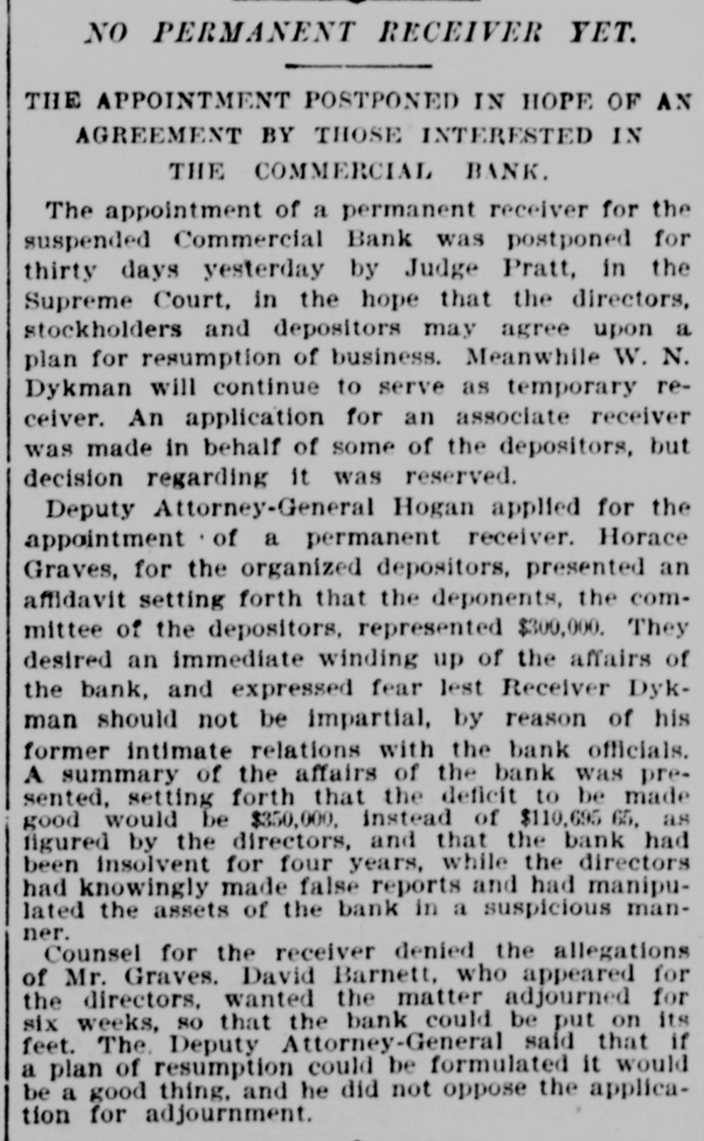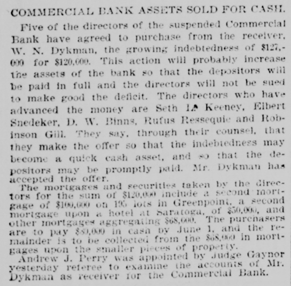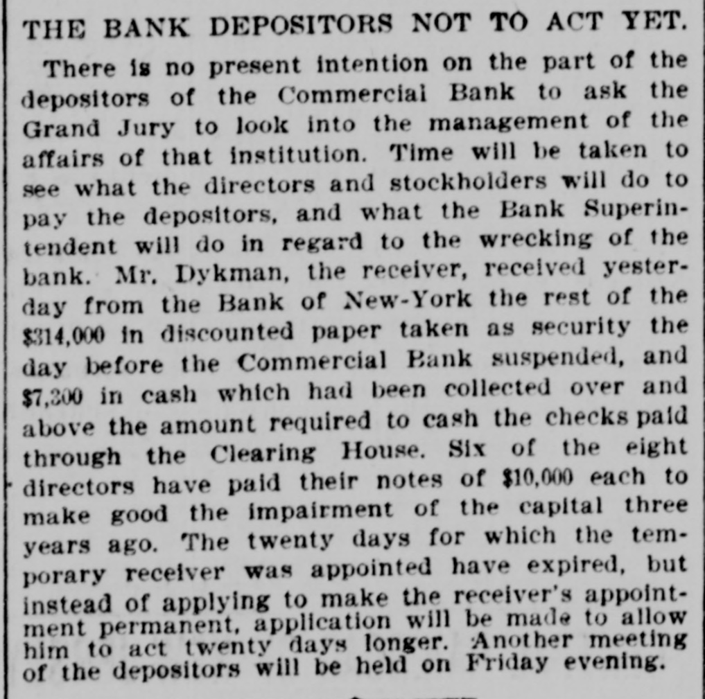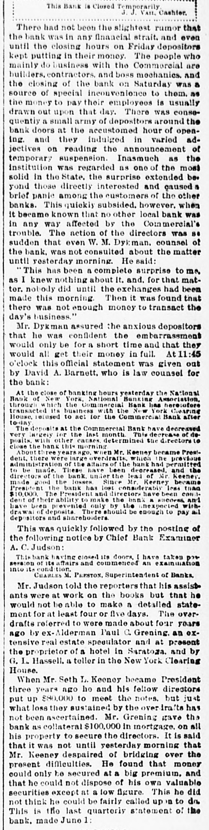 This Bank is Closed Temporarily J.J. VAIL, Cashier. There had not been the slightest rumor that the bank was in any financial strait. and even until the closing hours on Friday depositors kept putting in their money. The people who mainly do business with the Commercial are builders. contractors. and boss mechanics. and the closing of the bank on Saturday was a source of special inconvenionce to them. as the money to pay their employees is usually drawn out upon that day. There was consequentiy a small army of depositors around the bank doors at the accustomed hour of opening. and they indulged in varied adjectives on reading the announcement of temporary suspension. Inasmuch as the institution was regarded as one of the most solid in the State. the surprise extended be. yond those directly interested and caused a brief panic among the customers of the other banks. This quickly subsided. however. when it became known that no other local bank was in any way affected by the Commercial's trouble. The action of the directors was se sudden that even W. M. Dykman. counsel of the bank. was not consulted about the matter until resterday morning. He said: "This has been a complete surprise to me. as I knew nothing about it. and. for that mattor. nobody did until the exchanges had been made this morning. Then it was found that there was not enough money to transact the day's business." Mr. Dykman assured the anxious depositors that he was confldent the emburrassment would only be for a short time and that they would all get their money in full. t 11:45 o'clock this official statement was given out by David A. Barnett. who is law counsel for the bank: At the close of banking hours yesterday the National Bank of New York, National Banking Association, through which the Commercial Bank has heretofore transacted its business with the New York Clearing House, refused to act for the Commercial Bank after to-day The deposits at the Commercial Bank have decreased very largely for the last month. This decrease of deposits. with other causes. determined the directors 10 close the bank this morning About three years when Mr. Keeney became President. there were large overdrafts, which the previous administration of the aftairs of the bank had permitted to be made. These have been decreased. and the directors of the bank. under the lead of Mr. Keeney. made good the losses. Since Mr. Keeney became President the bank has lost considerably less than $10,000. The President and directors have been constdent of their ability to make the bank a success and have been prevented only by the unexpected with. drawal of deposits. There should be enough to pay ail depositors and shareholders. This was quickly followed by the posting of the following notice by Chief Bank Examiner A. C. Judson: This bank having closed its doors, I have takes possession of its affairs and commenced an examination into Its condition. CHARLES M. PRESTON, Superintendent of Banks. Mr. Judson told the reporters that his assistants were at work on the books but that he would not be able to make a detailed statement for at least four or five days. The overdrafts referred to were made about four years ago by ex-Alderman Paul C. Grening. an extensive real estate speculator and at present the proprietor of a hotel in Saratoga. and by G. L. Hassell. a teller in the New York Clearing House. When Mr. Seth L. Keeney became President three years ago ho and his fellow directors put up $80,000 to meet the notes. but just what loss they sustained by the overdraits has not been ascertained. Mr. Grening gave the bank as collateral $100,000 in mortgage. on all his property to secure the directors. It is said that it was not until yesterday morning that Mr. Keeney despaired of bridging over the present difficulties. He found that money could only be secured at a big premium. and that he could not dispose of his own valuable securities except at a low figure. This he did not think he could be fairly called up in to do This is the last quarterly statement of the bank. made June 1: