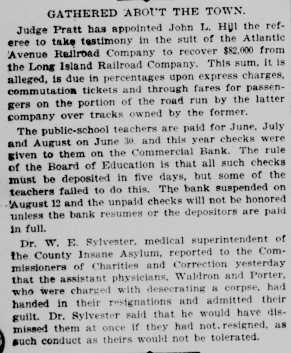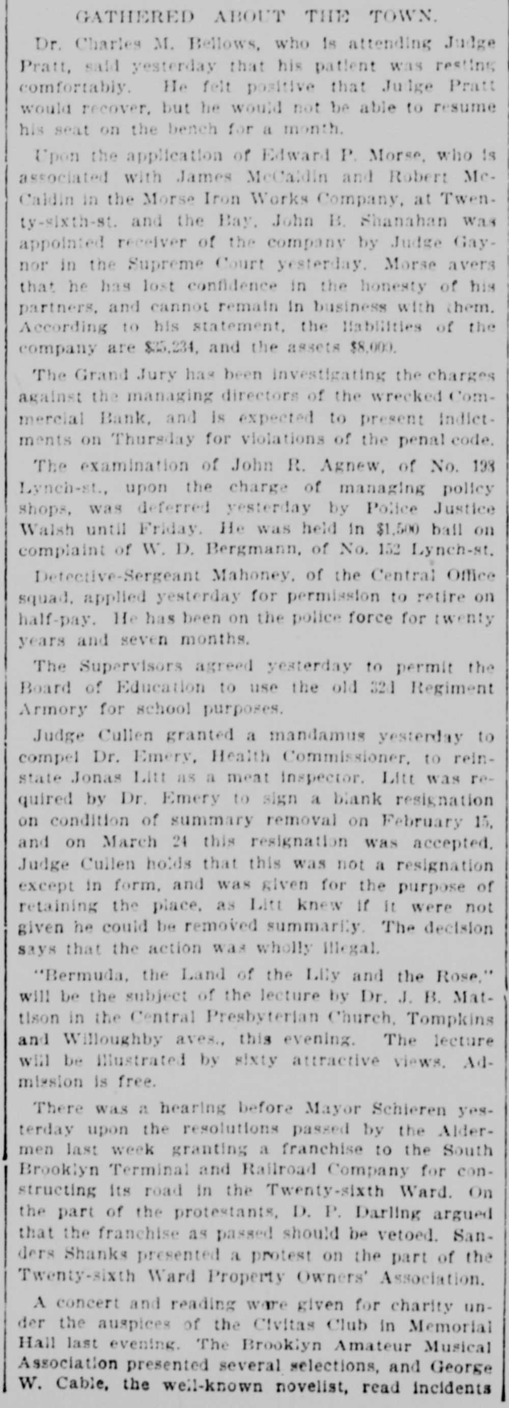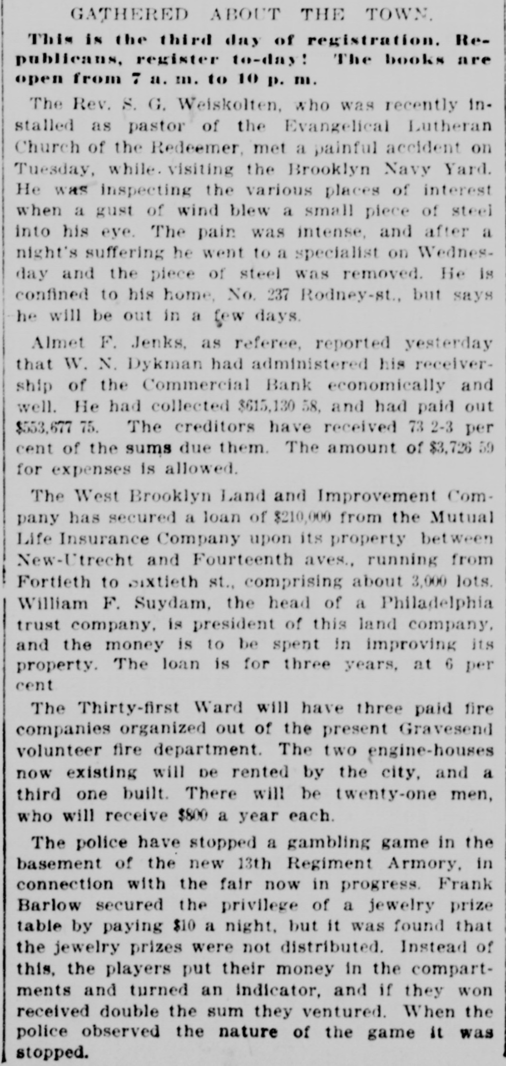 This Bank is Closed Temporarily J.J. VAIL, Cashier. There had not been the slightest rumor that the bank was in any financial strait. and even until the closing hours on Friday depositors kept putting in their money. The people who mainly do business with the Commercial are builders. contractors. and boss mechanics. and the closing of the bank on Saturday was a source of special inconvenionce to them. as the money to pay their employees is usually drawn out upon that day. There was consequentiy a small army of depositors around the bank doors at the accustomed hour of opening. and they indulged in varied adjectives on reading the announcement of temporary suspension. Inasmuch as the institution was regarded as one of the most solid in the State. the surprise extended be. yond those directly interested and caused a brief panic among the customers of the other banks. This quickly subsided. however. when it became known that no other local bank was in any way affected by the Commercial's trouble. The action of the directors was se sudden that even W. M. Dykman. counsel of the bank. was not consulted about the matter until resterday morning. He said: "This has been a complete surprise to me. as I knew nothing about it. and. for that mattor. nobody did until the exchanges had been made this morning. Then it was found that there was not enough money to transact the day's business." Mr. Dykman assured the anxious depositors that he was confldent the emburrassment would only be for a short time and that they would all get their money in full. t 11:45 o'clock this official statement was given out by David A. Barnett. who is law counsel for the bank: At the close of banking hours yesterday the National Bank of New York, National Banking Association, through which the Commercial Bank has heretofore transacted its business with the New York Clearing House, refused to act for the Commercial Bank after to-day The deposits at the Commercial Bank have decreased very largely for the last month. This decrease of deposits. with other causes. determined the directors 10 close the bank this morning About three years when Mr. Keeney became President. there were large overdrafts, which the previous administration of the aftairs of the bank had permitted to be made. These have been decreased. and the directors of the bank. under the lead of Mr. Keeney. made good the losses. Since Mr. Keeney became President the bank has lost considerably less than $10,000. The President and directors have been constdent of their ability to make the bank a success and have been prevented only by the unexpected with. drawal of deposits. There should be enough to pay ail depositors and shareholders. This was quickly followed by the posting of the following notice by Chief Bank Examiner A. C. Judson: This bank having closed its doors, I have takes possession of its affairs and commenced an examination into Its condition. CHARLES M. PRESTON, Superintendent of Banks. Mr. Judson told the reporters that his assistants were at work on the books but that he would not be able to make a detailed statement for at least four or five days. The overdrafts referred to were made about four years ago by ex-Alderman Paul C. Grening. an extensive real estate speculator and at present the proprietor of a hotel in Saratoga. and by G. L. Hassell. a teller in the New York Clearing House. When Mr. Seth L. Keeney became President three years ago ho and his fellow directors put up $80,000 to meet the notes. but just what loss they sustained by the overdraits has not been ascertained. Mr. Grening gave the bank as collateral $100,000 in mortgage. on all his property to secure the directors. It is said that it was not until yesterday morning that Mr. Keeney despaired of bridging over the present difficulties. He found that money could only be secured at a big premium. and that he could not dispose of his own valuable securities except at a low figure. This he did not think he could be fairly called up in to do This is the last quarterly statement of the bank. made June 1: