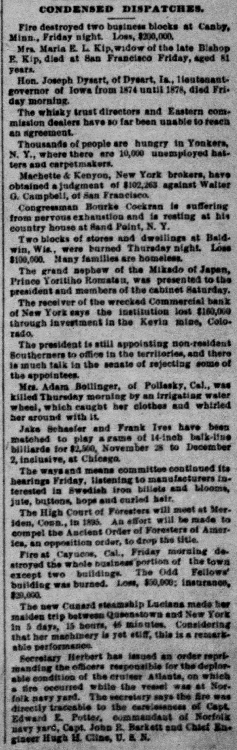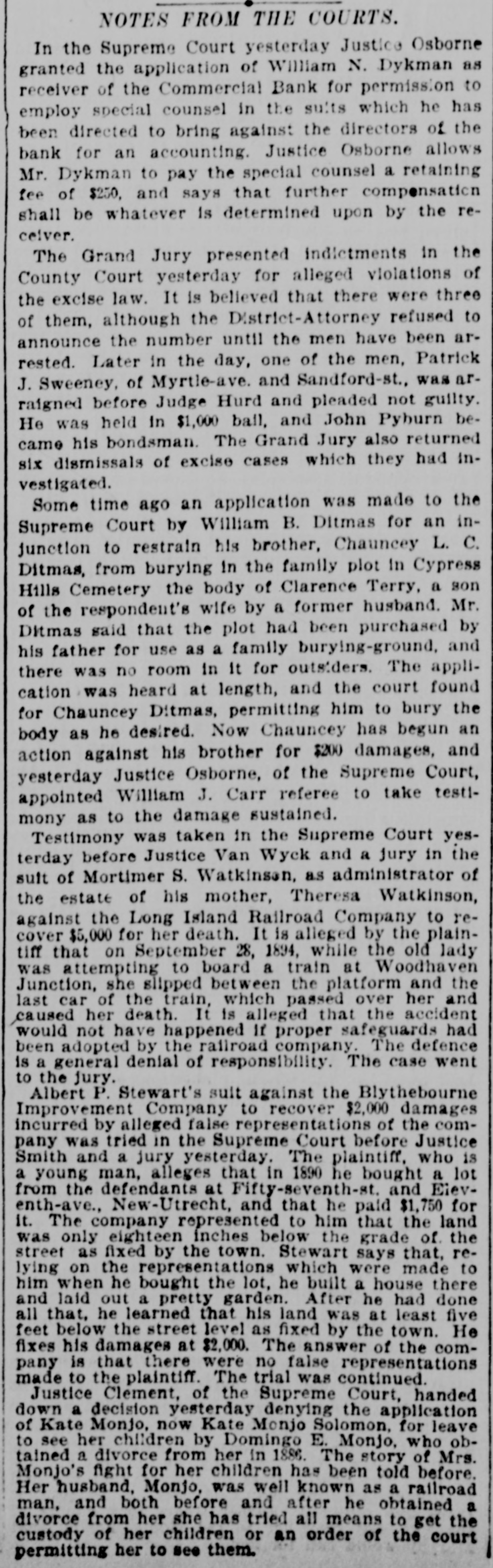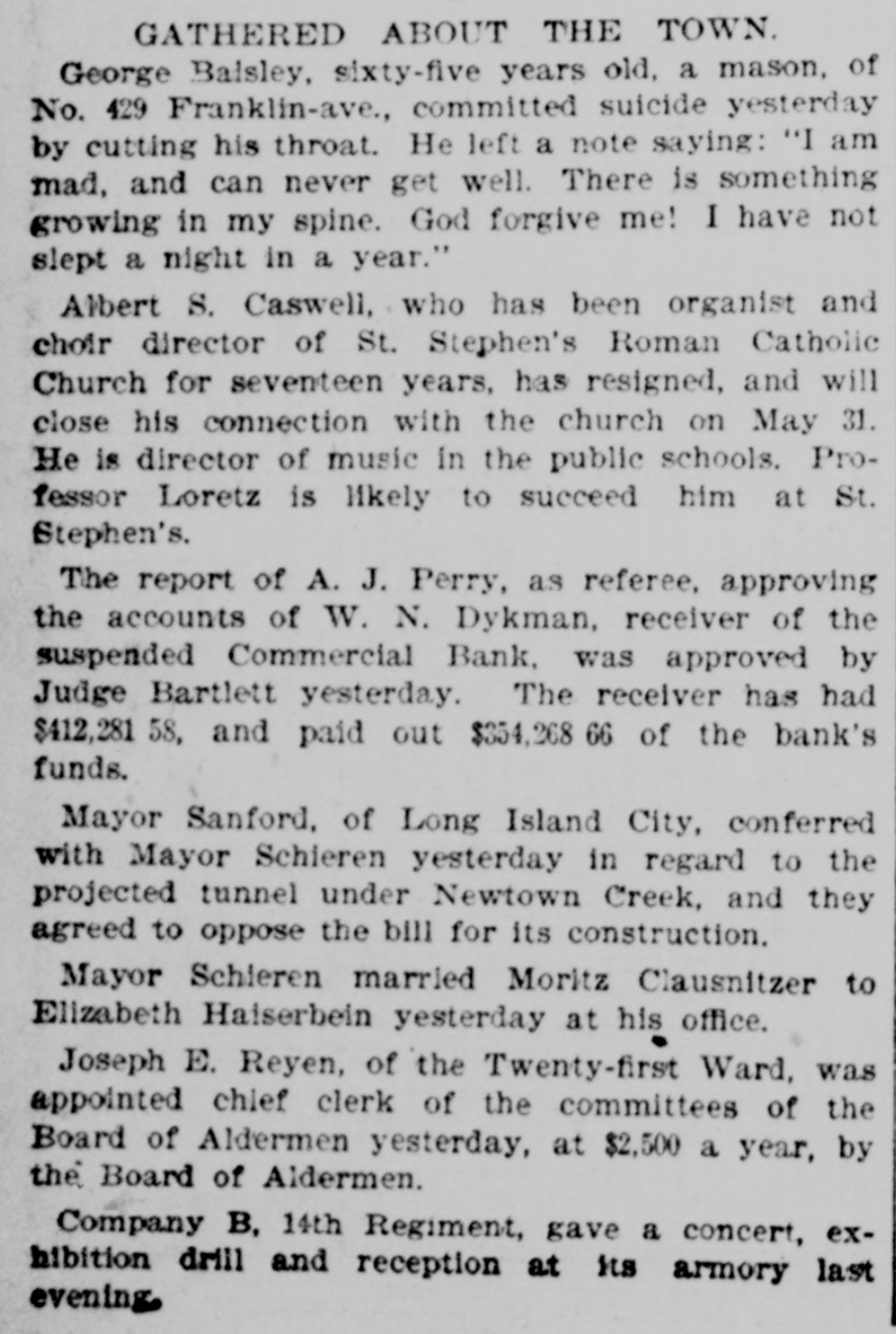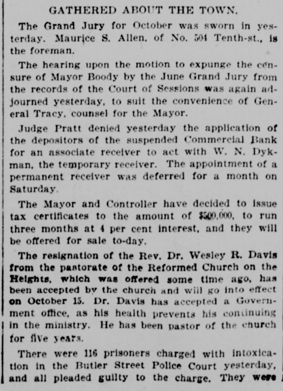 This Bank is Closed Temporarily J.J. VAIL, Cashier. There had not been the slightest rumor that the bank was in any financial strait. and even until the closing hours on Friday depositors kept putting in their money. The people who mainly do business with the Commercial are builders. contractors. and boss mechanics. and the closing of the bank on Saturday was a source of special inconvenionce to them. as the money to pay their employees is usually drawn out upon that day. There was consequentiy a small army of depositors around the bank doors at the accustomed hour of opening. and they indulged in varied adjectives on reading the announcement of temporary suspension. Inasmuch as the institution was regarded as one of the most solid in the State. the surprise extended be. yond those directly interested and caused a brief panic among the customers of the other banks. This quickly subsided. however. when it became known that no other local bank was in any way affected by the Commercial's trouble. The action of the directors was se sudden that even W. M. Dykman. counsel of the bank. was not consulted about the matter until resterday morning. He said: "This has been a complete surprise to me. as I knew nothing about it. and. for that mattor. nobody did until the exchanges had been made this morning. Then it was found that there was not enough money to transact the day's business." Mr. Dykman assured the anxious depositors that he was confldent the emburrassment would only be for a short time and that they would all get their money in full. t 11:45 o'clock this official statement was given out by David A. Barnett. who is law counsel for the bank: At the close of banking hours yesterday the National Bank of New York, National Banking Association, through which the Commercial Bank has heretofore transacted its business with the New York Clearing House, refused to act for the Commercial Bank after to-day The deposits at the Commercial Bank have decreased very largely for the last month. This decrease of deposits. with other causes. determined the directors 10 close the bank this morning About three years when Mr. Keeney became President. there were large overdrafts, which the previous administration of the aftairs of the bank had permitted to be made. These have been decreased. and the directors of the bank. under the lead of Mr. Keeney. made good the losses. Since Mr. Keeney became President the bank has lost considerably less than $10,000. The President and directors have been constdent of their ability to make the bank a success and have been prevented only by the unexpected with. drawal of deposits. There should be enough to pay ail depositors and shareholders. This was quickly followed by the posting of the following notice by Chief Bank Examiner A. C. Judson: This bank having closed its doors, I have takes possession of its affairs and commenced an examination into Its condition. CHARLES M. PRESTON, Superintendent of Banks. Mr. Judson told the reporters that his assistants were at work on the books but that he would not be able to make a detailed statement for at least four or five days. The overdrafts referred to were made about four years ago by ex-Alderman Paul C. Grening. an extensive real estate speculator and at present the proprietor of a hotel in Saratoga. and by G. L. Hassell. a teller in the New York Clearing House. When Mr. Seth L. Keeney became President three years ago ho and his fellow directors put up $80,000 to meet the notes. but just what loss they sustained by the overdraits has not been ascertained. Mr. Grening gave the bank as collateral $100,000 in mortgage. on all his property to secure the directors. It is said that it was not until yesterday morning that Mr. Keeney despaired of bridging over the present difficulties. He found that money could only be secured at a big premium. and that he could not dispose of his own valuable securities except at a low figure. This he did not think he could be fairly called up in to do This is the last quarterly statement of the bank. made June 1: