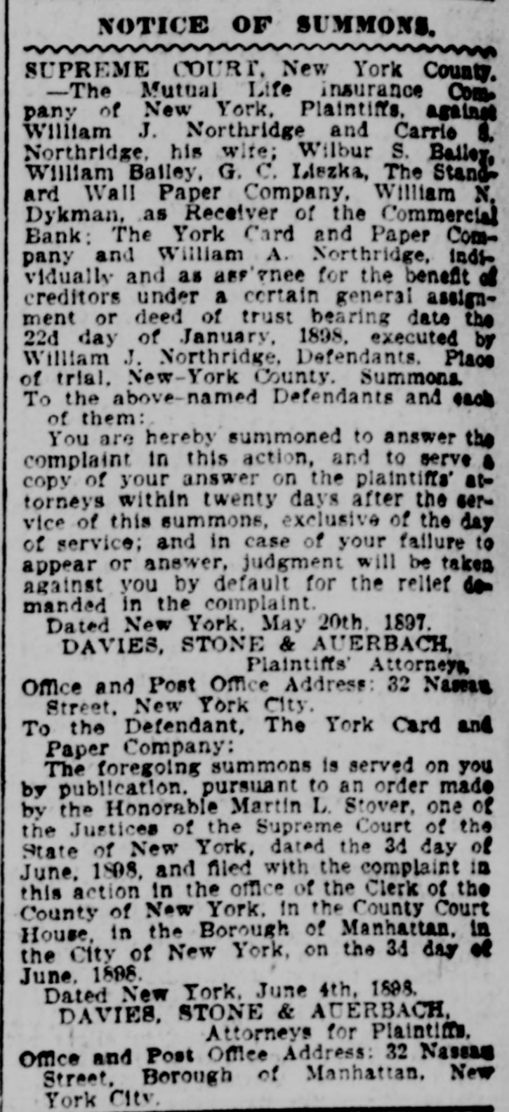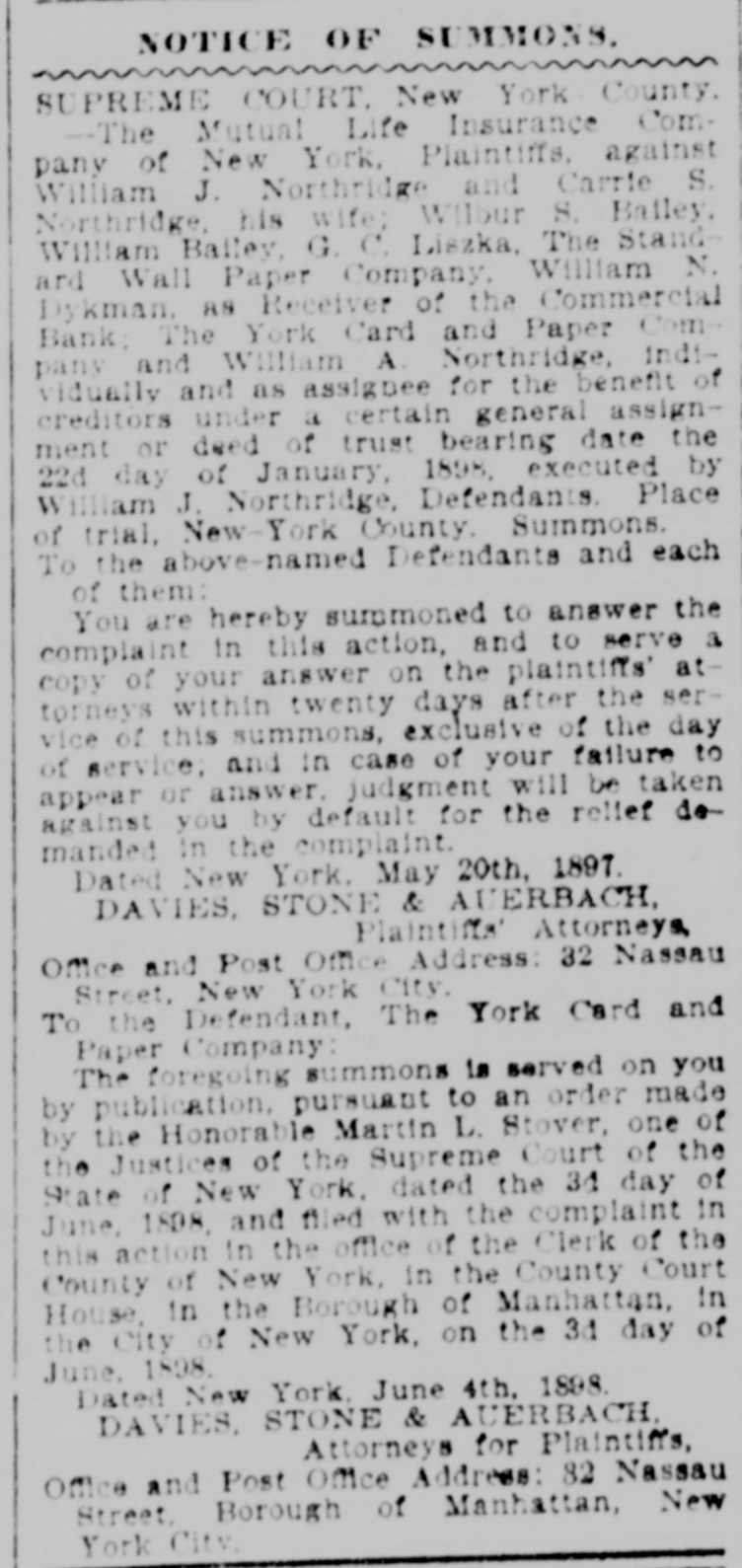 NOTICE OF SUMMONS. SUPREME COURT. New York County. -The Mutual Life insurance Com pany of New York, Plaintiffs, against William J. Northridge and Carrio 8. Northridge, his wite; Wilbur S. Balley, William Balley, G. C. Liazka, The Stand ard Wall Paper Company. William N. Dykman, as Receiver of the Commercial Bank: The York Card and Paper Company and William A. Northridge, individually and as ass'tnee for the benefit of creditors under a certain general assignment or deed of trust bearing date the 22d day of January, 1898, executed by William J. Northridge, Defendants. Place of trial. New-York County. Summons. To the above-named Defendants and each of them: You are hereby summoned to answer the complaint in this action, and to serve s copy of your answer on the plaintiffs' attorneys within twenty days after the service of this summons, exclusive of the day of service; and in case of your failure to appear or answer, judgment will be taken against you by default for the relief do manded in the complaint. Dated New York. May 20th. 1897. DAVIES, STONE & AUERBACH, Plaintiffs Attorneya Office and Post Office Address: 32 Name Street, New York City. To the Defendant, The York Card and Paper Company: The foregoing summons is served on you by publication. pursuant to an order made by the Honorable Martin L. Stover, one of the Justices of the Supreme Court of the State of New York, dated the 3d day of June, 1898, and filed with the complaint in this action in the office of the Clerk of the County of New York. in the County Court House, in the Borough of Manhattan. in the City of New York, on the 3d day of June. 1898. Dated New York, June 4th, 1898. DAVIES, STONE & AUERBACH. Attorneys for Plaintiffs. Office and Post Offlee Address: 32 Nassau Street. Borough of Manhattan. New York City.