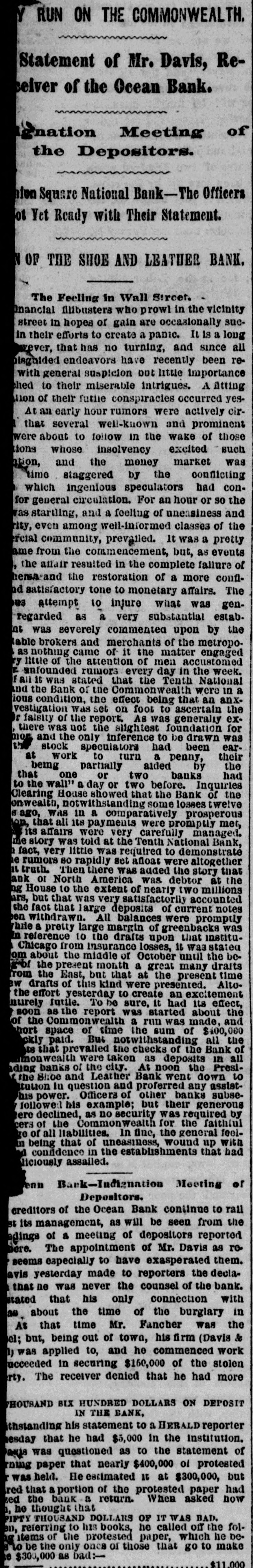 RUN ON THE COMMONWEALTH. Statement of Mr. Davis, Reseiver of the Ocean Bank. >nation Meeting of the Depositors. ion Square National Bank-The Officer ot Yet Ready with Their Statement. OF THE SHOE AND LEATUER BANK. The Feeling in Wall Sircet. nancial flubusters who prowl in the vicinity sucstreet in hopes of gain are occasionally long in their efforts to create a panic. It is a ever, that has no turning, and since all plagnided endeavors have recently been rewith general suspicion out little importance hed to their miserable intrigues. A atting lion of their futue conspiracies occurred yesAt an early hour rumors were actively cirthat several well-known and prominent those were about to follow in the wake of insolvency tions whose excited market such was ation, and the money time staggered by the conflicting which ingenious speculators had confor general circulation. For an hour or so the was startling, and a feeling of uneasiness and rity, even among well-informed classes of the retal community, prevated. It was a pretty ame from the commencement, but, as events affair resulted in the complete failure of the restoration of a more nd tone to monetary hersa-and the satisfactory affairs. coun- The us 10 injure was genas a very regarded attempt substantial what by estab. the commented upon brokers and merchants of came of it the table at as nothing was severely matter the metropo- engaged of the attention of men rumors every day in that the Tenth of the by unfounded little it WRS stated Commonwealth accustomed the were National week. in fall and the Bank that an anxthe effect being was set on foot to ious vestigation condition, generality ascertain the r of the report. As was not the slightest there falsity was foundation drawn was ex- for mor and the only inference to be the stock speculators had been their earat work to turn a penny, that one or being partially aided by had the two banks to the wall" a day or two before. Inquiries Clearing House showed that the Bank of the onwealth, notwithstanding some losses twelve sago, was in a comparatively prosperous on that all its payments were promptly met, its affairs were very carefully managed. me story was told at the Tenth National Bank, fact, very little was required to demonstrate e rumors so rapidly set afloat were altogether n truth. Then there was added the story that ank or North America was debtor at the ng House to the extent of nearly two millions ars, but that was very satisfactorily accounted the fact that large deposits of current notes en withdrawn. All balances were promptly hile a pretty large margin of greenbacks was in reference 10 the drafts upon that instituChicago from insurance losses, it was stated om about the middle of October until the bcb-bl the present month a great many draits from the East, but that at the present time w drafts of this kind were presented. Alto the effort yesterday to create an excitement nurely futile. To be sure, it had its effect, soon as the report was started about the of the Commonwealth a run was made, and hort space or time the sum of $400,000 ckly paid. But notwithstanding all the its that prevalled the checks of the Bank of monwealth were taken as deposits in all of the city. Leather ading the Shop banks and Bank At noon went the down Presi- 10 tution in question and proferred any assistOfficers of other banks subsehis example; but his followe:1 power. their required generous by ere declined, as no security was Commonwealth for the faithful In fine, cers ge of of all the liabilities. the wound general feelin being that of uneasiness, up with confidence in the establishments that had liciously assailed. enn Bank-Indignation Meeting or Depositors. st creditors its management, of the Ocean as will Bank be continue seen from to rail the of a of depositors reported of as rehere. edings The appointment meeting exasperated Mr. Davis them. seems especially to have avis yesterday made to reporters the decla. that ne was never the counsel of the bank. stated that his only connection with 30. about the time of the burglary in At that time Mr. Fancher was the out of town, & to, and work el; was but, applied being he commenced his firm (Davis ucceeded in securing $160,000 of the stolen rty. The receiver denied that he had more THOUSAND BIX HUNDRED DOLLARS ON DEPOSIT IN THE BANK, thstanding his statement to a HERALD reporter esday that he had $5,000 in the institution. OKIS was questioned as to the statement of ring paper that nearly $400,000 of protested was held. He estimated it at $300,000, but red that a portion of the protested paper had zed the bank a return. When asked now he thought that OF IT PIFTY THOUSAND DOLLARS books, called WAS Off BAD. to his he folof the bebe the onca of make en, to items referring only protested those paper, that which go to the he e $300,000 as bad:$11,000