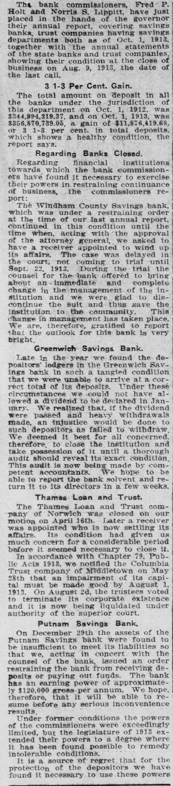 bank commissioners, Fred P. The and Norris S. Lippitt, have governor just Holt in the hands of the savings placed annual report, covering savings their trust companies having 1913, departments banks, both as of Oct. statements 1, with the annual companies, together of the state banks and trust close of their condition at the date of business showing on Aug. 9, 1913, the the last call. 3 1-3 Per Cent. Gain. total amount on deposit in all The banks under the jurisdiction was of the this department on Oct. 1, 1912, 1913. was $344,994,319.37, and on Oct. 1. $356,870,739.05, a gain of $11,876,419.68, 3 1-3 per cent. in total deposits, the or which shows a healthy condition, report says. Regarding Banks Closed. Regarding financial institutions towards which the bank commissionhave found it necessary to exercise et's their powers in restraining continuance reof business, the commissioners port: The Windham County Savings bank, which was under a restraining order at the time of our last annual report, the continued in this condition until time when, acting with the approval to of the attorney general, we asked have a receiver appointed to wind up in its affairs. The case was delayed the court, not coming to trial until the Sept. 22. 1913. During the trial counsel for the bank offered to bring about an immediate and complete change in the management of the dis- institution and we were glad to continue the suit and thus save This the institution to the community, change in management has taken place. We are, therefore, gratified to report that the outlook for this bank is very bright. Greenwich Savings Bank. Late in the year we found the depositors' ledgers in the Greenwich Savings bank in such a tangled condition that we were unable to arrive at a correct total of its deposits. Under these circumstances we could not have allowed a dividend to be declared in January. We realized that, if the dividend were passed and heavy withdrawals made, an injustice would be done to as failed to It best for all to close the such therefore. We deemed depositors institution concerned, withdraw. thorough and take possession of it until a audit should reveal its exact condition. This audit is now being made by com- be petent accountants. We hope to able to report the bank solvent and return it to its directors in a few weeks. Thames Loan and Trust. The Thames Loan and Trust comof Norwich was closed on our motion pany on April 16th. Later a receiver was appointed who is now settling its affairs. Its condition had given us much concern for a considerable period before it seemed necessary to close it. In accordance with Chapter 79, Public Acts 1913, we notified the Columbia Trust company of Middletown on May 28th that an impairment of its capital must be made good by August 1. 1913. On August 2d, the trustees voted to terminate its corporate existence and it is now being liquidated under authority of the superior court. Putnam Savings Bank, On December 29th the assets of the Putnam Savings bank were found to be insufficient to meet its liabilities so that we, acting in concert with the counsel of the bank, issued an order restraining the bank from receiving deposits or paying out funds. The bank has an earning power of approximately $120,000 gross per annum. We hope, therefore, that it will be able to resume before any serious inconvenience results. Under former conditions the powers of the commissioners were exceedingly limited, but the legislature of 1913 extended their powers to a degree where it has been found possible to remedy intolerable conditions. It is a source of regret that for the protection of the depositors we have found it necessary to use these powers