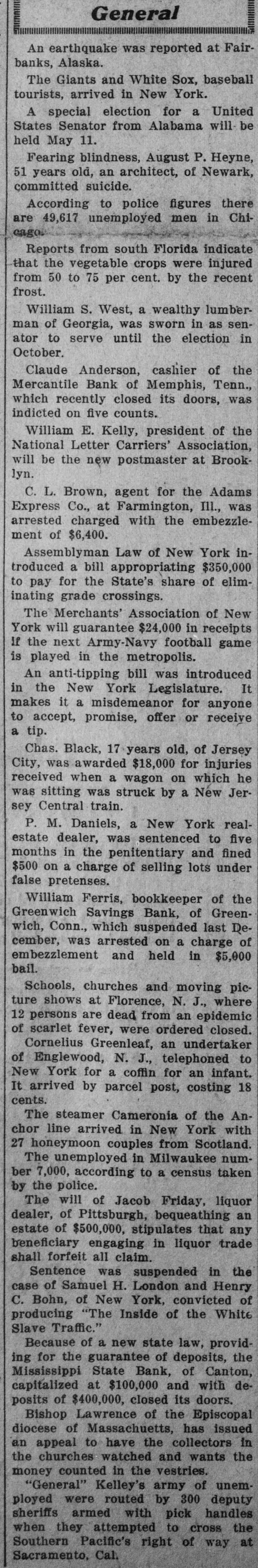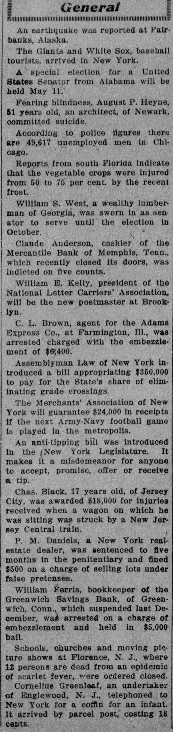 General An earthquake was reported at Fairbanks, Alaska. The Giants and White Sox, baseball tourists, arrived in New York. A special election for a United States Senator from Alabama will be held May 11. Fearing blindness, August P. Heyne, 51 years old, an architect, of Newark, committed suicide. According to police figures there are 49,617 unemployed men in Chicago. Reports from south Florida indicate that the vegetable crops were injured from 50 to 75 per cent. by the recent frost. William S. West, a wealthy lumberman of Georgia, was sworn in as senator to serve until the election in October. Claude Anderson, cashier of the Mercantile Bank of Memphis, Tenn., which recently closed its doors, was indicted on five counts. William E. Kelly, president of the National Letter Carriers' Association, will be the new postmaster at Brooklyn. C. L. Brown, agent for the Adams Express Co., at Farmington, III., was arrested charged with the embezzlement of $6,400. Assemblyman Law of New York introduced a bill appropriating $350,000 to pay for the State's share of eliminating grade crossings. The Merchants' Association of New York will guarantee $24,000 in receipts if the next Army-Navy football game is played in the metropolis. An anti-tipping bill was introduced in the (New York Legislature. It makes it a misdemeanor for anyone to accept, promise, offer or receive a tip. Chas. Black, 17 years old, of Jersey City, was awarded $18,000 for injuries received when a wagon on which he was sitting was struck by a New Jersey Central train. P. M. Daniels, a New York realestate dealer, was sentenced to five months in the penitentiary and fined $500 on a charge of selling lots under false pretenses. William Ferris, bookkeeper of the Greenwich Savings Bank, of Greenwich, Conn., which suspended last December, was arrested on a charge of embezzlement and held in $5,000 bail. Schools, churches and moving picture shows at Florence, N. J., where 12 persons are dead from an epidemic of scarlet fever, were ordered closed. Cornelius Greenleaf, an undertaker of Englewood, N. J., telephoned to New York for a coffin for an infant. It arrived by parcel post, costing 18 cents.