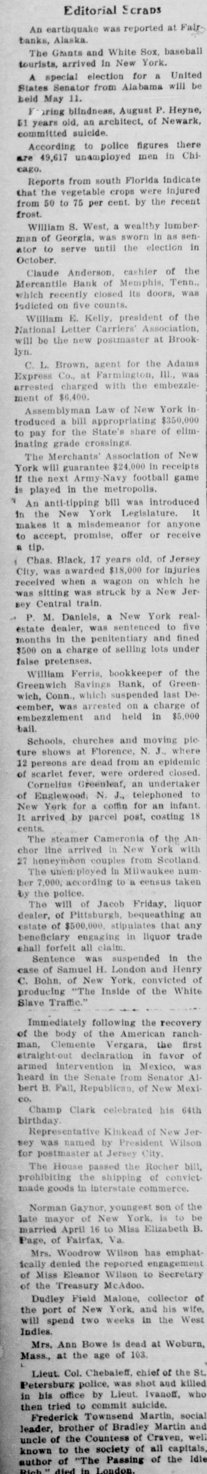 Editorial Scraps An earthquake was reported at Fair banks, Alaska. The Grants and White Sox, baseball tourists, arrived in New York. A special election for a United States Senator from Alabama will be held May 11. F aring blindness, August P. Heyne, 51 years old, an architect, of Newark, committed suicide. According to police figures there are 49,617 unamployed men in Chicago. Reports from south Florida indicate that the vegetable crops were injured from 50 to 75 per cent. by the recent frost. William S. West, a wealthy lumber man of Georgia, was sworn in as senator to serve until the election in October. Claude Anderson, cashier of the Mercantile Bank of Memphis, Tenn., which recently closed its doors, was indicted on five counts. William E. Kelly, president of the National Letter Carriers' Association, will be the new postmaster at Brooklyn. C. L. Brown, agent for the Adams Express Co., at Farmington, III., was arrested charged with the embezzlement of $6,400. Assemblyman Law of New York in troduced a bill appropriating $350,000 to pay for the State's share of eliminating grade crossings. The Merchants' Association of New York will guarantee $24,000 in receipts If the next Army-Navy football game is played in the metropolis. 1 An anti-tipping bill was introduced in the New York Legislature. It makes it a misdemeanor for anyone to accept, promise, offer or receive a tip. 1 Chas. Black, 17 years old. of Jersey City, was awarded $18,000 for injuries received when a wagon on which he was sitting was struck by a New Jersey Central train. - P. M. Daniels, a New York realestate dealer, was sentenced to five months in the penitentiary and fined $500 on a charge of selling lots under false pretenses. William Ferris, bookkeeper of the Greenwich Savings Bank, of Greenwich, Conn., which suspended last December, was arrested on a charge of embezzlement and held in $5,000 bail. Schools, churches and moving picture shows at Florence, N. J., where 12 persons are dead from an epidemic of scarlet fever, were ordered closed. Cornelius Greenleaf, an undertaker of Englewood. N. J., telephoned to New York for a coffin for an infant. It arrived by parcel post, costing 18 cents. The steamer Cameronia of the Anchor line arrived in New York with 27 honeymoon couples from Scotland. The unemployed in Milwaukee number 7,000, according to a eensus taken by the police. The will of Jacob Friday, liquor dealer, of Pittsburgh, bequeathing an estate of $500,000. stipulates that any beneficiary engaging in liquor trade shall forfeit all claim. Sentence was suspended in the case of Samuel H. London and Henry C. Bohn, of New York, convicted of producing "The Inside of the White Slave Traffic." Immediately following the recovery of the body of the American ranchman, Clemente Vergara, the first straight-out declaration in favor of armed intervention in Mexico, was heard in the Senate from Senator Albert B. Fall, Republican, of New Mexico. Champ Clark celebrated his 64th birthday. Representative Kinkead of New Jersey was named by President Wilson for postmaster at Jersey City, The House passed the Rocher bill, prohibiting the shipping of convictmade goods in interstate commerce. Norman Gaynor, youngest son of the late mayor of New York, is to be married April 16 to Miss Elizabeth B. Page, of Fairfax, Va. Mrs. Woodrow Wilson has emphatically denied the reported engagement of Miss Eleanor Wilson to Secretary of the Treasury McAdoo. Dudley Field Malone, collector of the port of New York, and his wife, will spend two weeks in the West Indies. Mrs. Ann Bowe is dead at Woburn, Mass., at the age of 103. Lieut. Col. Chebaieff, chief of the St. Petersburg police, was shot and killed in his office by Lieut. Ivanoff, who then tried to commit suicide. Frederick Townsend Martin, social leader, brother of Bradley Martin and uncle of the Countess of Craven, well known to the society of all capitals, author of "The Passing of the Idle Rich died in London.