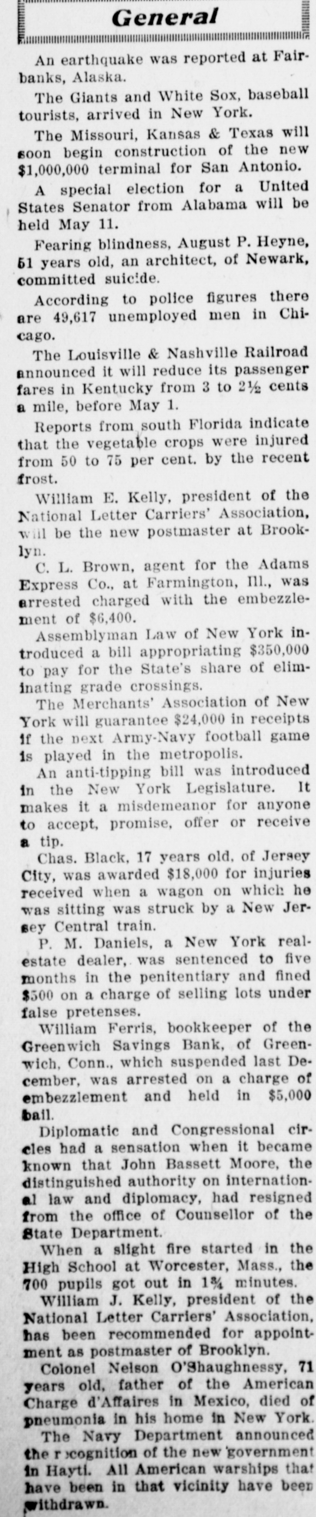 General An earthquake was reported at Fairbanks, Alaska. The Giants and White Sox, baseball tourists, arrived in New York. The Missouri, Kansas & Texas will soon begin construction of the new $1,000,000 terminal for San Antonio. A special election for a United States Senator from Alabama will be held May 11. Fearing blindness, August P. Heyne, 51 years old, an architect, of Newark, committed suicide. According to police figures there are 49,617 unemployed men in Chicago. The Louisville & Nashville Railroad announced it will reduce its passenger fares in Kentucky from 3 to 2½ cents a mile, before May 1. Reports from south Florida indicate that the vegetable crops were injured from 50 to 75 per cent. by the recent frost. William E. Kelly, president of the National Letter Carriers' Association, will be the new postmaster at Brooklyn. C. L. Brown, agent for the Adams Express Co., at Farmington, III., was arrested charged with the embezzlement of $6,400. Assemblyman Law of New York introduced a bill appropriating $350,000 to pay for the State's share of eliminating grade crossings. The Merchants' Association of New York will guarantee $24,000 in receipts If the next Army-Navy football game is played in the metropolis. An anti-tipping bill was introduced in the New York Legislature. It makes it a misdemeanor for anyone to accept, promise, offer or receive a tip. Chas. Black, 17 years old, of Jersey City, was awarded $18,000 for injuries received when a wagon on which he was sitting was struck by a New Jersey Central train. P. M. Daniels, a New York realestate dealer, was sentenced to five months in the penitentiary and fined $500 on a charge of selling lots under false pretenses. William Ferris, bookkeeper of the Greenwich Savings Bank, of Greenwich, Conn., which suspended last December, was arrested on a charge of embezzlement and held in $5,000 bail. Diplomatic and Congressional circles had a sensation when it became known that John Bassett Moore, the distinguished authority on international law and diplomacy, had resigned from the office of Counsellor of the State Department. When a slight fire started in the High School at Worcester, Mass., the 700 pupils got out in 1% minutes. William J. Kelly, president of the National Letter Carriers' Association, has been recommended for appointment as postmaster of Brooklyn. Colonel Nelson O'Shaughnessy, 71 years old, father of the American Charge d'Affaires in Mexico, died of pneumonia in his home in New York. The Navy Department announced the r ecognition of the new government in Hayti. All American warships that have been in that vicinity have been withdrawn.