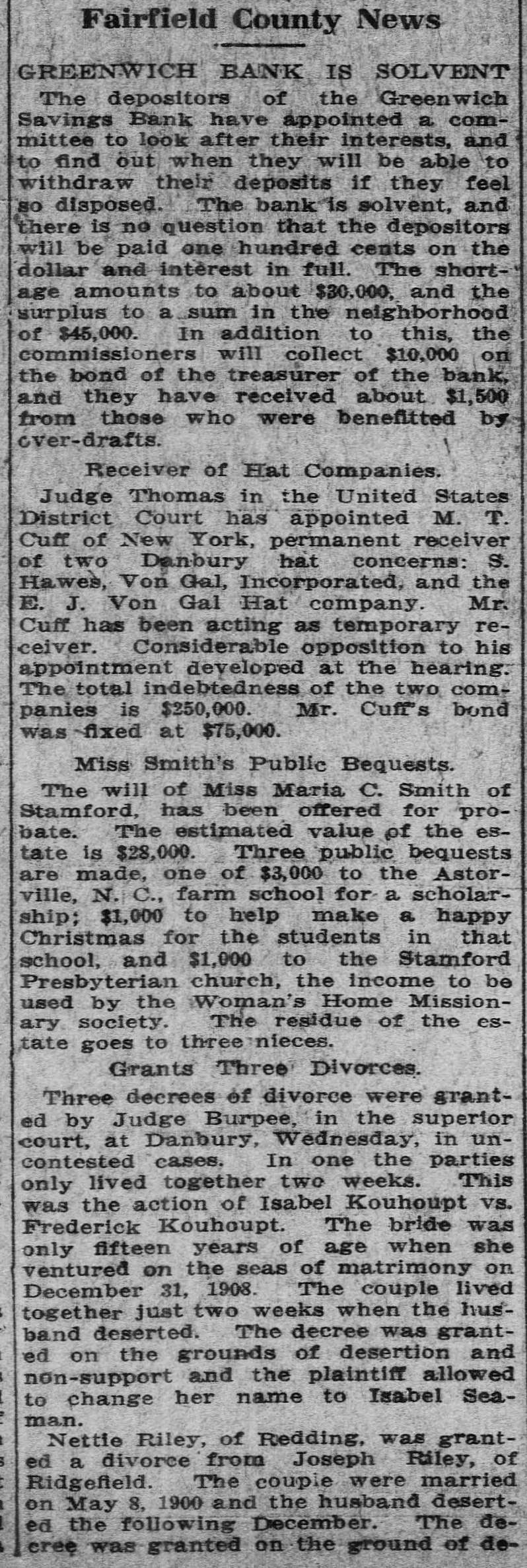 Fairfield County News GREENWICH BANK IS SOLVENT The depositors of the Greenwich Savings Bank have appointed a committee to look after their interests, and to find out when they will be able to withdraw their deposits if they feel so disposed. The bank is solvent, and there is ne question that the depositors will be paid one hundred cents on the dollar and intérest in full. The shortage amounts to about $30,000, and the surplus to a sum in the neighborhood of $45,000. In addition to this, the commissioners will collect $10,000 on the bond of the treasurer of the bank, and they have received about $1,500 from those who were benefitted by ever-drafts. Receiver of Hat Companies. Judge Thomas in the United States District Court has appointed M. T. Cuff of New York, permanent receiver of two Danbury hat concerns: S. Hawes, Von Gal, Incorporated, and the E. J. Von Gal Hat company. Mr. Cuff has been acting as temporary receiver. Considerable opposition to his appointment developed at the hearing. The total indebtedness of the two companies is $250,000. Mr. Cuff's bond was fixed at $75,000. Miss Smith's Public Bequests. The will of Miss Maria C. Smith of Stamford, has been offered for probate. The estimated value of the estate is $28,000. Three public bequests are made, one of $3,000 to the Astorville, N.C., farm school for a scholarship; $1,000 to help make a happy Christmas for the students in that school, and $1,000 to the Stamford Presbyterian church, the income to be used by the Woman's Home Missionary society. The residue of the estate goes to three nieces. Grants Three Divorces. Three decrees of divorce were granted by Judge Burpee, in the superior court, at Danbury, Wednesday, in uncontested cases. In one the parties only lived together two weeks. This was the action of Isabel Kouhoupt vs. Frederick Kouhoupt. The bride was only fifteen years of age when she ventured on the seas of matrimony on December 31, 1908. The couple lived together just two weeks when the husband deserted. The decree was granted on the grounds of desertion and non-support and the plaintiff allowed to change her name to Isabel Seaman. Nettie Riley, of Redding, was granted a divorce from Joseph Riley, of Ridgefield. The couple were married on May 8, 1900 and the husband deserted the following December. The decree was granted on the ground of de-