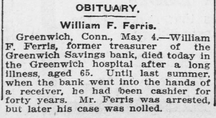 OBITUARY, William F. Ferris. Greenwich, Conn., May 4.-William F. Ferris, former treasurer of the Greenwich Savings bank, died today in the Greenwich hospital after a long illness, aged 65. Until last summer, when the bank went into the hands of a receiver, he had been cashier for forty years. Mr. Ferris was arrested, but later his case was nolled.