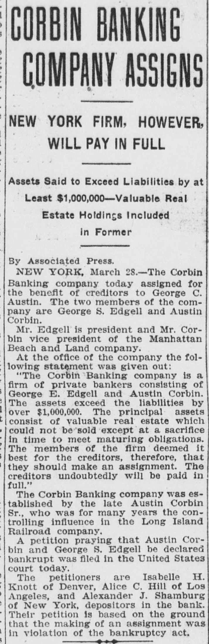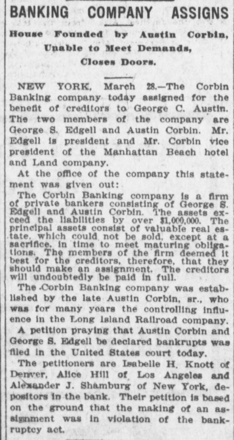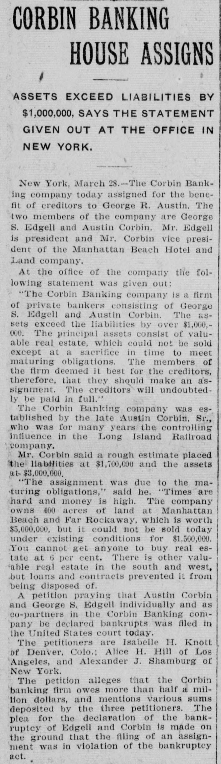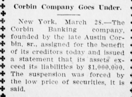 FINANCIAL Jan. 21-Merchants' and Farmers' bank of Fairmont, Minn., suspended. Feb. 2-F. D. Gilman, former president suspended Home bank of Goodland, Ind., found guiltv of embezzlement. 4-First National bank of Scotland, S. D., close by bank examiner. 8-F. D. Gilman, Indiana banker, sentenced to term of one to three years in state prison. 25-Disappearance of $173,000 from subtreasury at Chicago made public. Mar. 14-Virtual panic in Wall street; Secretary Cortelyou relieved the situation. 19-Citizens' State bank of Firth, Neb., closed by state. 28-Corbin Banking company of New York, assigned; assets, $3,000,000; liabilities, $1,700,000. Apr. 2-Maj. H. W. Salmon of Warsaw, Mo., convicted of illegal banking, sentenced three years in penitentiary. 11-Bank of Conception, at Clyde, Mo., ordered closed. 19-Ex-Judge Smith of Chicago, found guilty of conspiring to defraud stockholders and depositors of Bank of America, of which he was president; penalty, imprisonment and $1,000 fine. Jul. 1-Citizens' bank of Eureka Springs, Ark., suspended. 2-First National bank of Hicksville, O., closed by comptroller of currency 5-Fort Dallas National bank of Miami, Fla., closed. 20-Farmers' National bank of Boyertown, Pa., ordered closed. Aug. 3-People's State bank of Brownstown, Ind., closed by state authorities. 14-Receivers appointed for Pope Mfg. Co., of Hartford, Conn.; failure ascribed to stringency of money market. Sep. 5-Watson & Co., members of New York stock and produce exchanges and of Chicago board of trade, failed. Oct. 9-Union bank of Richland, and Bowman bank of Kalamazoo, Mich., both private institutions, closed doors. 10-H. D. Reynolds' bank of Valdez, Alaska, closed doors. 15-First National bank of Dresden, O., failed. 16-Collapse of Heinze corner in copper caused violent slump in stocks in New York; firm of Otto Heinze & Co., suspended from stock exchange. 19-New York clearing house committee declared that the Heinze, Morse and Thomas interests had been eliminated from banking organizations of New York. 22-Knickerbocker Trust Co., New York's second largest financial institution, forced to suspend; great slump in securities; call money at 70 per cent. 23-Secretary of treasury ordered deposit of $25,000,000 of government funds in New York banks Four Westinghouse companies at Pittsburg and one trust company forced into hands of receivers because of financial stringency State Bank and Trust Co., of Carson, Nevada, failed. 24-Three minor banks in New York forced to close Southern Steel Co., of Birmingham, Ala., filed involuntary petition in bankruptcy. 25-Six more minor banking institutions in New York closed doors Union Trust Co., of Providence, R. 1., suspended. 26-Banks in New York and Chicago, and many other cities adopted clearing house loan certificate system to prevent draining of supplies of currency and made withdrawal of savings deposits subject to legal notice. 20-California Safe Deposit & Trust Co. bank, at San Francisco, closed. Financial conditions in New York practically normal again. Nov. 4-Three small banks in Kansas closed. United States Steel corporation secured controlling interest in Tennessee Coal & Iron Co. 6-Receiver appointed for Arnold Print works of North Adams, Mass., one of largest textile concerns in country. 12-Merchants' National bank of Portland, Ore., California bank of Oakland, Cal., and Farmers' & Merchants' bank of Sapulpa, I. T., suspended. 18--Secretary of Treasury Cortelyou ordered issue of $50,000,000 of Panama bonds and $100,000,000 certificates of indebtedness as means of relieving financial situation City National bank of Frederick, Okla., failed. 27-American Silk Co. capital stock, $11,000,000, which operated mills in several cities, placed in hands of receiver Dec. 2-Chelsea Savings abnk of Chelsea. Mich., owned by State Treasurer Glazier, closed. 5-National Bank of Commerce, one of largest financial institutions of Kansas City, suspended. 6-Fort Pitt National bank of Pittsburg, closed. 17-Jewelers' National bank at North Attleboro. Mass. in hands of receiver