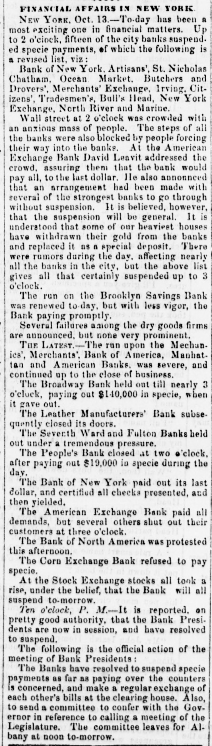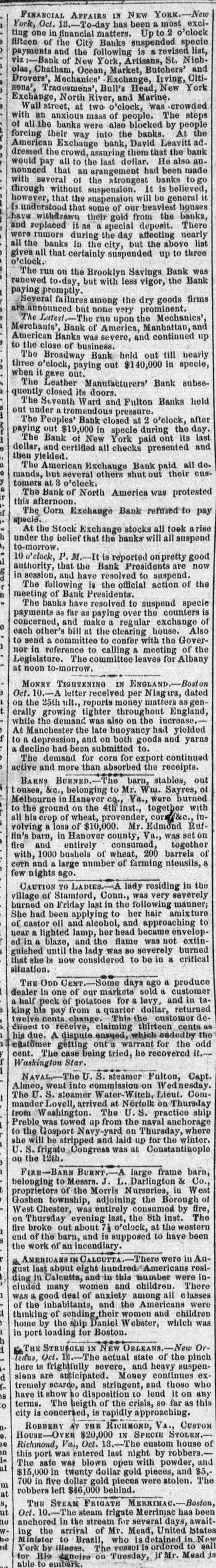 FINANCIAL AFFAIRS IN NEW YORK.-New York, Oct. 18.-To-day has been a most exciting one in financial matters. Up to 2 o'clock fifteen of the City Banks suspended specie payments and the following is a revised list, viz :-Bank of New York, Artisans, St. Nicholas, Chatham, Ocean, Market, Butchers' and Drovers', Mechanics' Exchange, Inving, Citizens', Traqesmens', Bull's Head, New York Exchange, North River, and Marine. Wall street, at two o'clock, was crowded with an anxious mass of people. The steps of all the banks were also blocked by people forcing their way into the banks. At the American Exchange bank, David Leavitt ad. dressed the crowd, assuring them that the bank would pay all to the last dollar. He also announced that an arangement had been made with several of the strongest banks to go through without suspension. It is believed, however, that the suspension will be general it is understood that some of our heaviest houses have withdrawn their gold from the banks, and replaced it as a special deposit. There were rumors during the day affecting nearly all the banks in the city, but the above list gives all that certainly suspended up to three o'clock. The run on the Brooklyn Savings Bank was renewed to-day, but with less vigor, the Bank paying promptly. Several failures among the dry goods firms are announced but none vary prominent. The Latest.-The run upon the Mechanics', Merchants', Bank of America, Manhattan, and American Banks was severe, and continued up to the close of business. The Broadway Bank held out till nearly three o'clock, paying out $140,000 in specie, when it gave out. The Leather Manufacturers' Bank subsequently closed its doors. The Seventh Ward and Fulton Banks held out under a tremendous pressure. The Peoples' Bank closed at 2 o'clock, after paying out $19,000 in specie during the day. The Bank of New York paid out its last dollar, and certified all checks presented and then yielded. The American Exchange Bank paid all de. mands, but several others shut out their cus tomers at 8 o'clock. The Bank of North America was protested this afternoon. The Corn Exchange Bank refused to pay specie. At the Stock Exchange stocks all took a rise under the belief that the banks will all suspend to-morrow. 10 o'clock, P. M.-It is reported onpretty good authority, that the Bank Presidents are now in session, and have resolved to suspend. The following is the official action of the meeting of Bank Presidents. The banks have resolved to suspend specie payments as far as paying over the counters is concerned, and make a regular exchange of each other's bill at the clearing house. Also to send a committee to confer with the Governor in reference to calling a meeting of the Legislature. The committee leaves for Albany at noon to-morrow. MONEY TIGHTENING IN ENGLAND.-Boston Oct. 10.-A letter received per Niagara, dated on the 25th ult., reports money matters as generally growing tighter throughout England, while the demand was also on the increase. At Manchester the late buoyancy had yielded to a depression, and on both goods and yarns a decline had been submitted to. The demand for corn for export continued active and more than absorbed the receipts. BARNS BURNED.-The barn, stables, out houses, &c., belonging to Mr. Wm. Sayres, of Melbourne in Hanever co., Va., were burned to the ground on the 4th inst., together with all his crop of wheat, provender, corre&e., involving a loss of $10,000. Mr. Edmond Ruffin's barn, in Hanover county, Va., was set on fire and entirely consumed, together with, 1000 bushels of wheat, 200 barrels of corn and a large number of farming utensils, a few nights ago. CAUTION TO LADIES.-A lady residing in the village of Stamford, Conn., was very severely burned on Friday last in the following manner; She had been applying to her hair amixture of castor oil and alcohol, and approaching to near a lighted lamp, her head became enveloped in a blaze, and the flame was not extinguished until the lady was 80 severely burned that she is now considered to be in & critical situation. THE ODD CENT.-Some days ago a produce dealer in one of our markets sold a customer a half peck of potatoes for a levy, and in taking his pay from a quarter dollar, returned twelve cents change. This the customer declined to receive, claiming thirteen cents as his due. A dispute ensued, which endedby the eastomer getting out'a warrant for the odd cent. The case being tried, he recovered it.-Washington Star. NAVAL.-The U. S. steamer Fulton, Capt. Almeo, went into commission on Wednesday The U. S. steamer Water-Witch, Lieut. Commander Lovell, arrived at Norfolk on Thursday from Washington. The U.S. practice ship Preble was towed ap from the naval anchorage to the Gosport Navy-yard on Thursday, where she will be stripped and laid up for the winter. U. S. frigate Congress was at Constantinople on the 12th. FIRE-BARN BURNT.-A large frame barn, belonging to Messrs. J. L. Darlington & Co., proprietors of the Morris Nurseries, in West Goshen township, adjoining the Borough of West Chester, was entirely consumed by fire, on Thursday evening last, the 8th inst. The fire broke out about 71 o'clock, at the western end of the barn, and is supposed to have been the work of an incendiary. the AMERICANS IN CALCUTTA.-There were in August last about eight hundred /Americans residing in Calcutta, and in this number were included many women and children. There was a good deal of anxiety among all classes of the inhabitants, and the Americans were thinking of sending their women and children home by the ship Daniel Webster, which was in port loading for Boston. THE STRUGGLE IN NEW ORLEANS.-New Orleans, Oct. 13.-The actual state of the pinch here is frightfully severe, and heavy suspensiens are anticipated. Money continues ex tremely scarce, and stringent, and those who have it show no disposition to lend it on any terms. The heigth of the crisis, so far as this city is concerned, is rapidly approaching. ROBBERY A