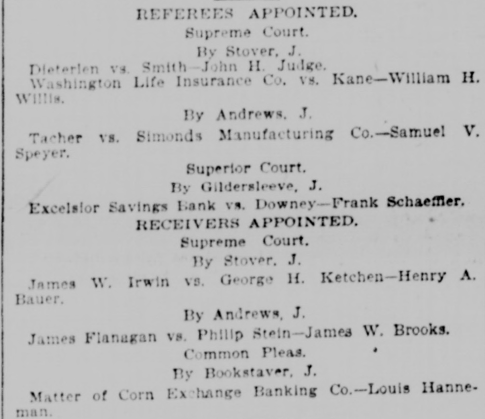 REFEREES APPOINTED. Supreme Court. By Stover, J. Dieterien vs. Smith-John H. Judge. Washington Life Insurance Co. vs. Kane-William H. Willis. By Andrews. J. Tacher vs. Simonds Manufacturing Co.-Samuel V. Speyer. Superior Court. By Gildersleeve, J. Excelsior Savings Bank vs. Downey-Frank Schaeffier. RECEIVERS APPOINTED. Supreme Court. By Stover. J. James W. Irwin vs. George H. Ketchen-Henry A. Bauer. By Andrews, J. James Flanagan vs. Philip Stein-James W. Brooks. @ Common Pleas. By Bookstaver, J. Matter of Corn Exchange Banking Co.-Louis Hanneman.